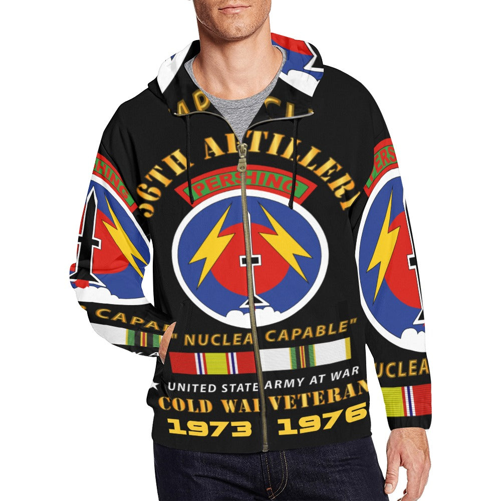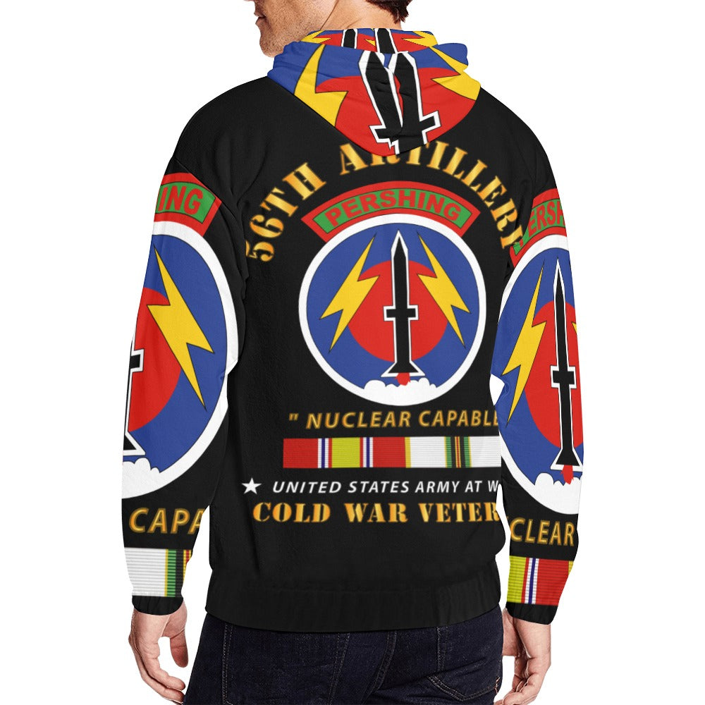 Commemorate the elite Cold War warriors of the 56th Artillery with this premium all-over print full zip hoodie. Featuring authentic service medals and the iconic Pershing missile system design, this piece tells the story of those who stood ready during one of history's most critical eras.