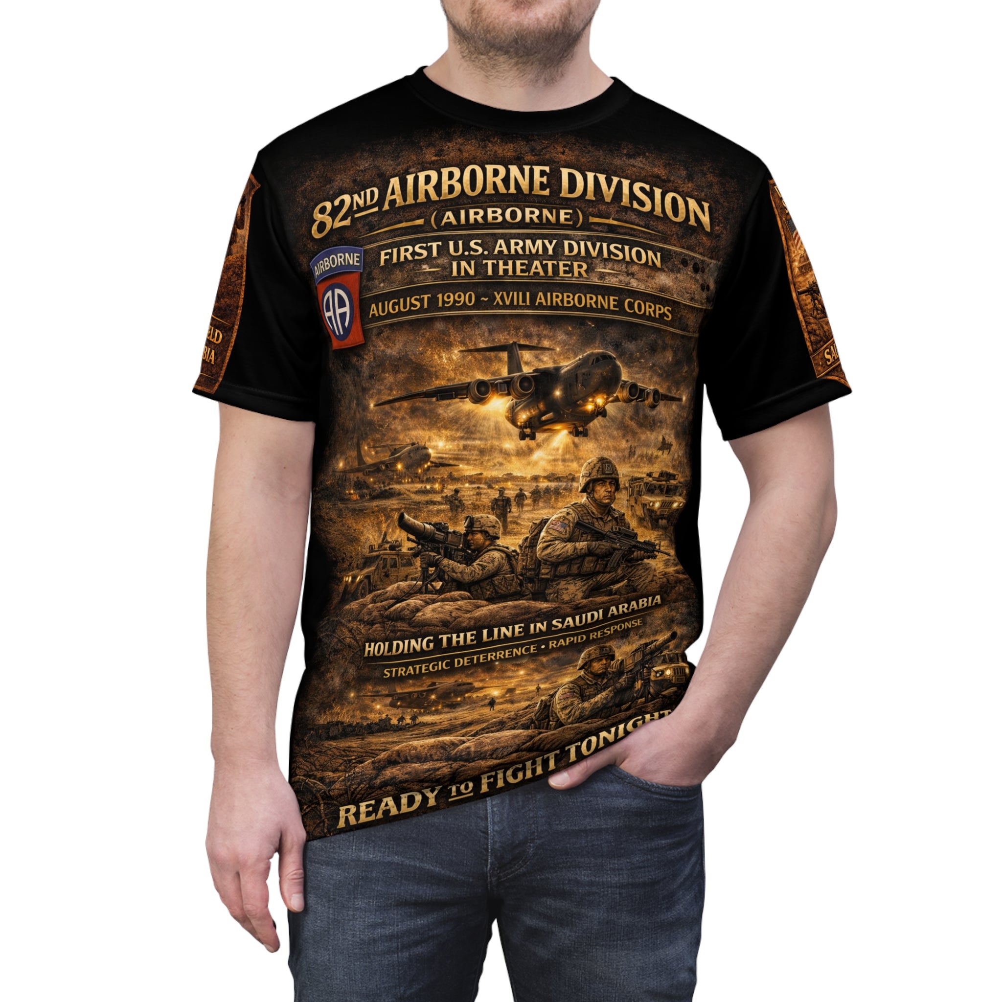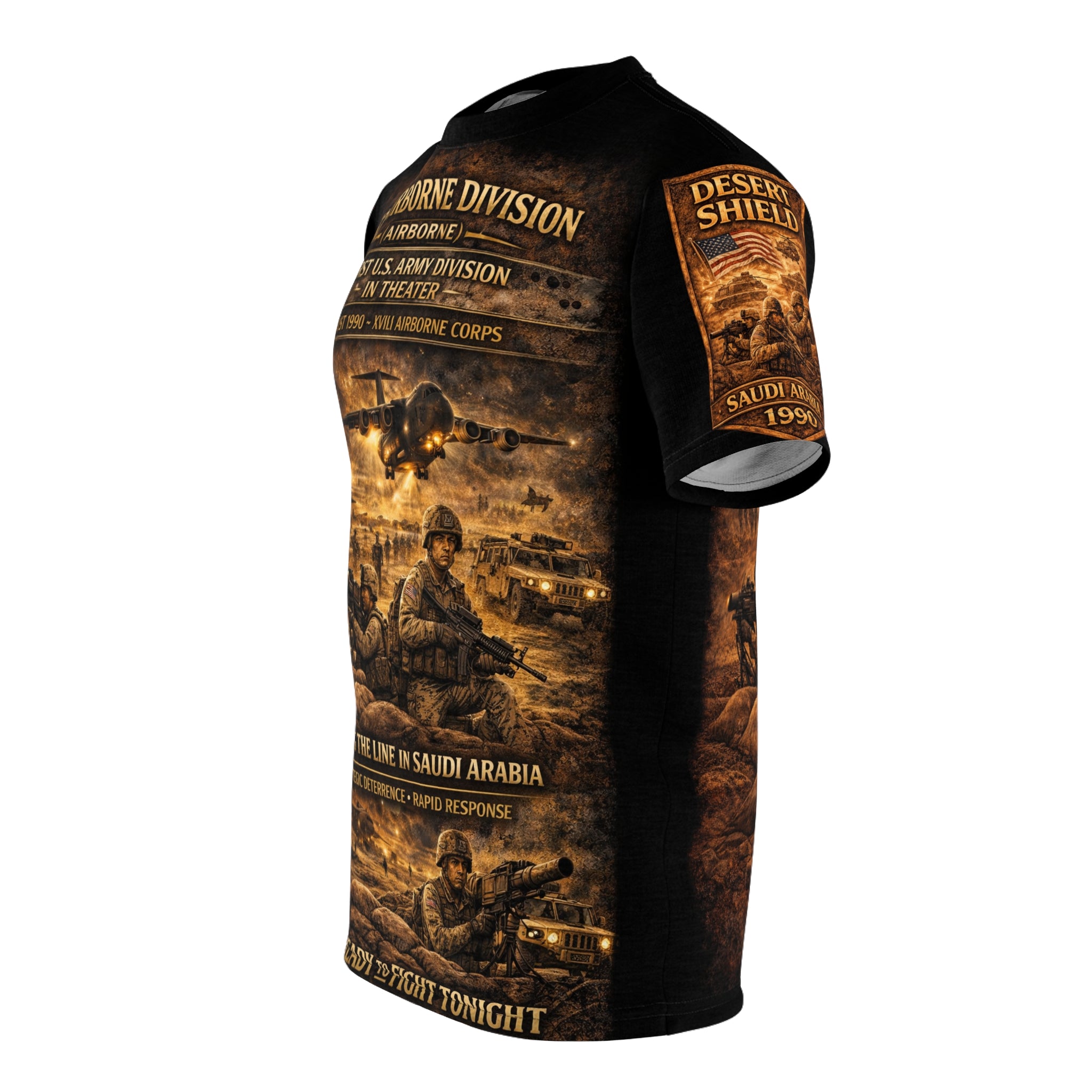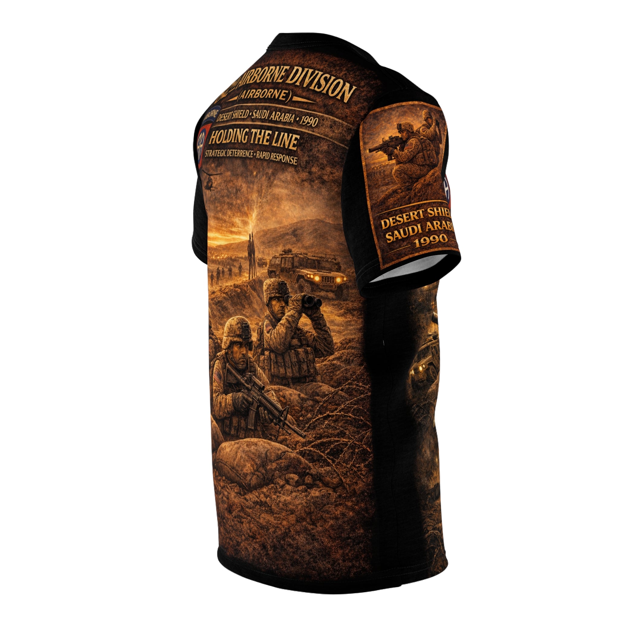 This tee is a quiet salute stitched into everyday wear — a tribute to the 82nd Airborne Division and their role in Operation Desert Shield. Lightweight yet durable polyester holds a sharp, all-over print that evokes sunbaked sand and long desert horizons. Wear it to remember service, to start conversations, or to carry a piece of that history into the present. The cut is straightforward and familiar, sitting comfortably for long days, while reinforced seams and shoulder tape keep the shape steady through wear and washes. It reads like a memory: grounded, respectful, and built to last.