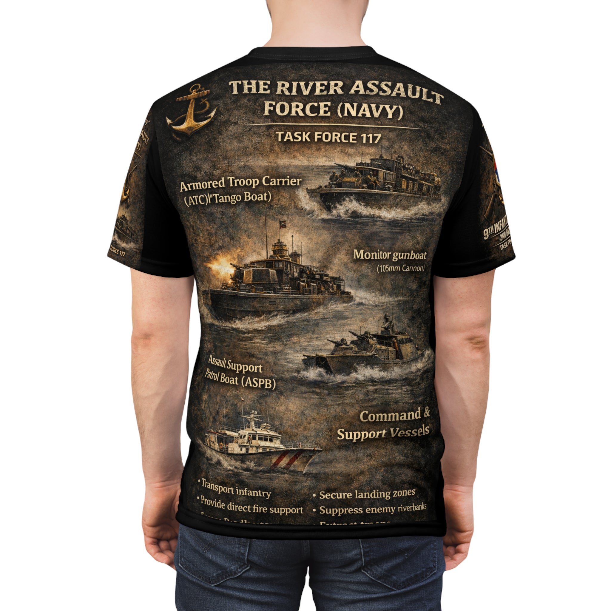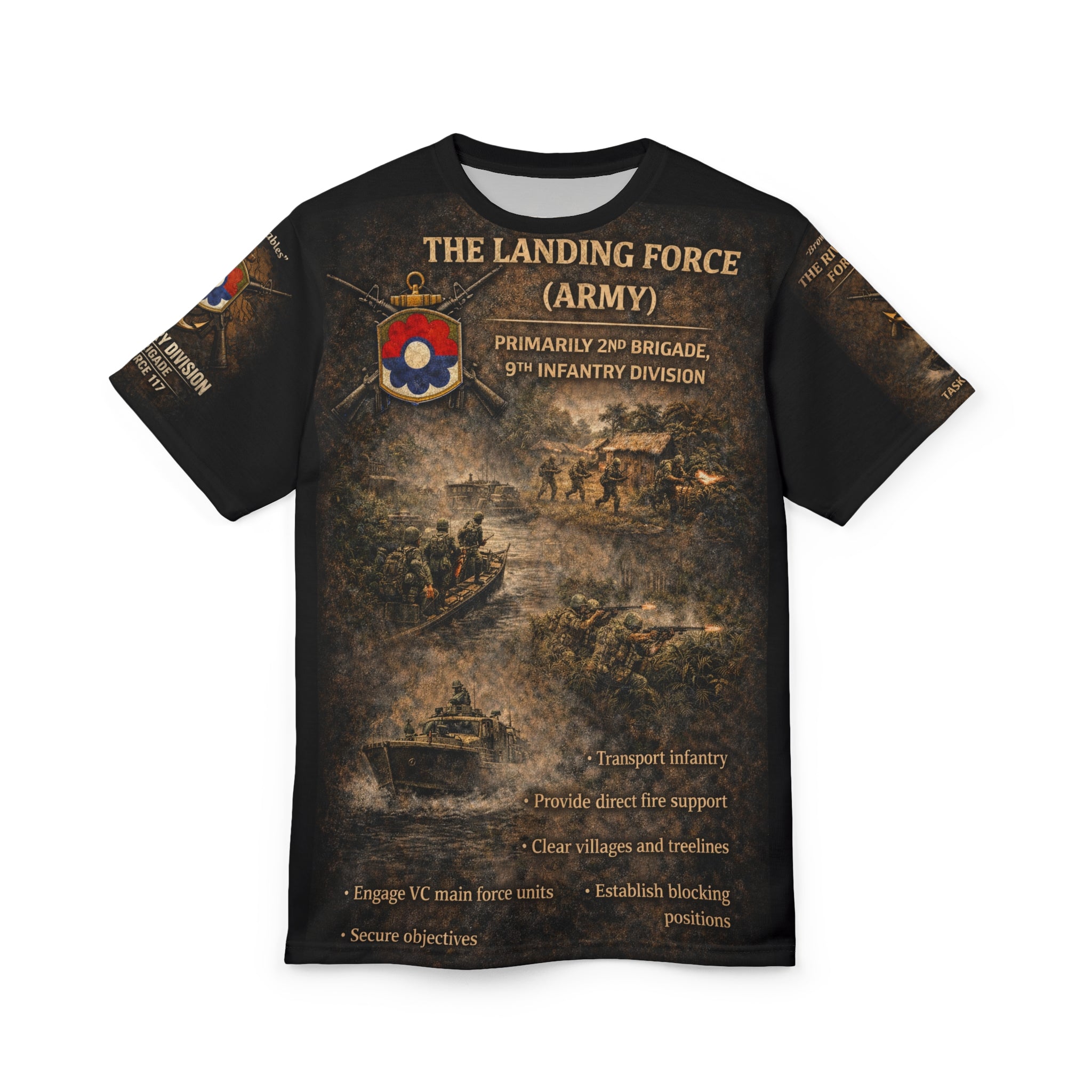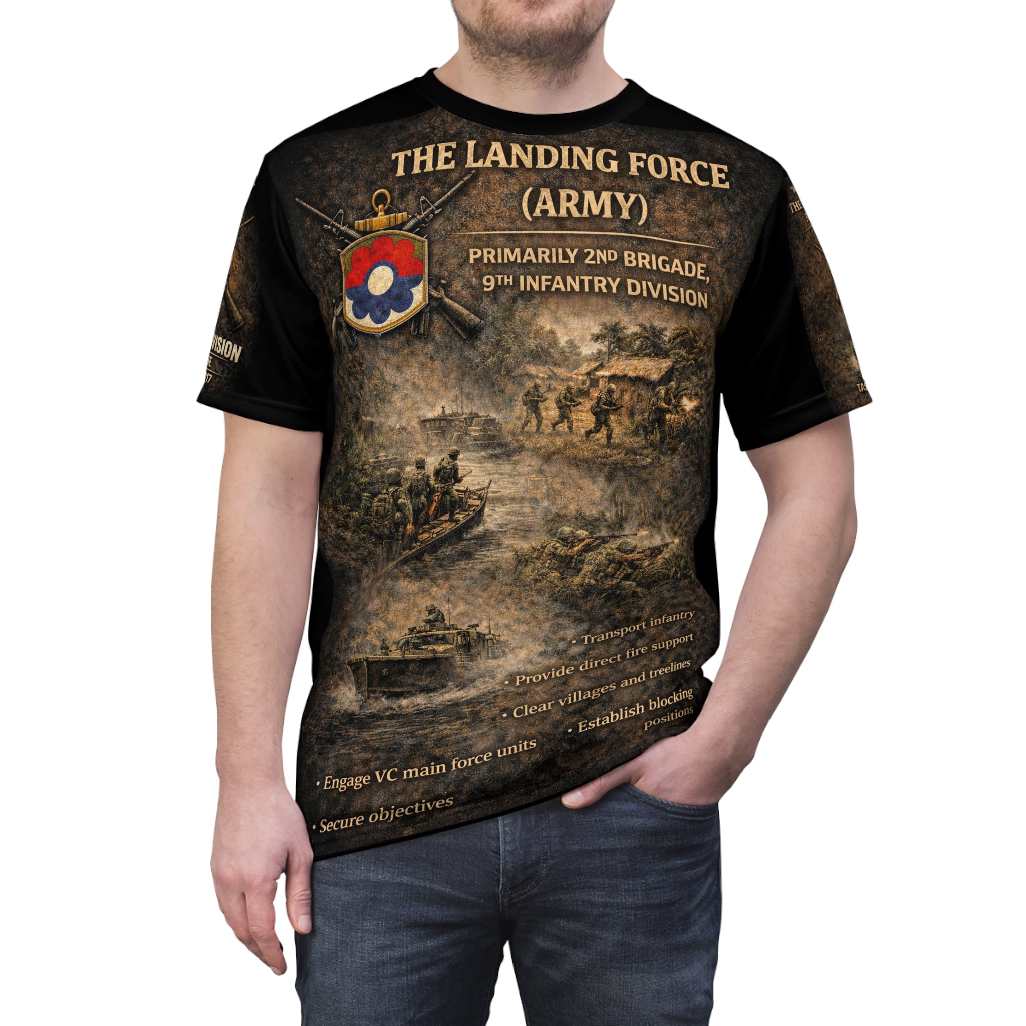 This premium all-over print tee honors the 9th Infantry Division's critical assault and landing operations during the Vietnam War. The design wraps the entire garment in a layered mosaic of authentic unit insignia and historic motifs, creating a wearable memorial that carries the weight of service and sacrifice across every inch of fabric.