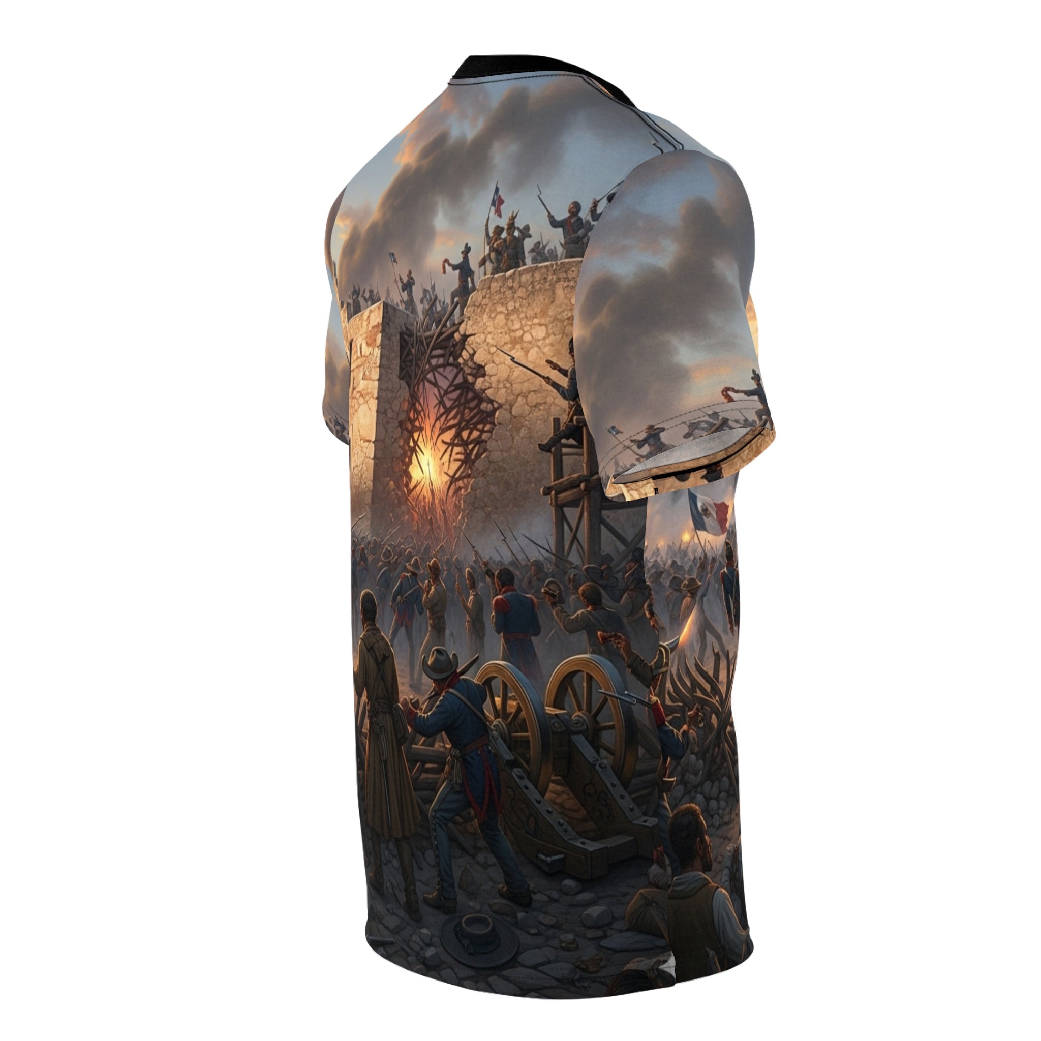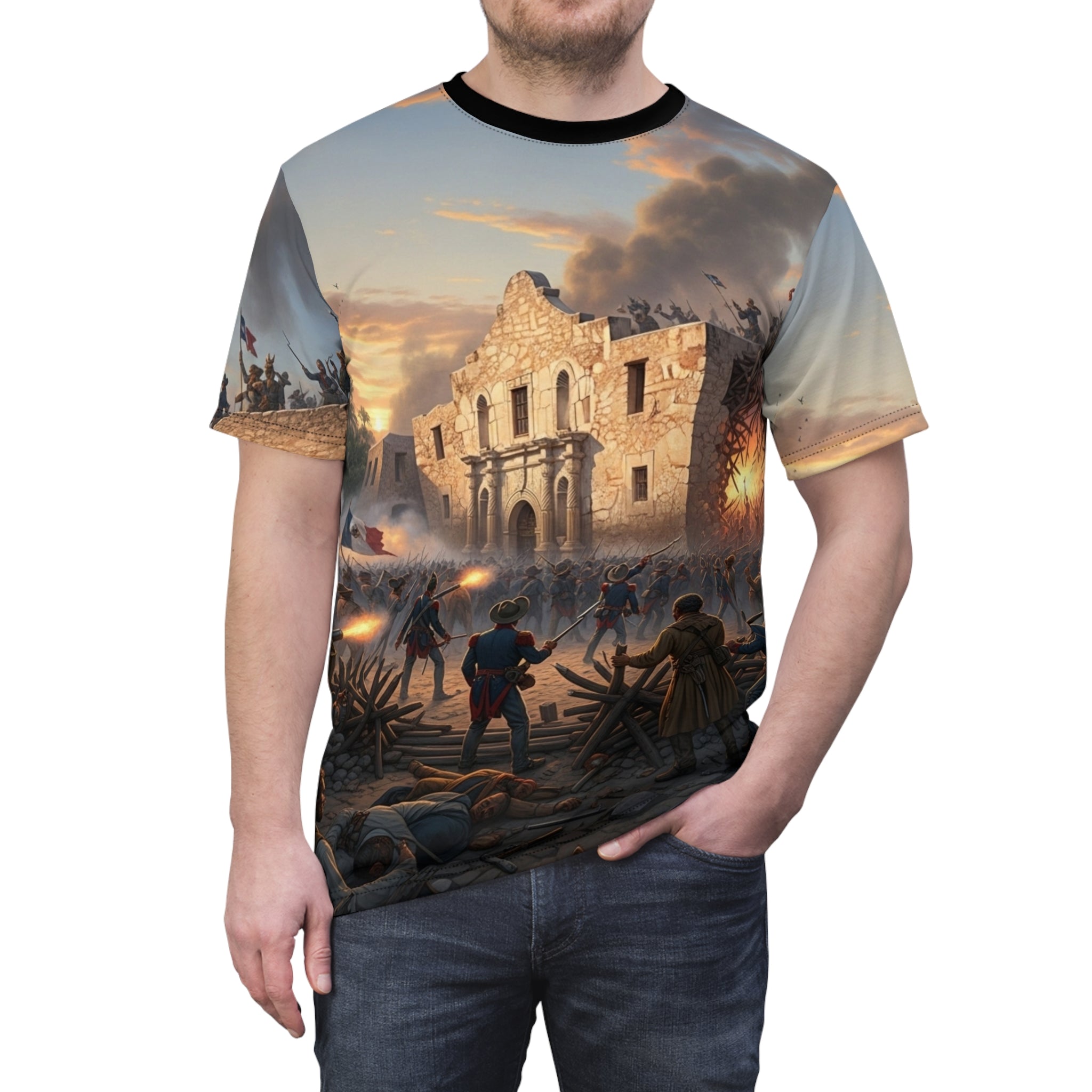 This AOP Unisex Tee featuring the AOP Unisex Tee - Battle of the Alamo - Texas Independence is perfect for history enthusiasts and patriotic individuals. The design gives a vintage and historical vibe, making it ideal for American history buffs and those who appreciate military-themed apparel. This tee is great for Memorial Day, Independence Day, Veterans Day, and other patriotic celebrations.