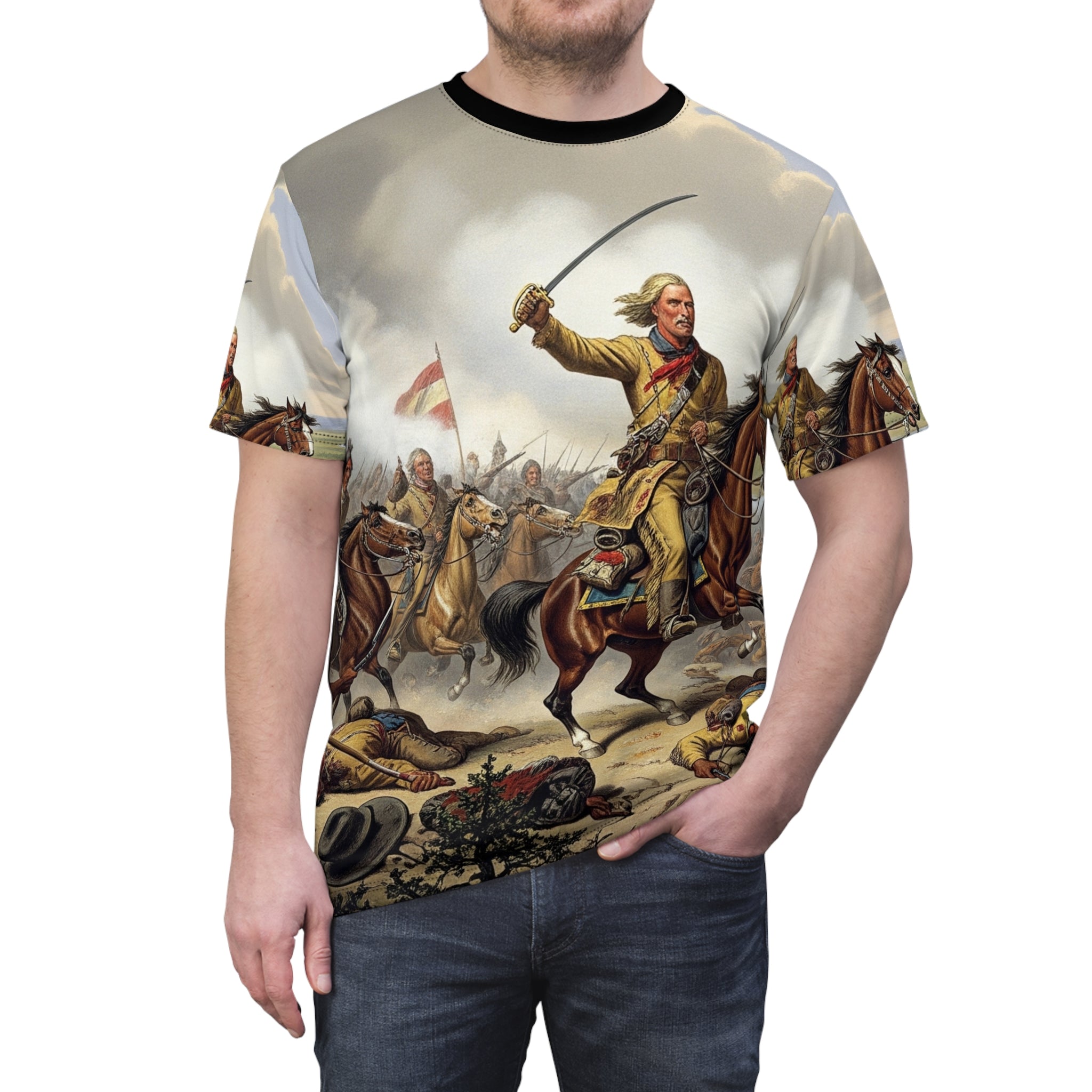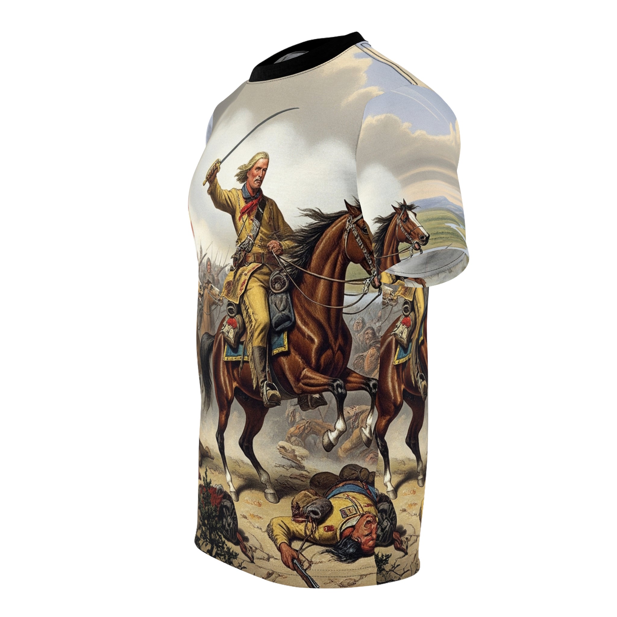 This Unisex Tee features a unique all-over print design of General Custer at the Battle of Little Bighorn. Made of 100% Polyester, this tee is strong, durable and quick-drying, perfect for those who enjoy historical themes and unique designs. Ideal for those who appreciate Americana and western culture. Great for casual wear or themed events related to cowboys, Indians, or historical reenactments.