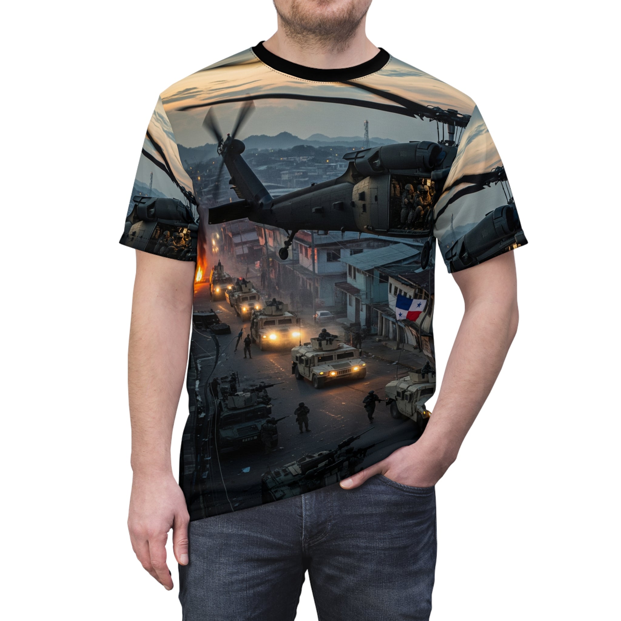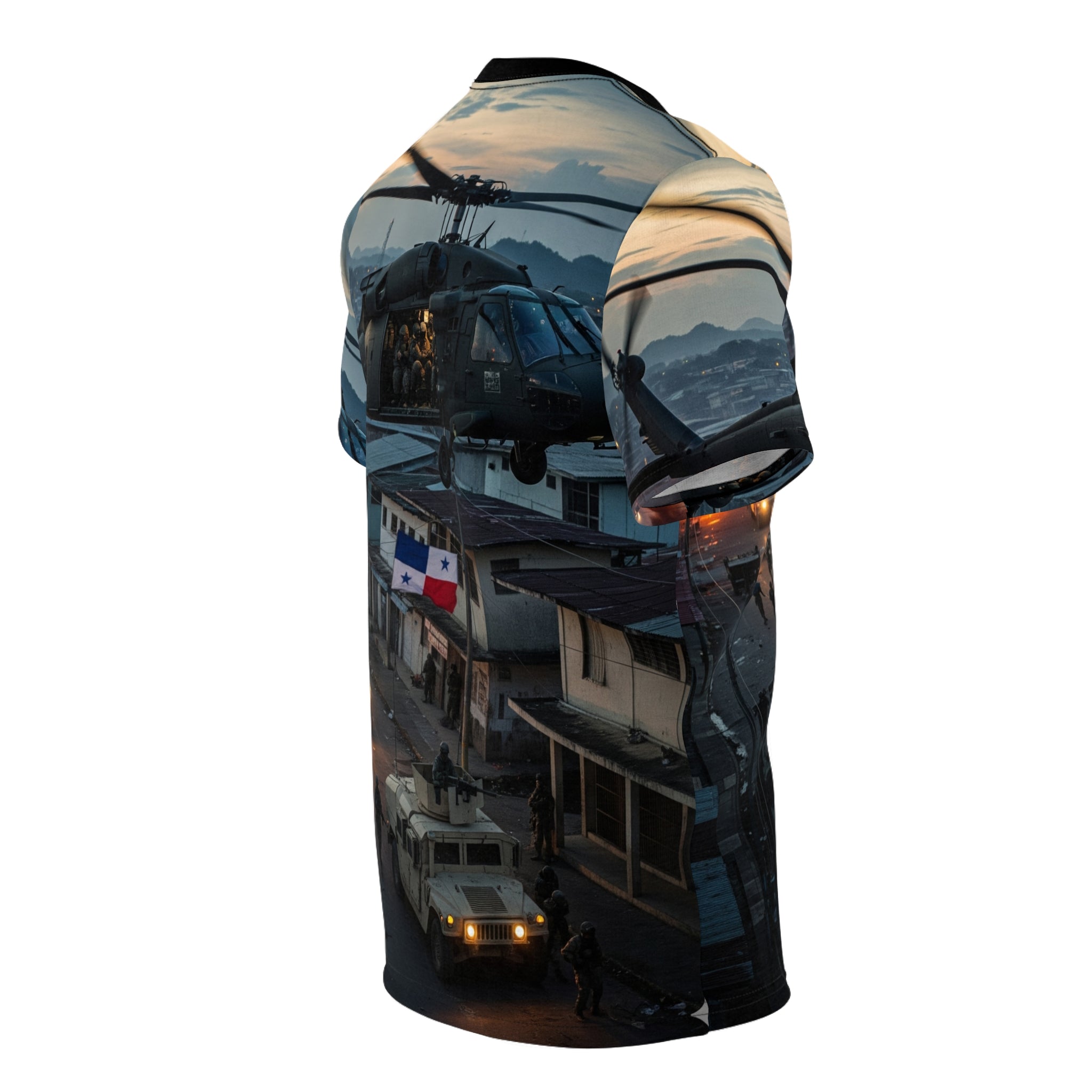 This Unisex Tee features a unique all-over print design of AOP Unisex Tee - Invasion of Panama, Operation Just Cause. Made of 100% Polyester, this tee is strong, durable and quick-drying, perfect for those who enjoy historical themes and unique designs. Ideal for those who appreciate Americana and western culture. Great for casual wear or themed events related to cowboys, Indians, or historical reenactments.