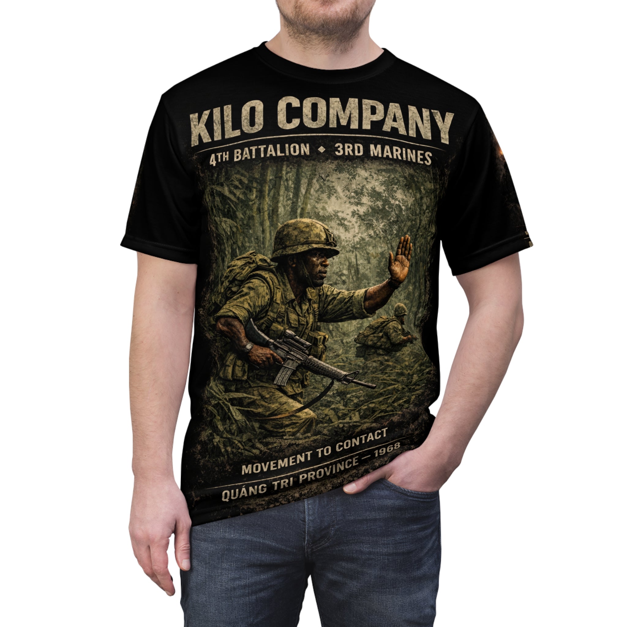 Movement to Contact—a tribute tee that carries quiet weight and unwavering respect. This all-over-print shirt honors 2nd Platoon, Kilo Company with military precision and understated pride. It wears like a memory: light, resilient, and built to move with you through long days, training runs, unit reunions, and the low-key gatherings where old squad mates trade stories and honor shared sacrifice.