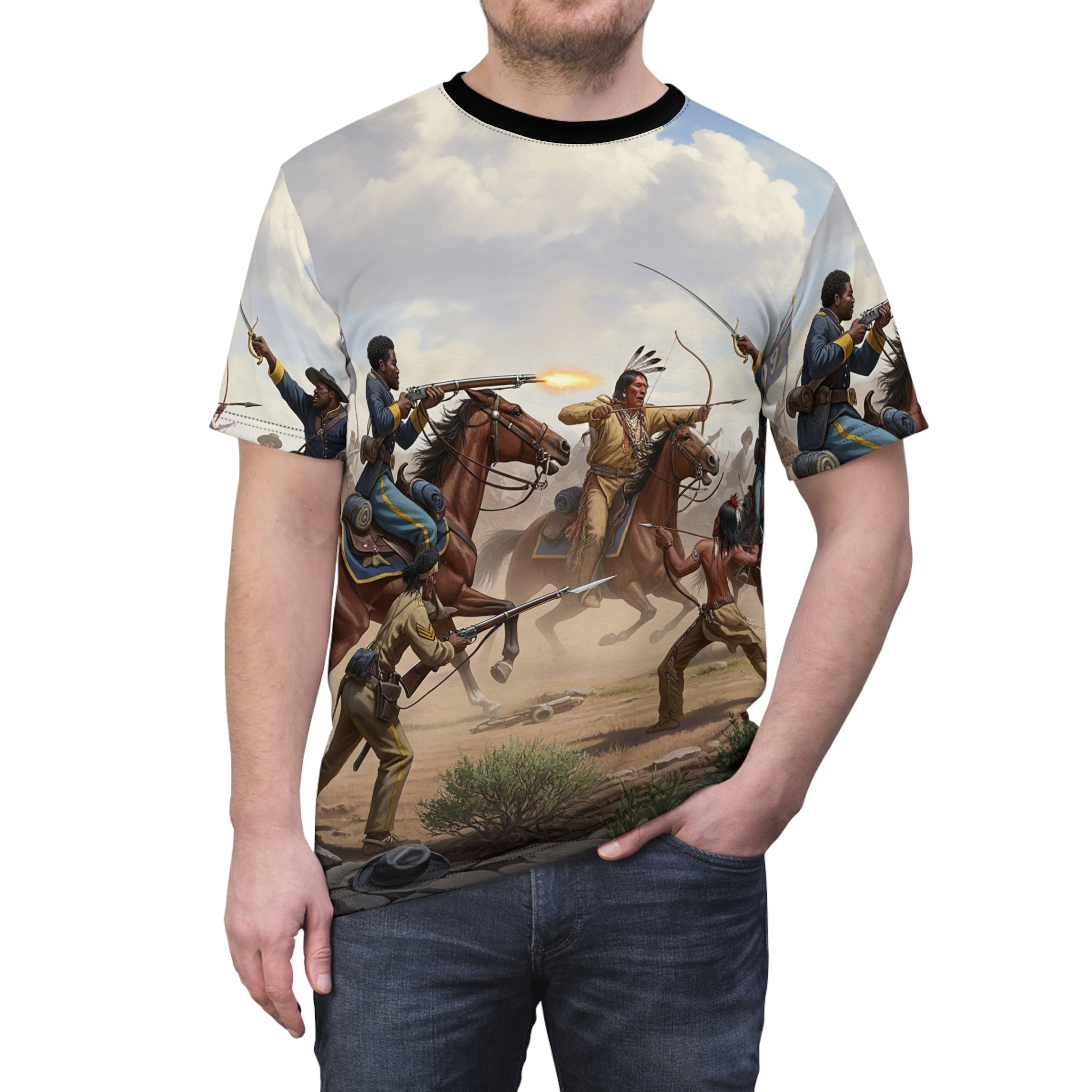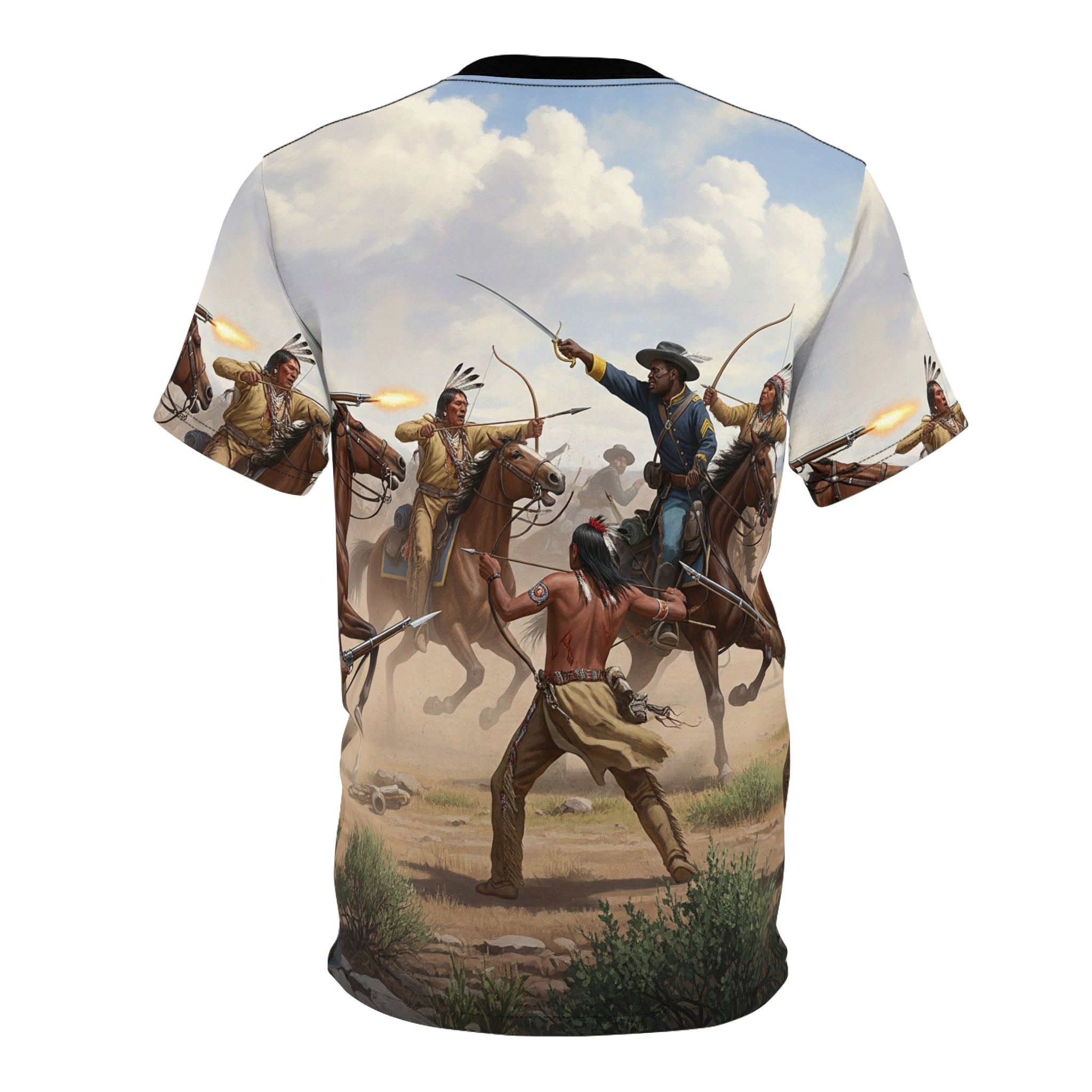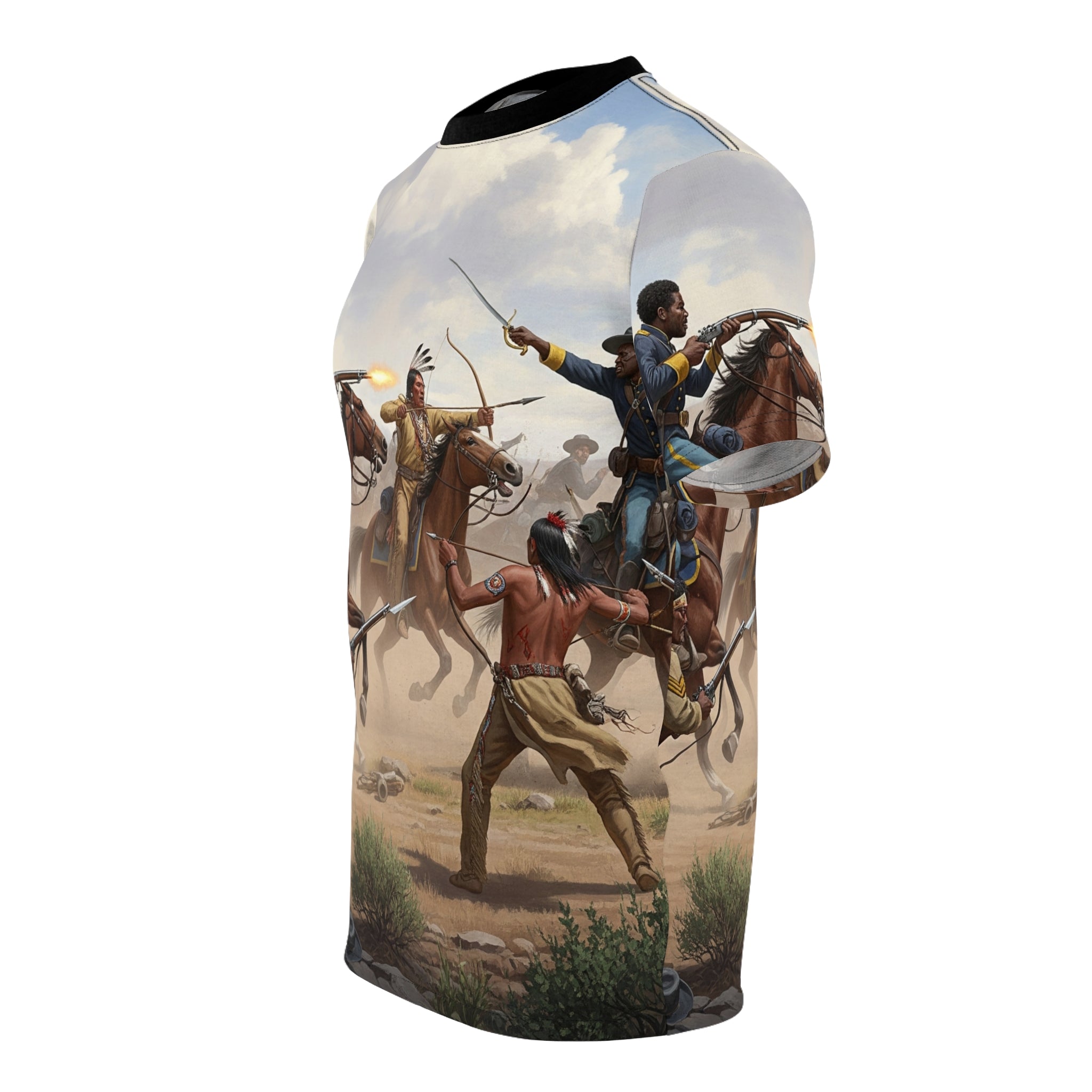 This Unisex Tee features a full print design depicting the 9th Cavalry Regiment fighting Native Americans during the Indian Wars. The tee provides a historical and adventurous vibe, perfect for history buffs, military enthusiasts, and anyone interested in American history. Ideal for patriotic holidays, historical reenactments, and military-themed events.