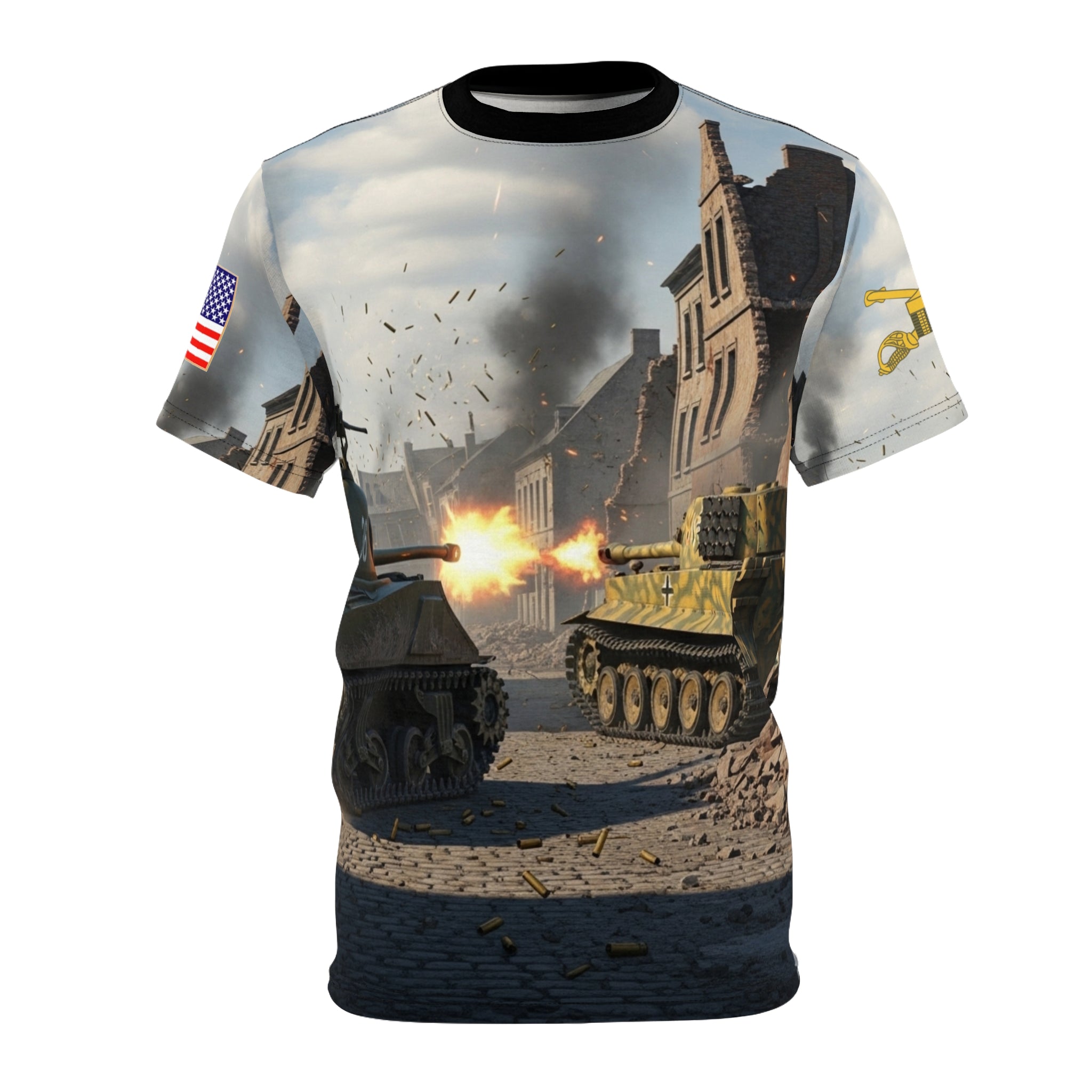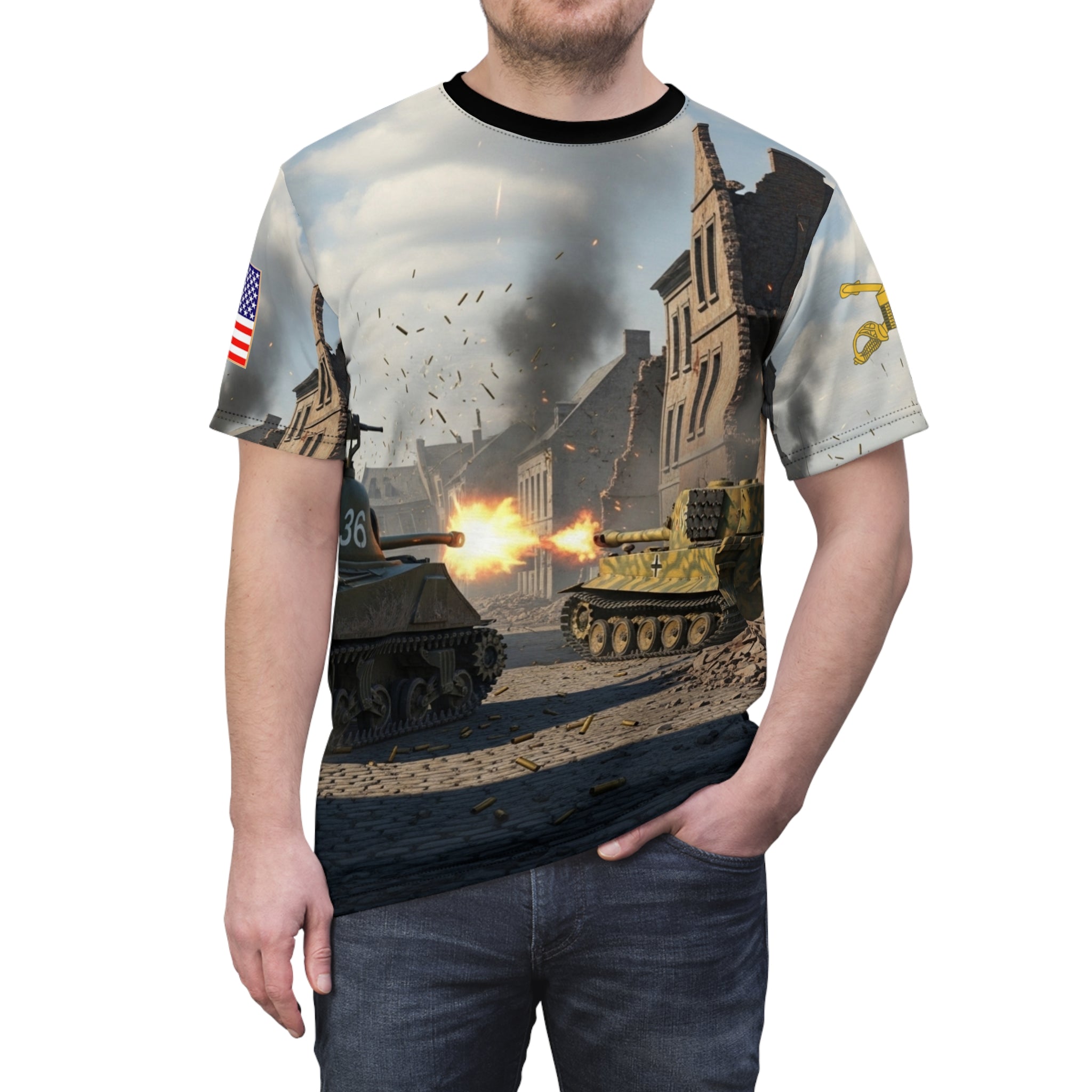 Unisex Tee - AOP Sherman Tank Battle with German Panzer Germany WWII