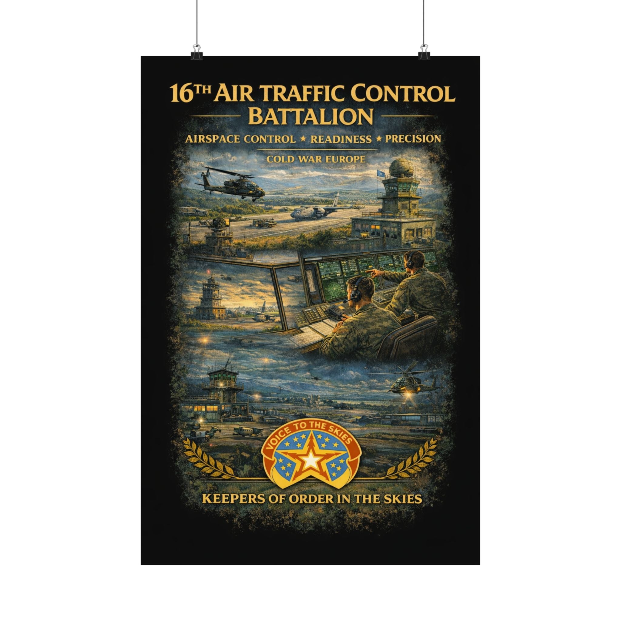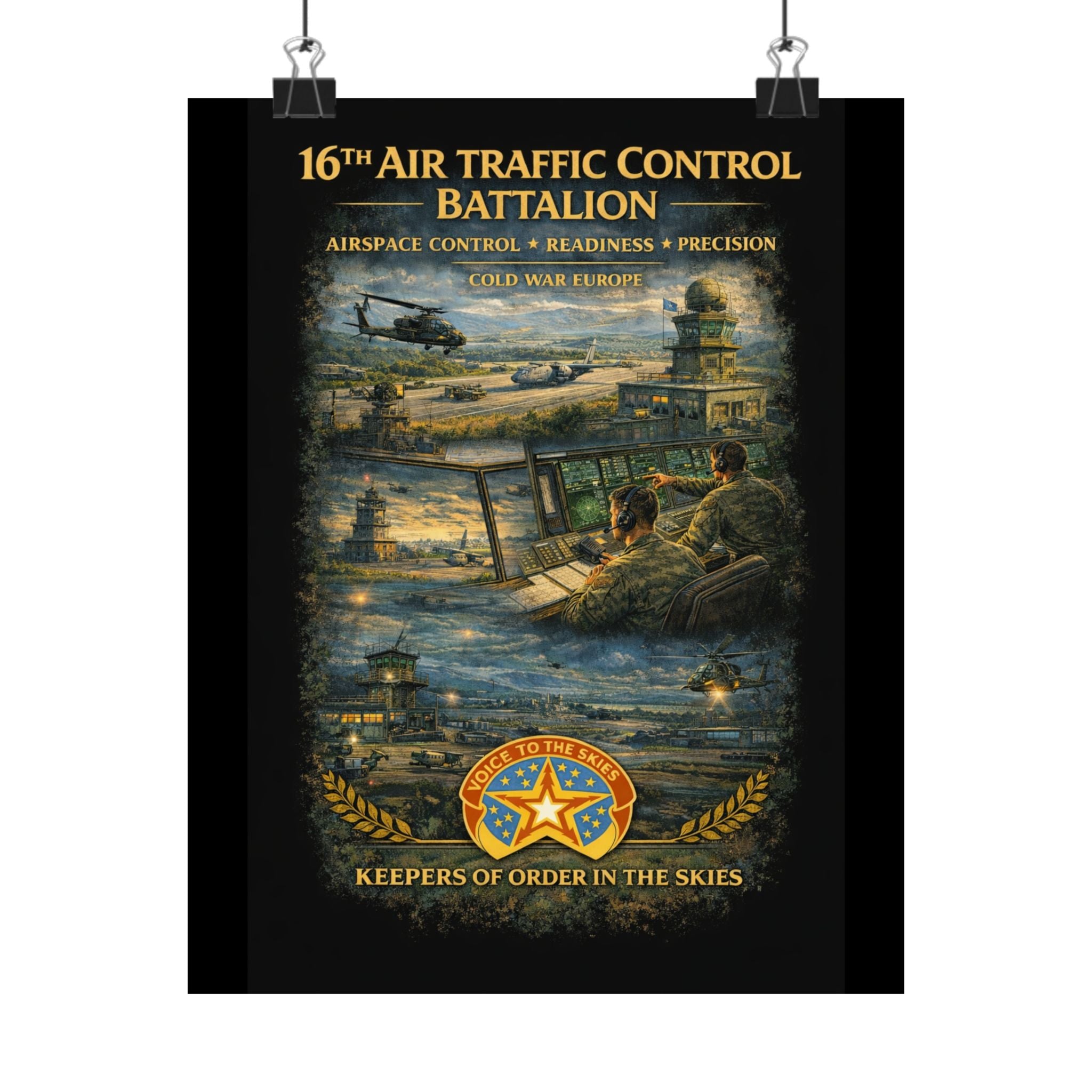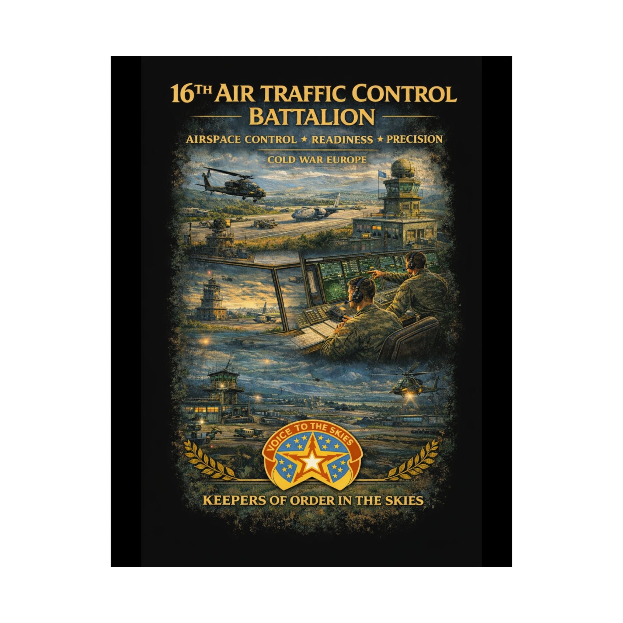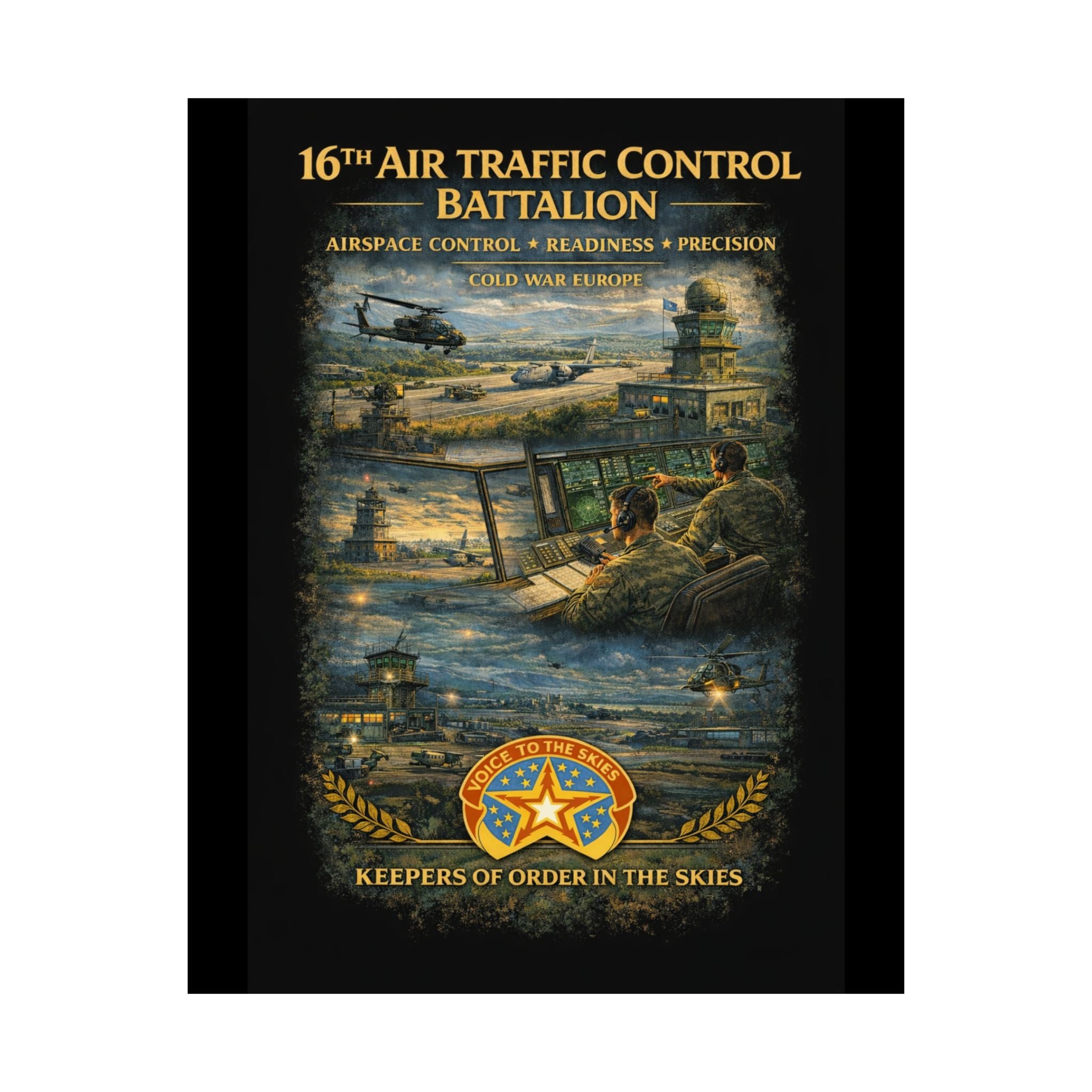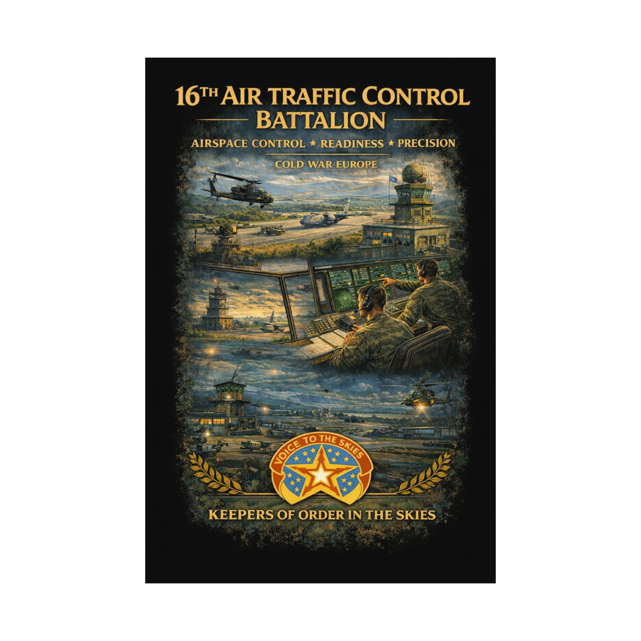 A museum-grade matte poster that honors the 16th Air Traffic Control Battalion's critical role in military aviation operations. This archival piece captures the precision and professionalism that define air traffic control—controllers managing airspace, coordinating aircraft movements, ensuring safe operations in support of ground forces. Rendered with documentary clarity and muted tones, it brings a testament to this essential support mission into your study, office, or collection space.