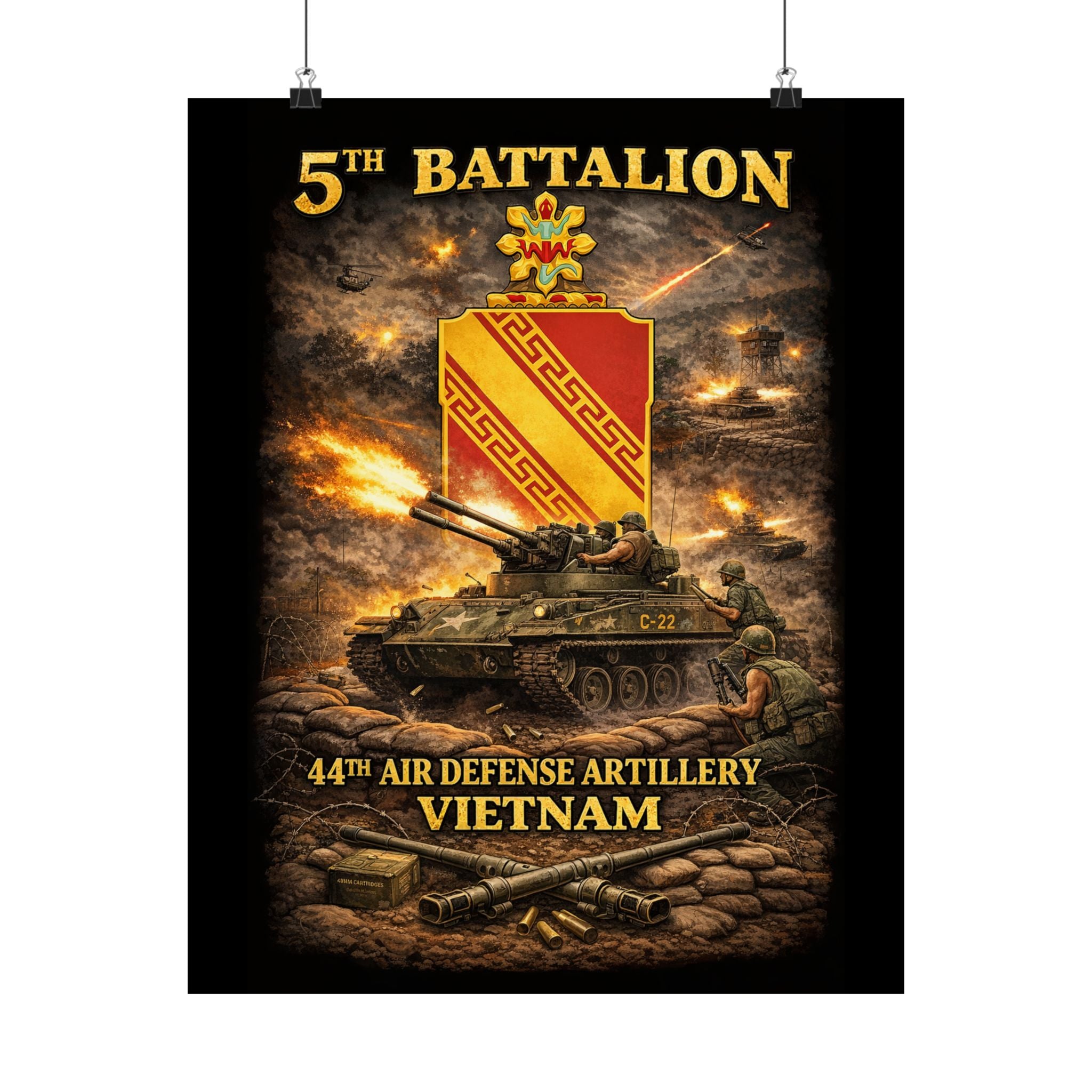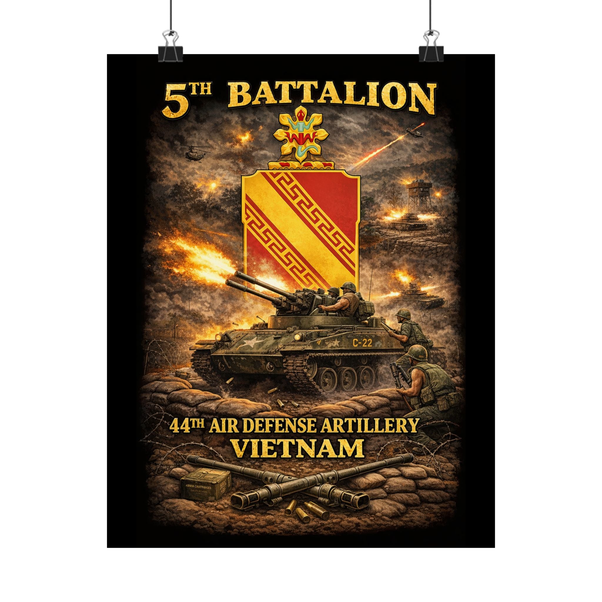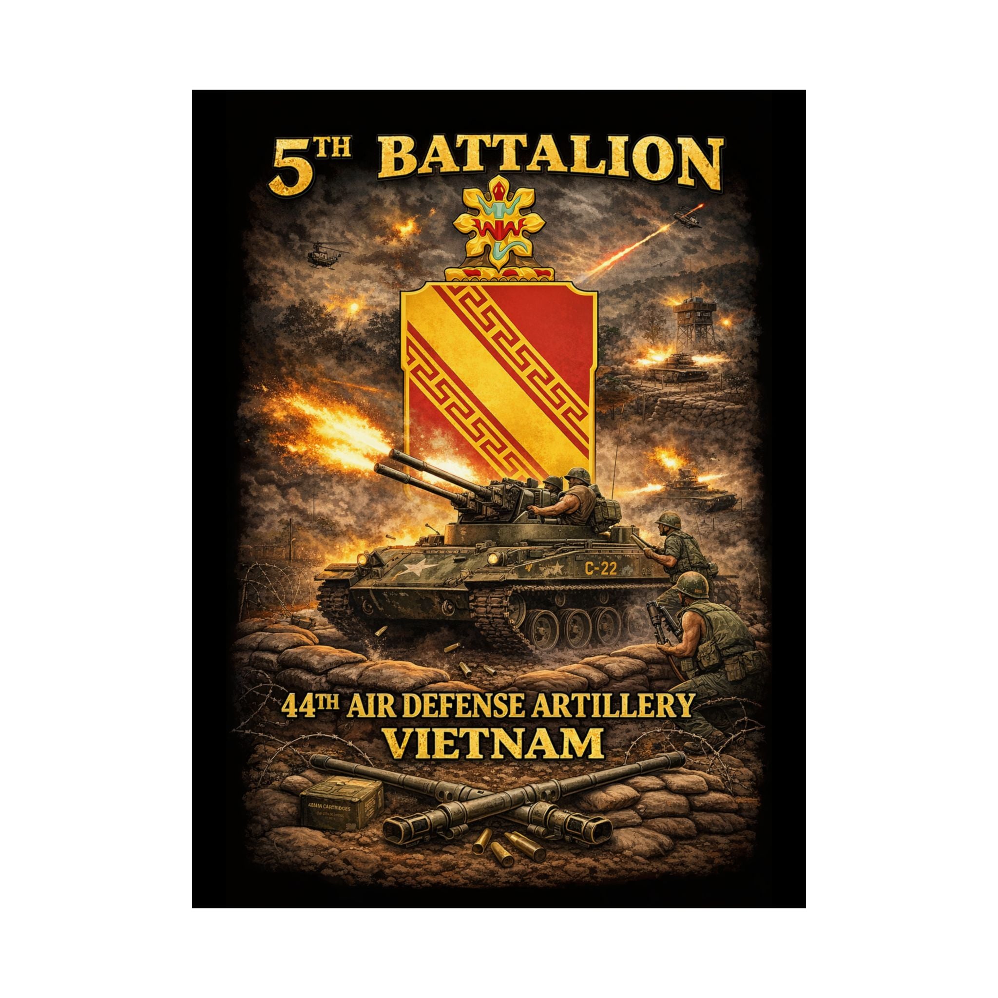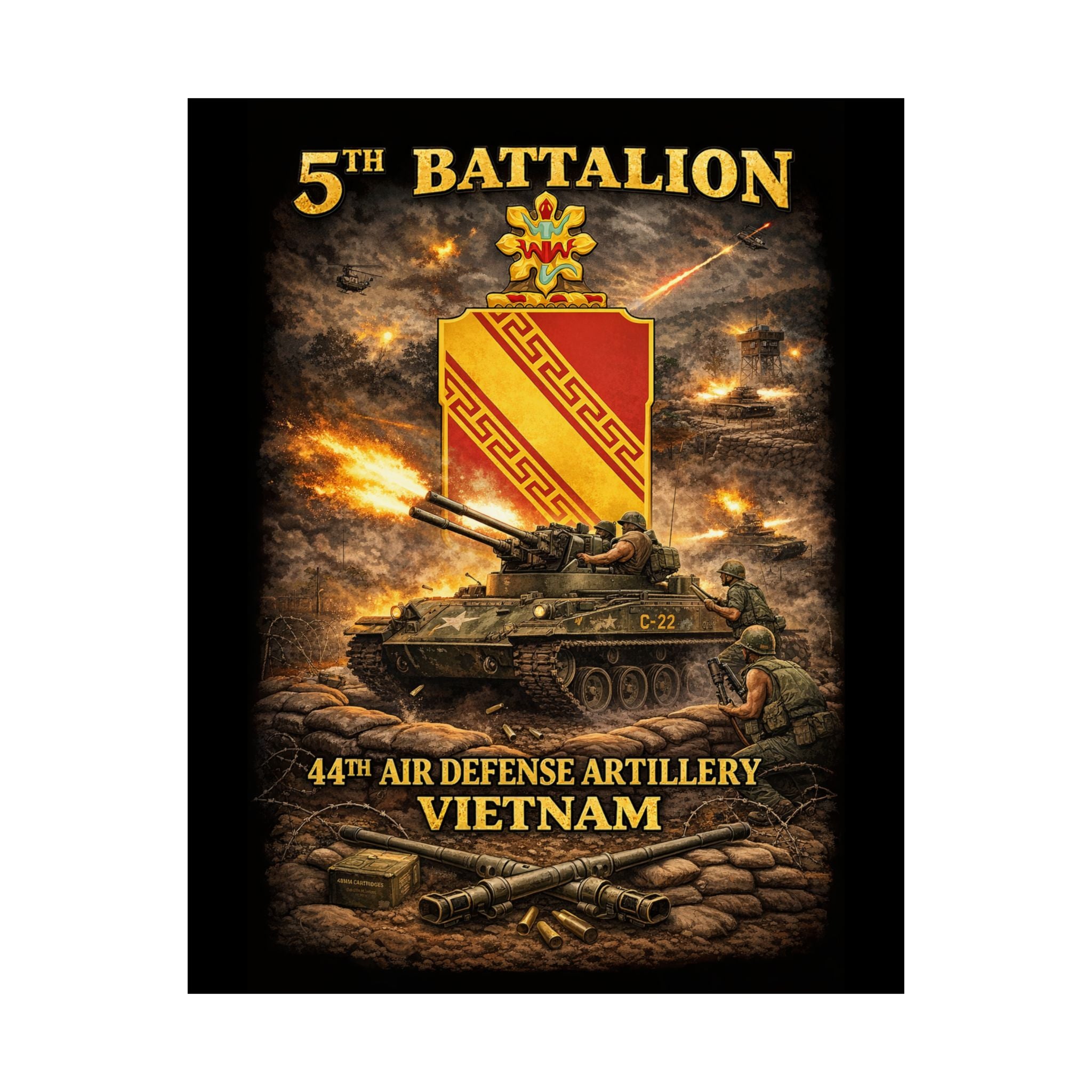 A museum-grade matte poster that honors the 5th Battalion, 44th Air Defense Artillery and their M42 "Duster" operations during the Vietnam War. This archival piece captures the versatility and firepower of these specialized units—twin 40mm guns providing base defense and convoy escort, crews maintaining vigilance against air and ground threats, the distinctive silhouette of the Duster in action. Rendered with documentary clarity and muted tones, it brings a unique chapter of American military history into your study, office, or collection space.