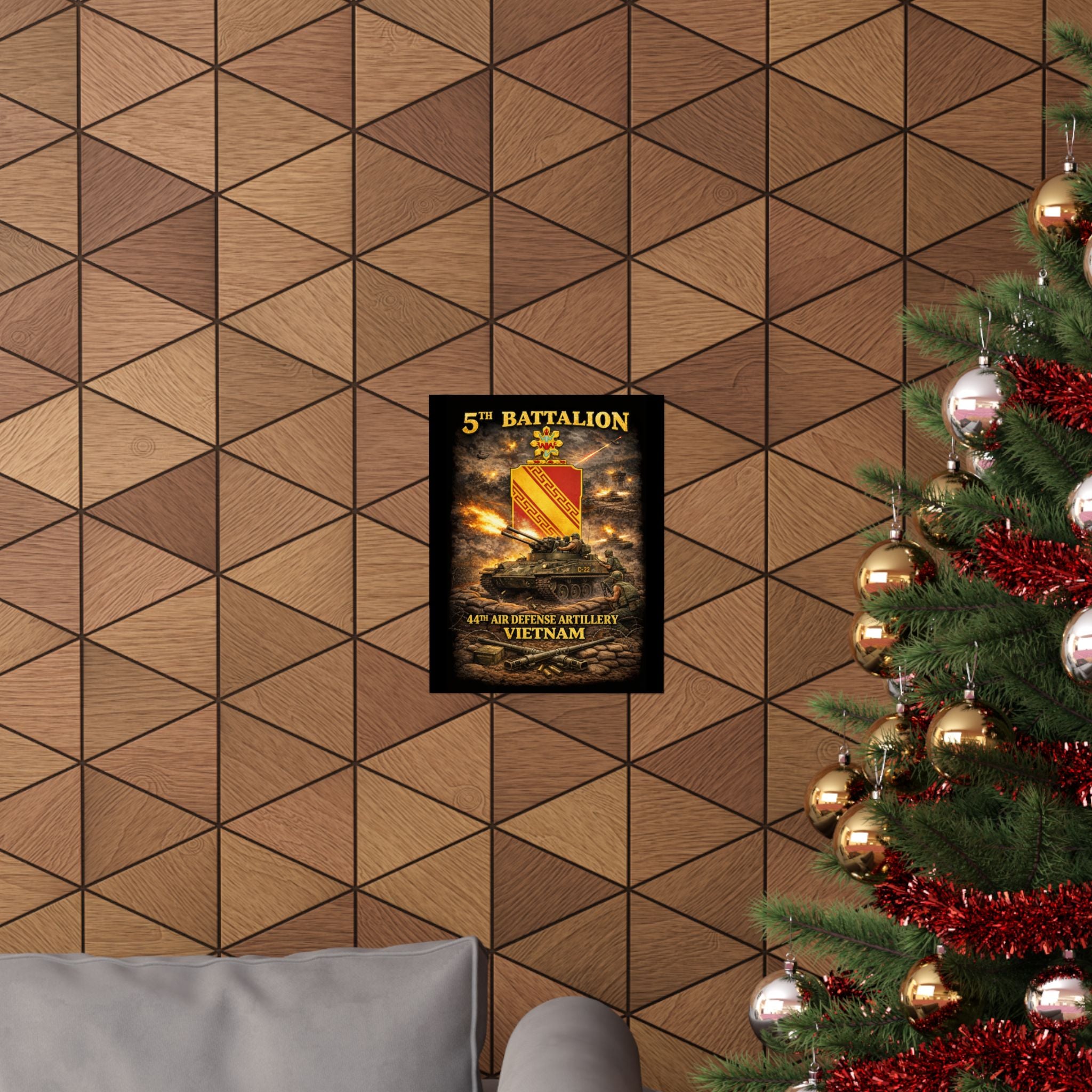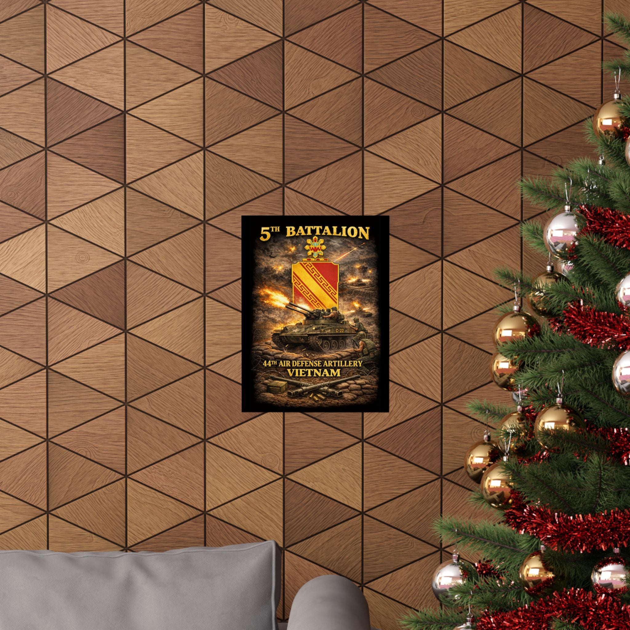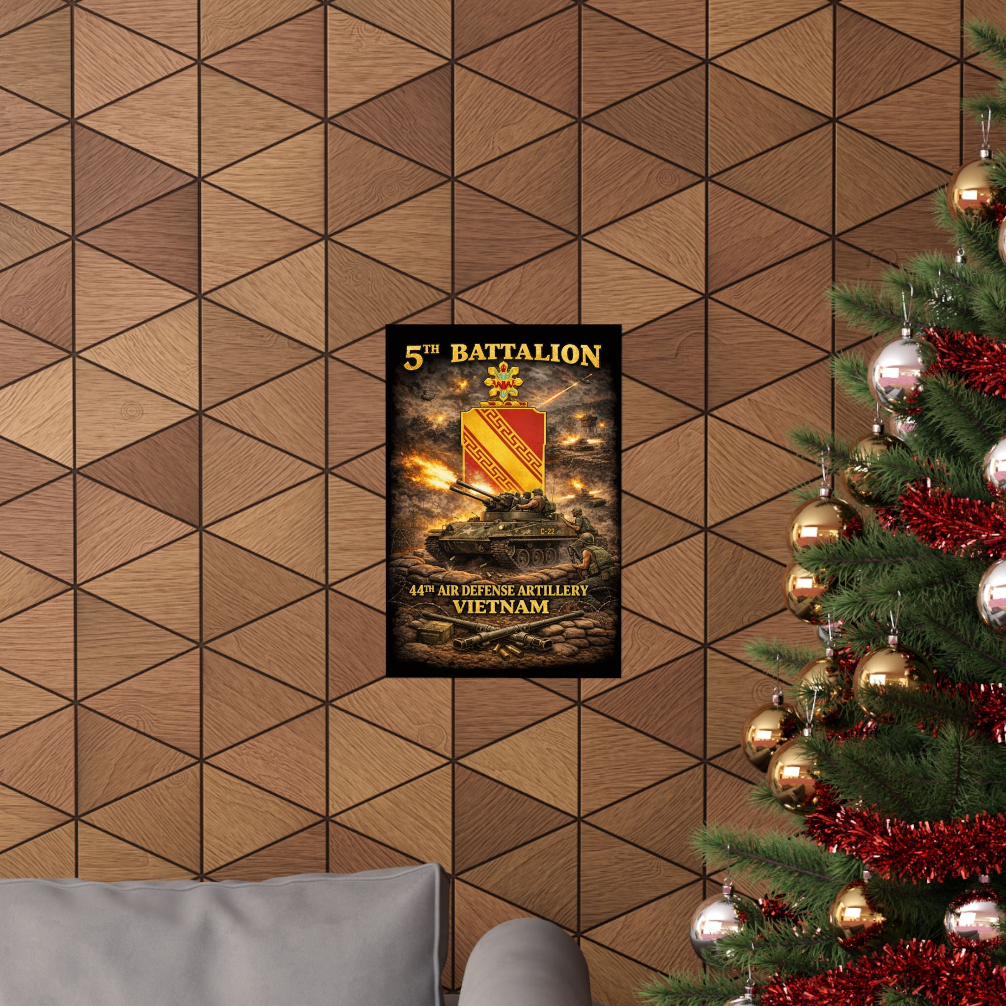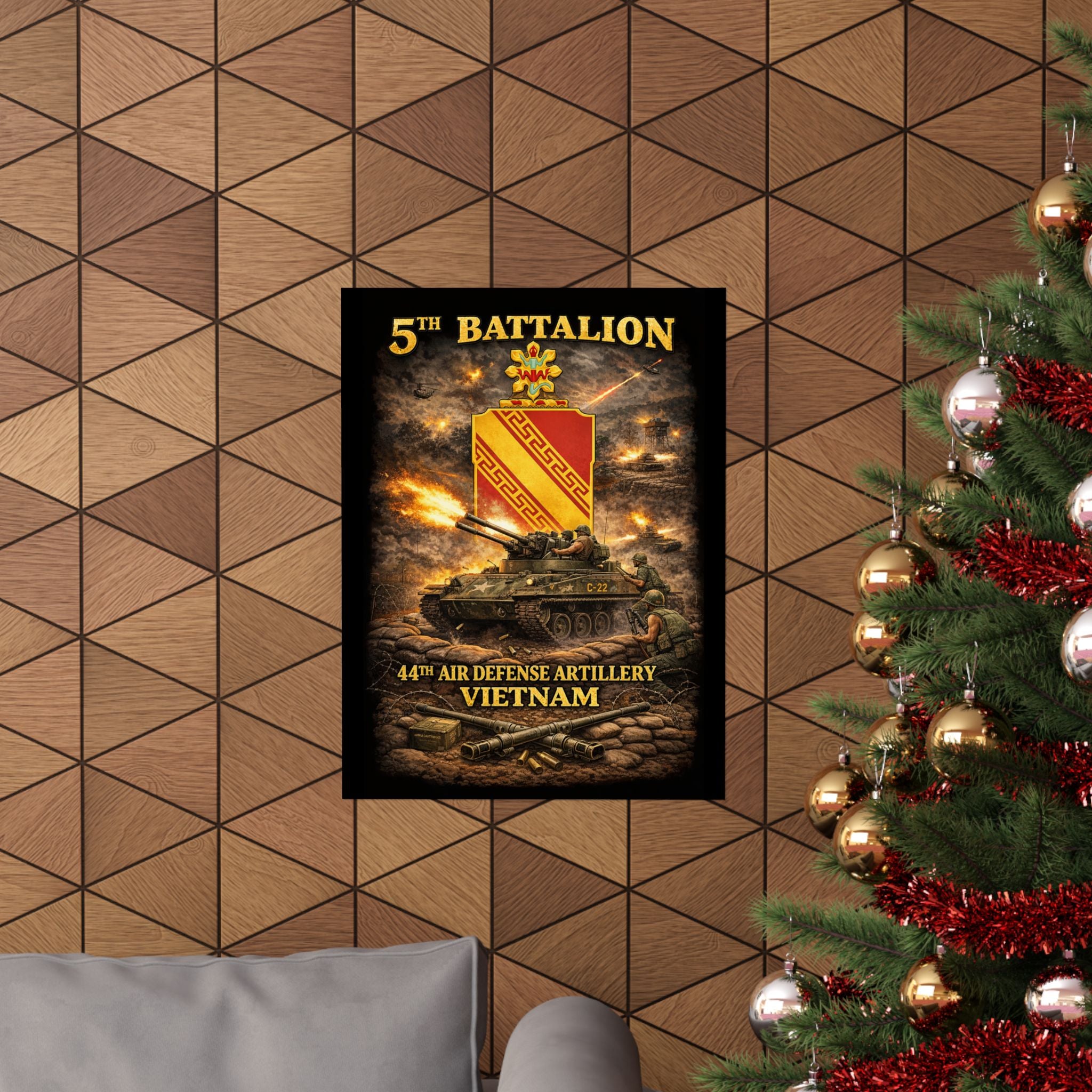 A museum-grade matte poster that honors the 5th Battalion, 44th Air Defense Artillery and their M42 "Duster" operations during the Vietnam War. This archival piece captures the versatility and firepower of these specialized units—twin 40mm guns providing base defense and convoy escort, crews maintaining vigilance against air and ground threats, the distinctive silhouette of the Duster in action. Rendered with documentary clarity and muted tones, it brings a unique chapter of American military history into your study, office, or collection space.