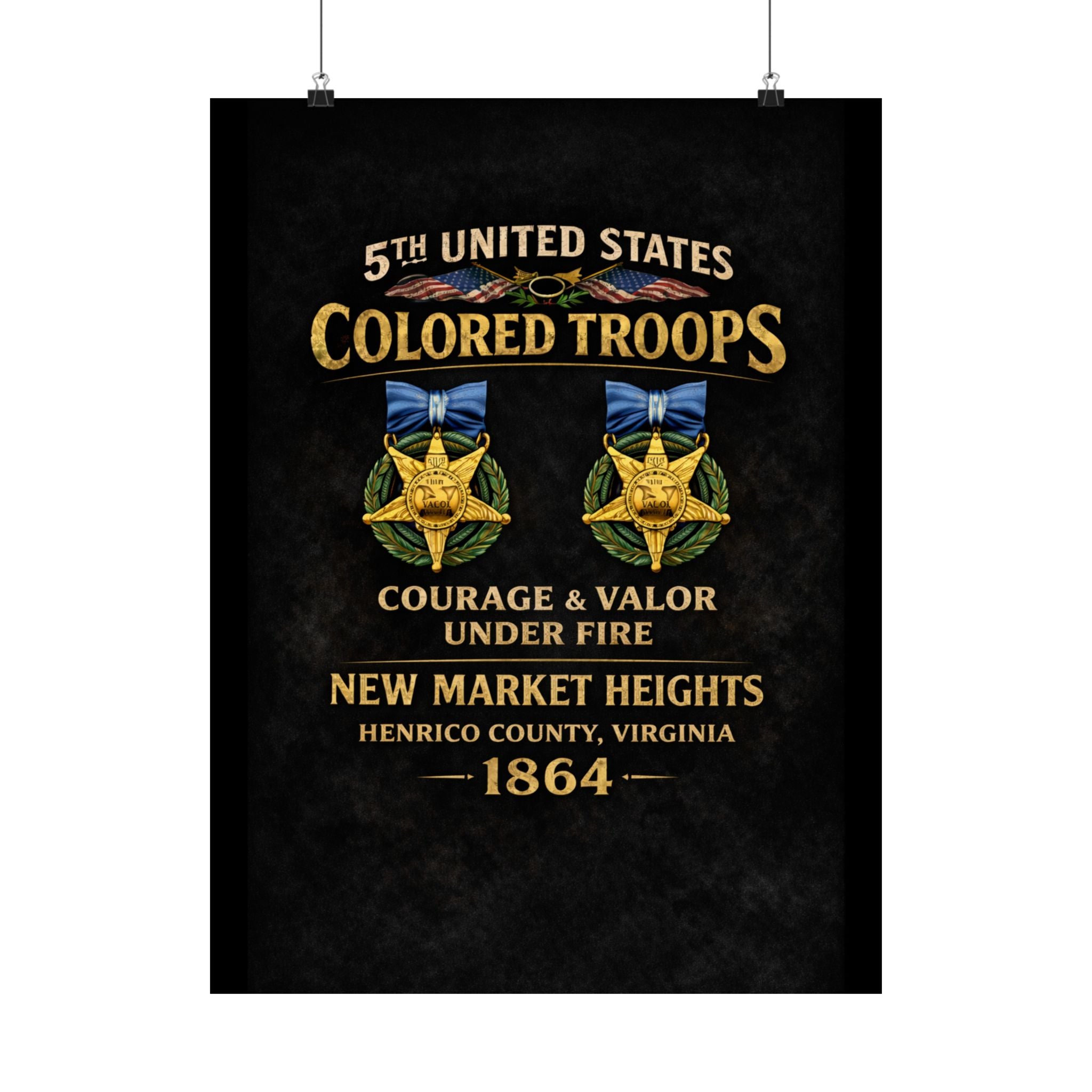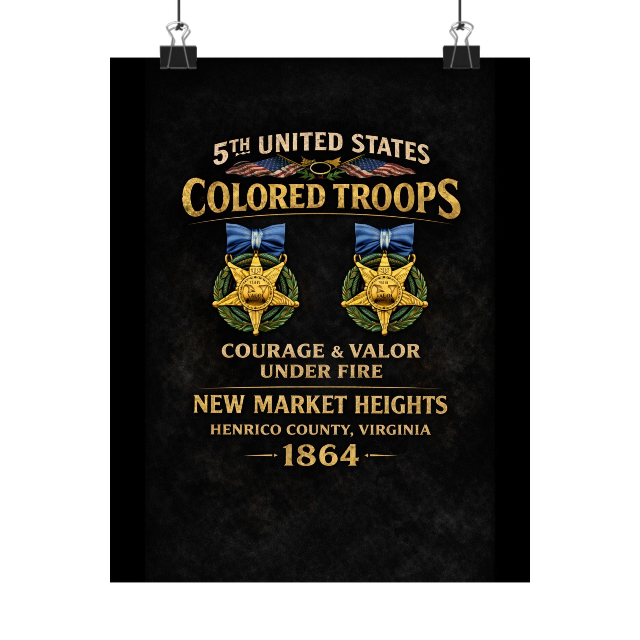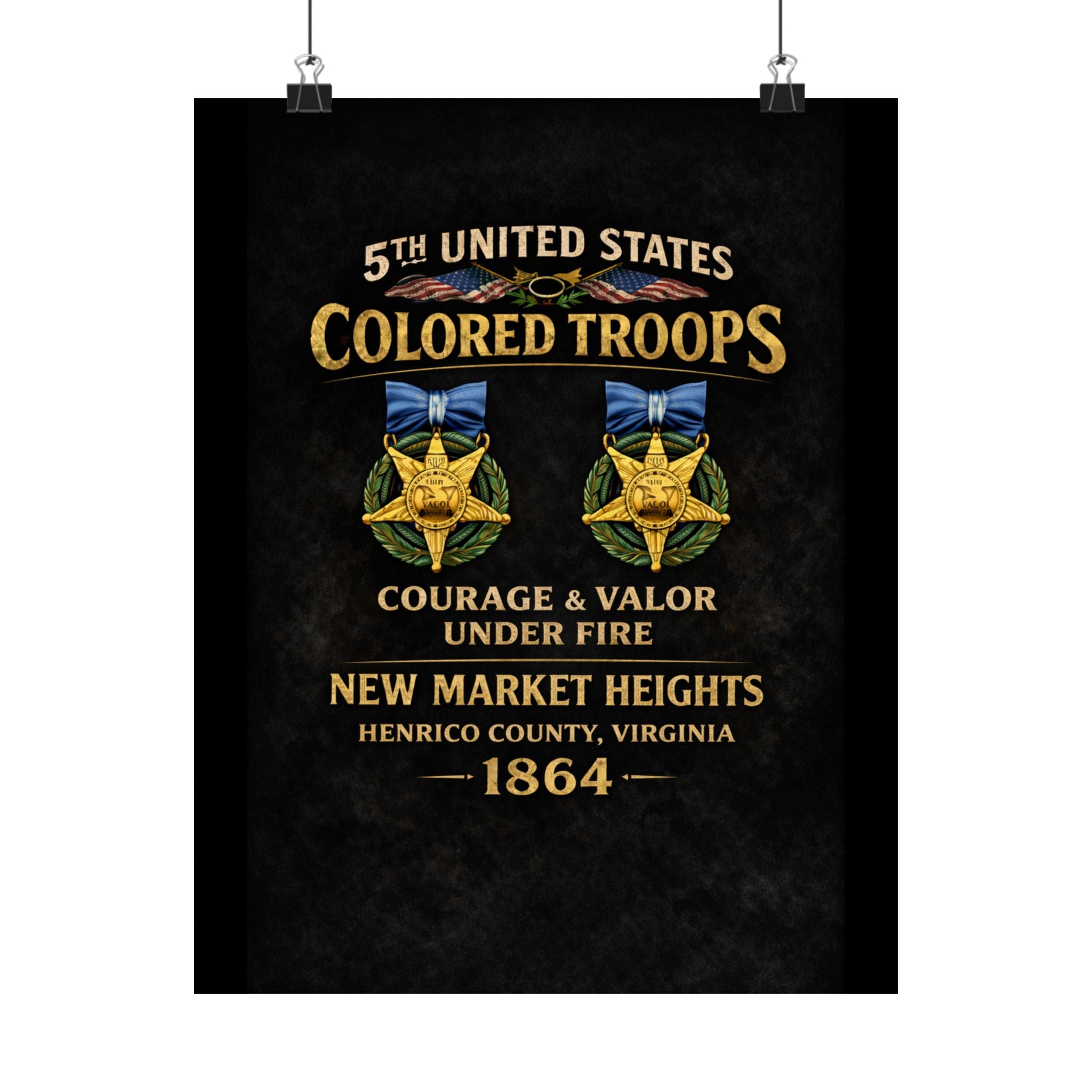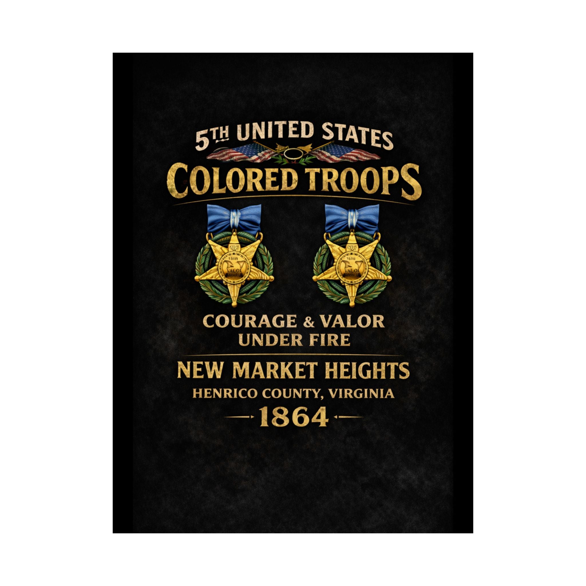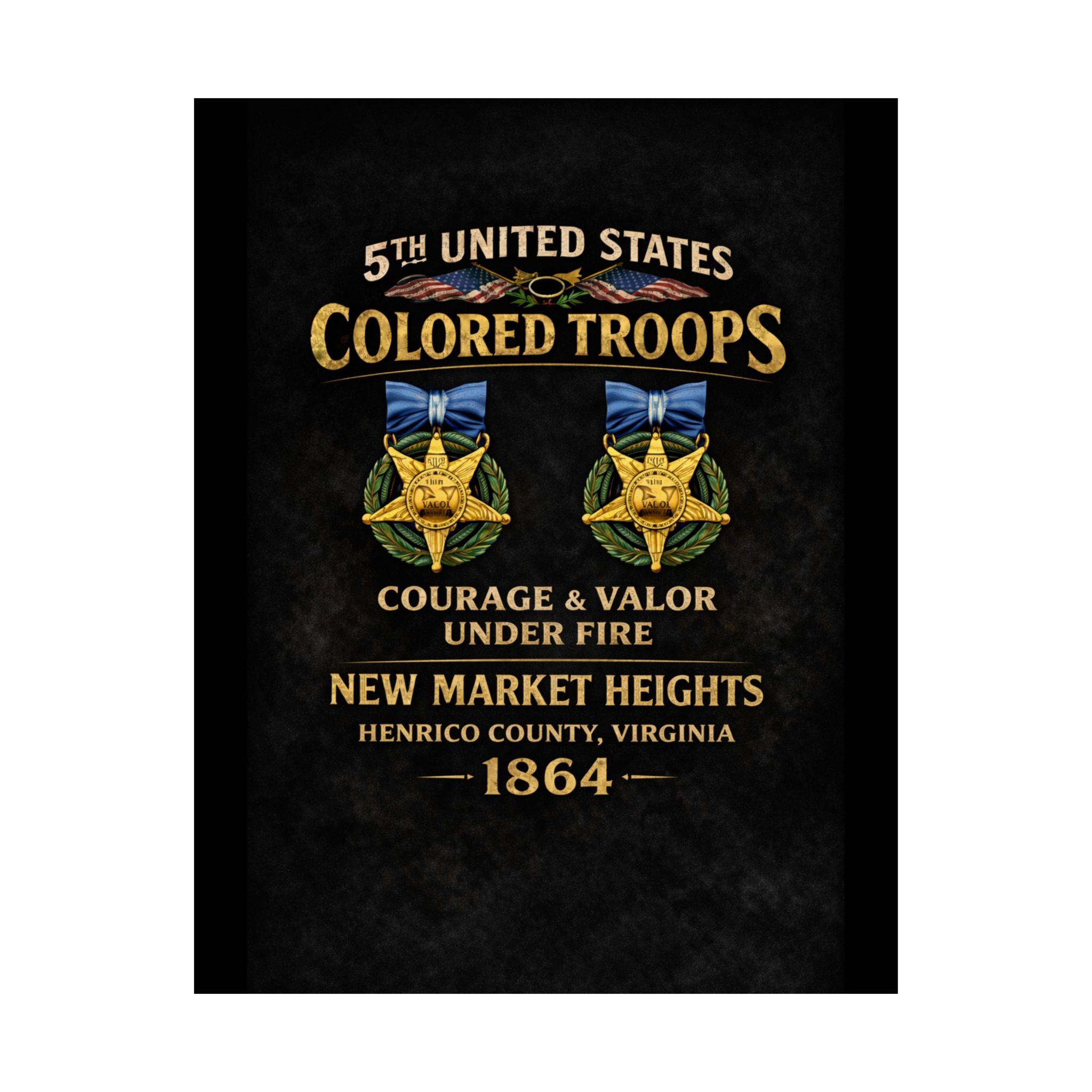 The Battle of New Market Heights stands as a defining moment for the United States Colored Troops. On September 29, 1864, the 5th USCT and other African American regiments assaulted heavily fortified Confederate positions outside Richmond, Virginia. Despite devastating casualties, they carried the heights and proved their valor beyond question. Fourteen soldiers earned the Medal of Honor that day—the largest number awarded to African American troops in a single battle. This poster commemorates their courage, sacrifice, and the fight for both Union and equality.