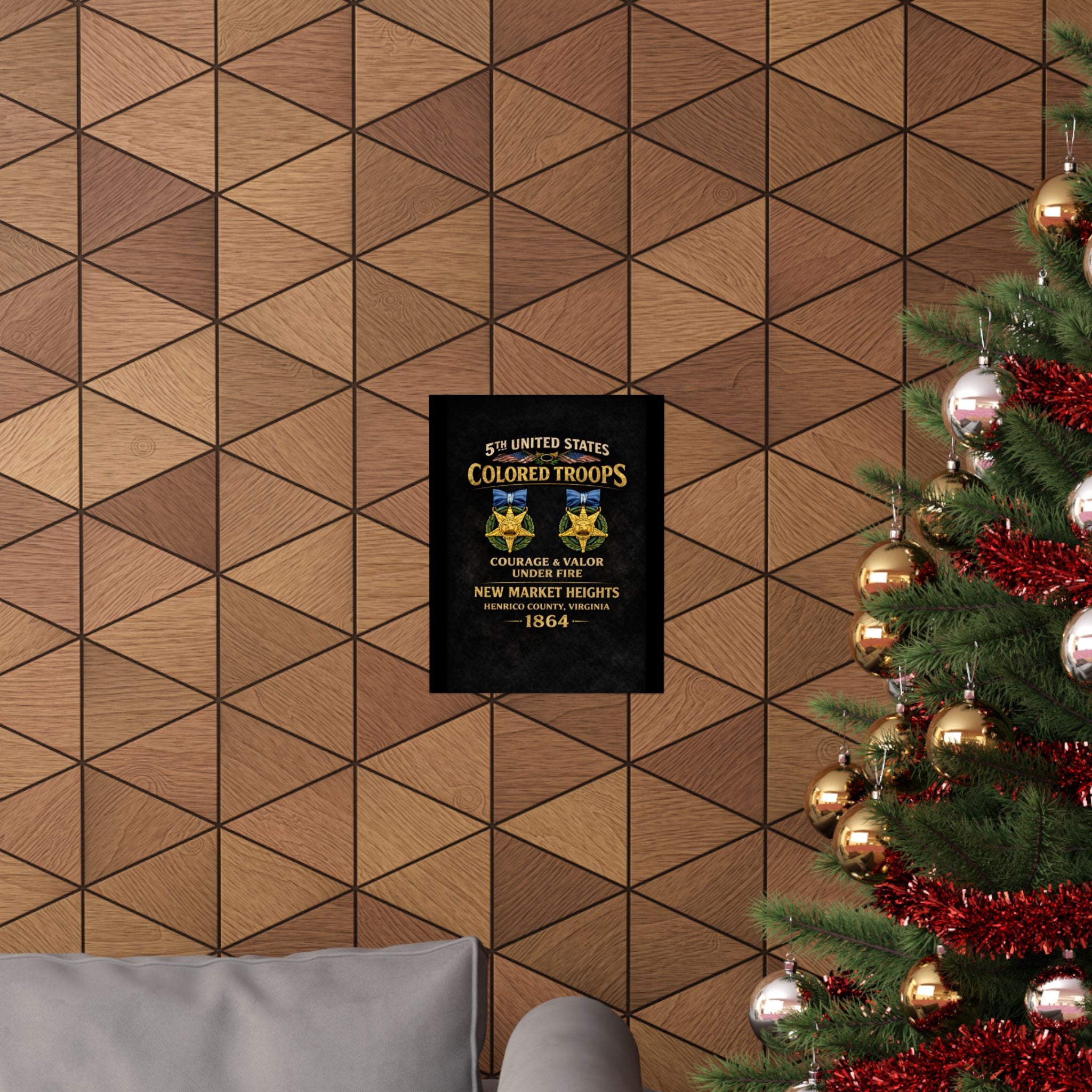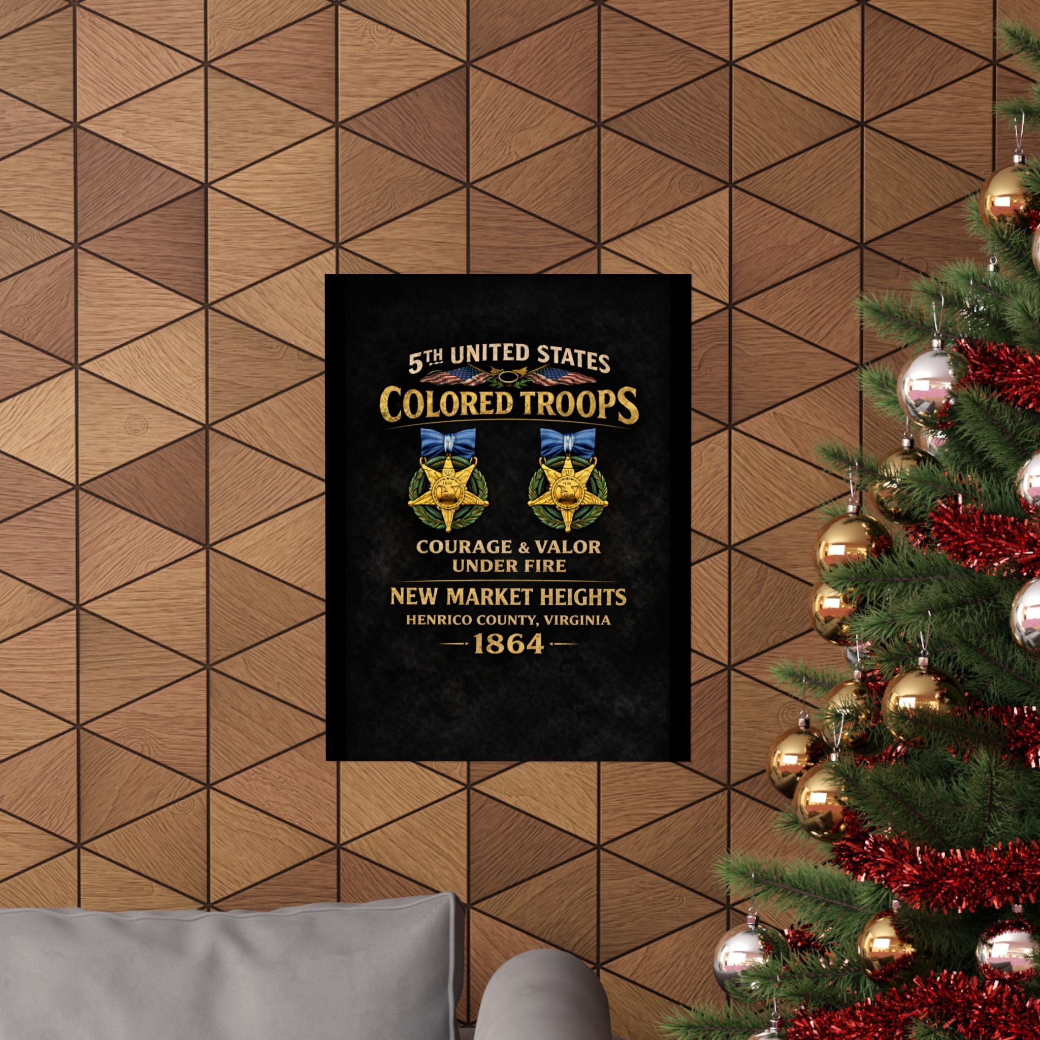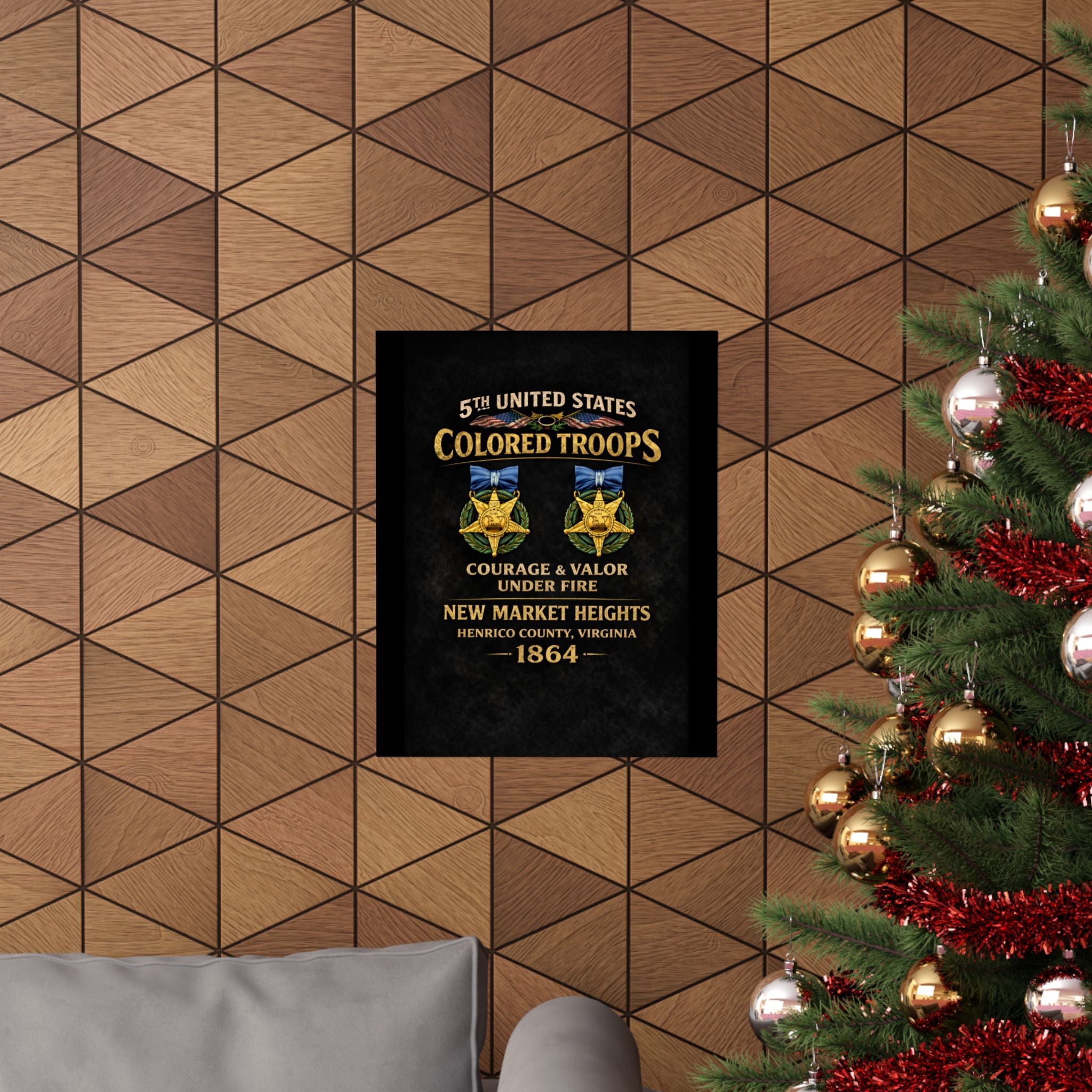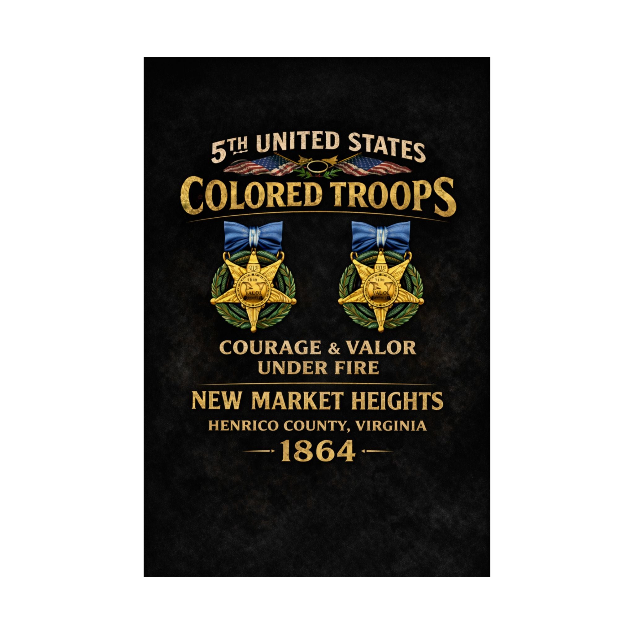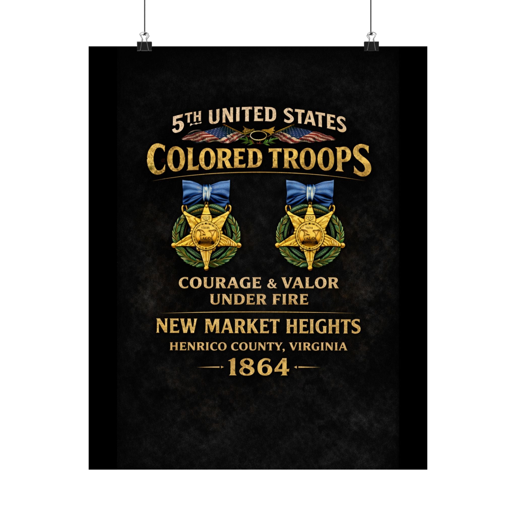 The Battle of New Market Heights stands as a defining moment for the United States Colored Troops. On September 29, 1864, the 5th USCT and other African American regiments assaulted heavily fortified Confederate positions outside Richmond, Virginia. Despite devastating casualties, they carried the heights and proved their valor beyond question. Fourteen soldiers earned the Medal of Honor that day—the largest number awarded to African American troops in a single battle. This poster commemorates their courage, sacrifice, and the fight for both Union and equality.