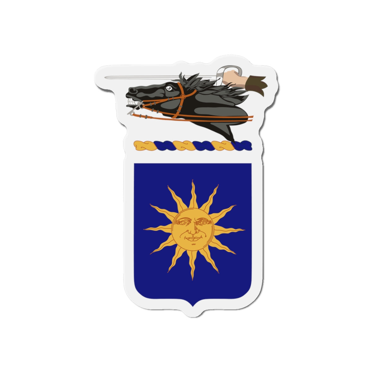 The coat of arms of the 26th Cavalry Regiment (Philippine Scouts) features a charging black horse, a dexter arm holding a saber, and a sun with twelve rays, symbolizing bravery, loyalty, and the diverse origins of the regiment’s soldiers.