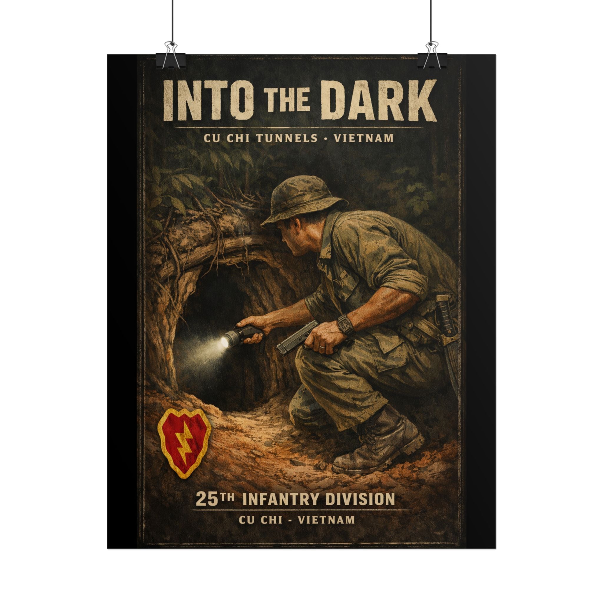 A museum-quality rolled art poster that captures the harrowing reality of tunnel warfare at Cu Chi, Vietnam. This extensive underground network, stretching over 150 miles beneath the Vietnamese countryside, became one of the war's most challenging and claustrophobic battlegrounds. American "tunnel rats" descended into darkness armed only with flashlights and pistols, facing booby traps, enemy combatants, and psychological terror in passages barely wide enough to crawl through. Rendered in textured, timeworn tones, this print honors the extraordinary courage of soldiers who fought in conditions few can imagine.