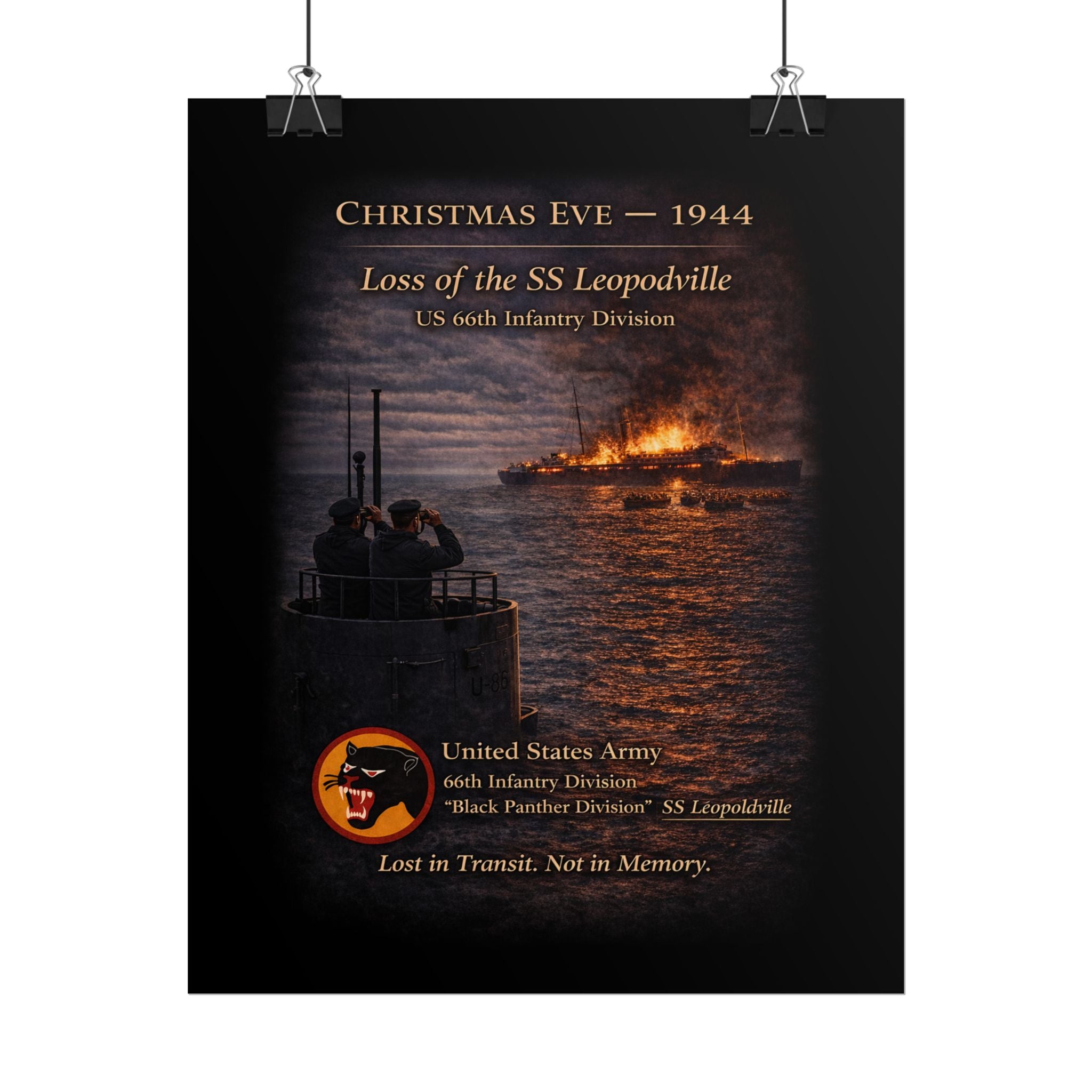 A museum-quality rolled art poster that commemorates the SS Leopoldville tragedy and the 66th Infantry Division during World War II. This print brings a solemn moment from December 1944 into your space with painterly detail and archival color. Rendered in textured, timeworn tones, the composition honors the soldiers lost when the troopship was torpedoed in the English Channel on Christmas Eve. Produced using giclée printing for fade-resistant, gallery-grade color, each poster is available in three archival paper finishes and multiple sizes.