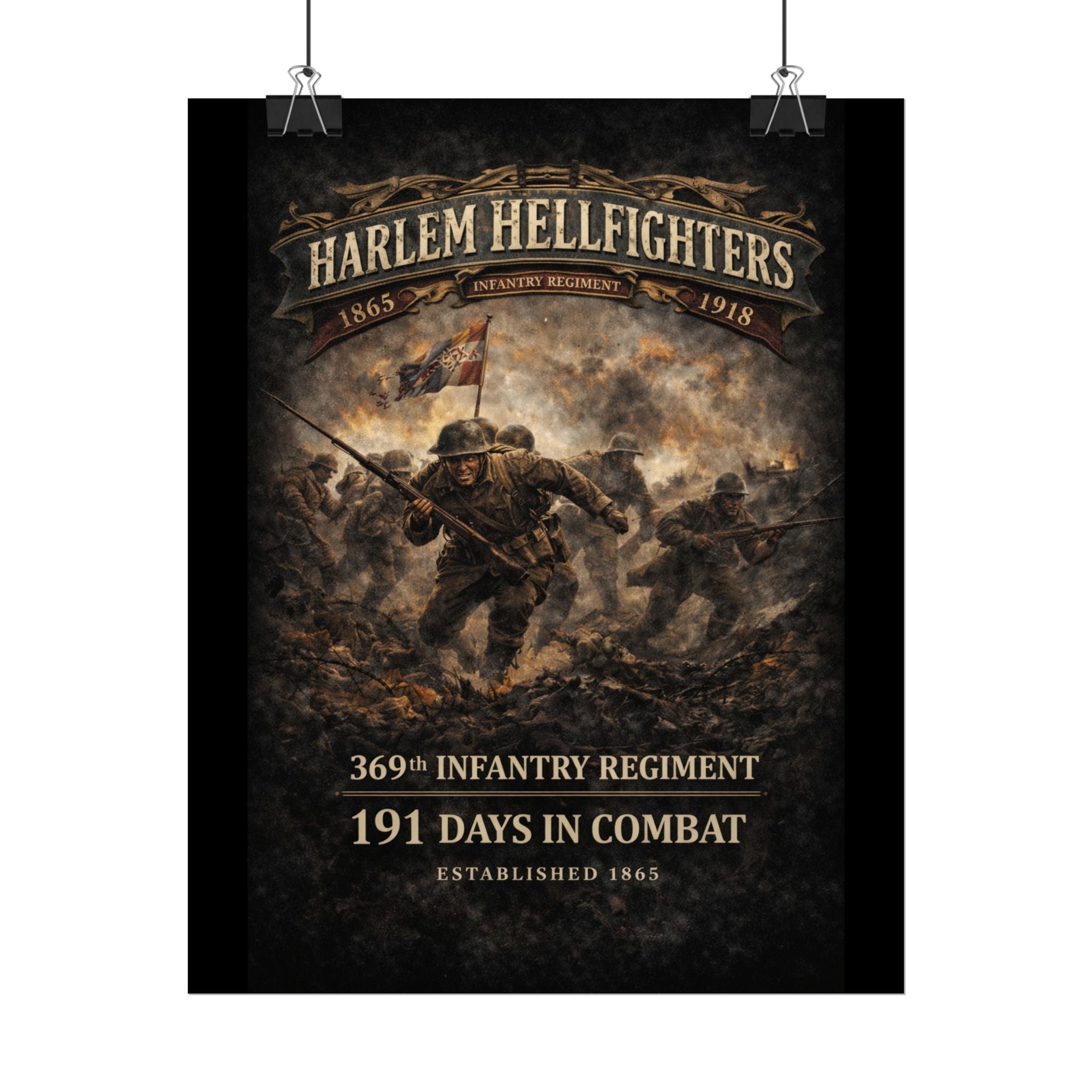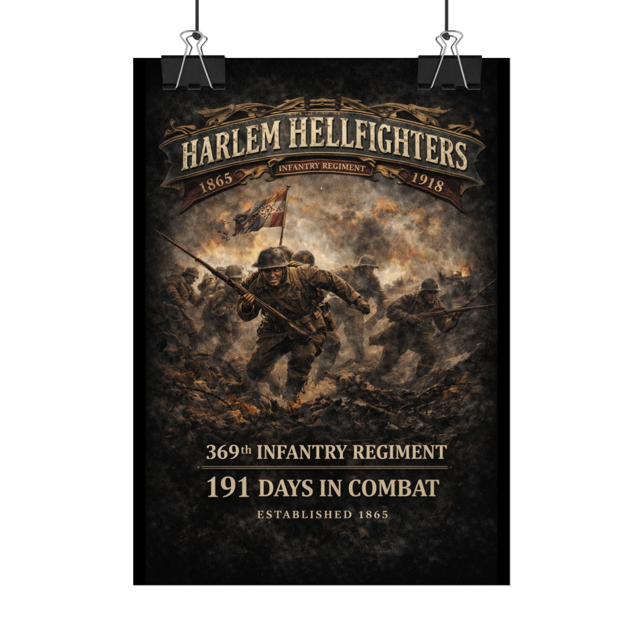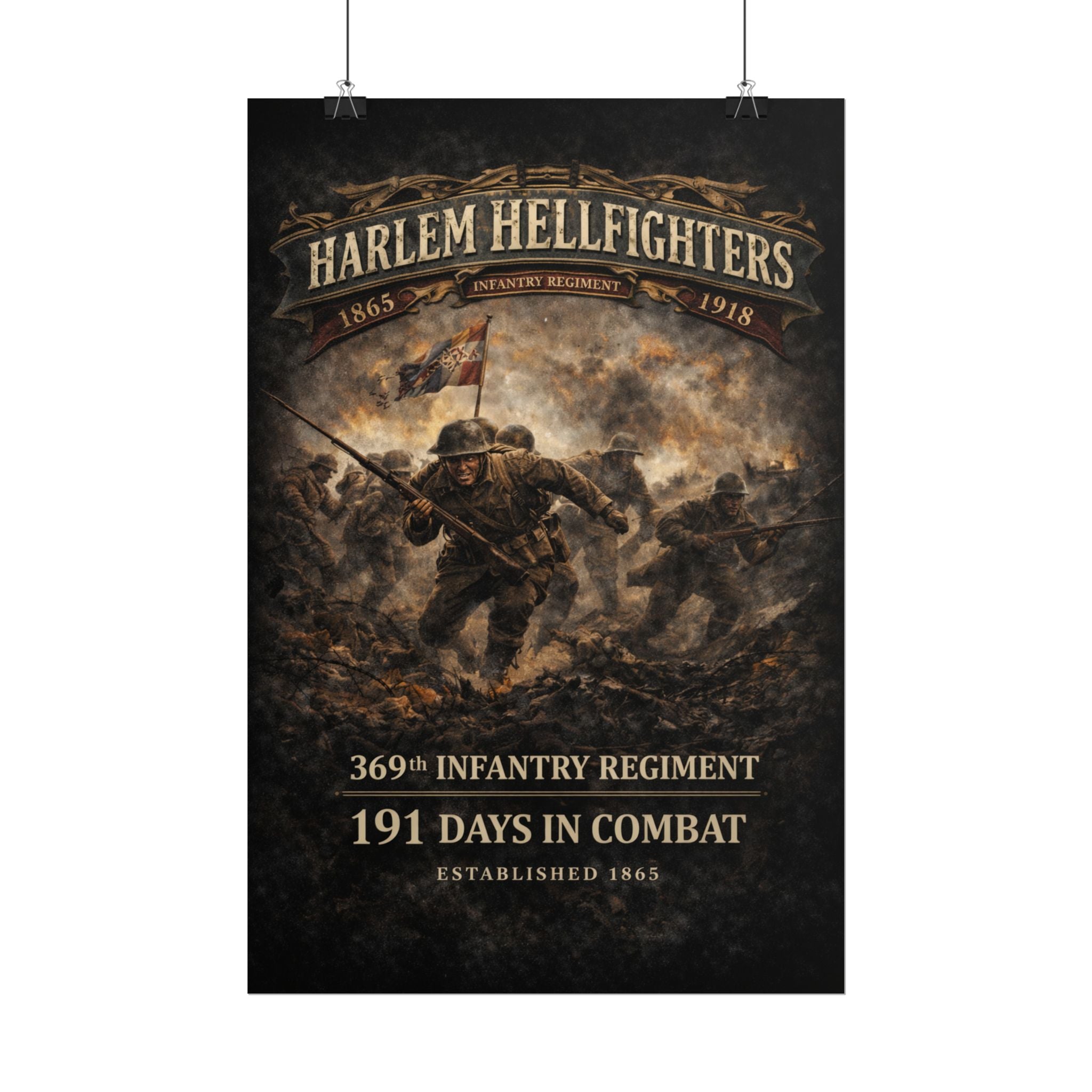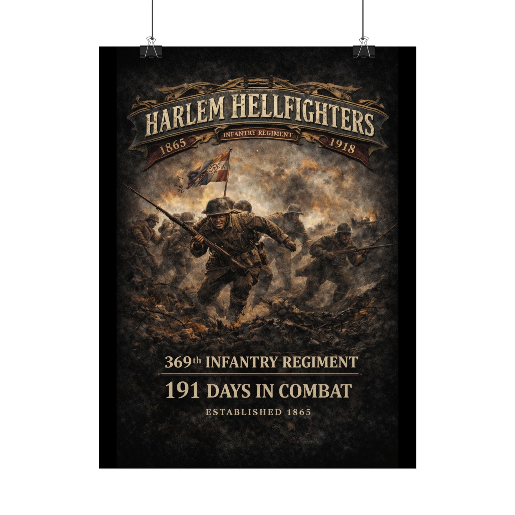 A museum-quality rolled art poster that honors the legendary 369th Infantry Regiment — the Harlem Hellfighters — with painterly detail and archival color. This print captures the courage and determination of these groundbreaking soldiers as they charge through the chaos of World War I, rendered in textured, timeworn tones that reflect their historic legacy.