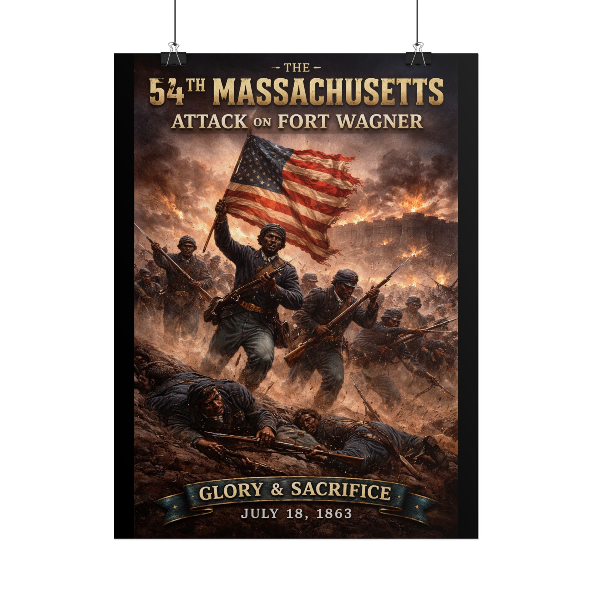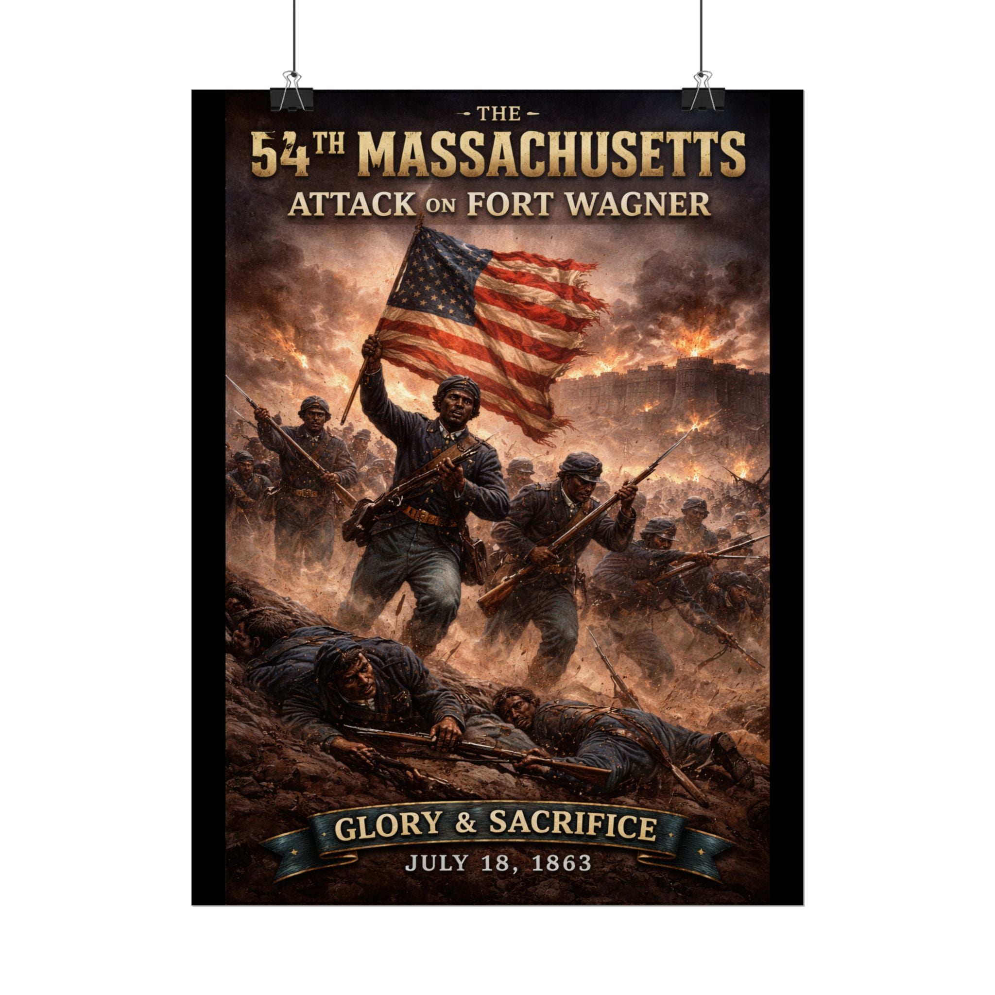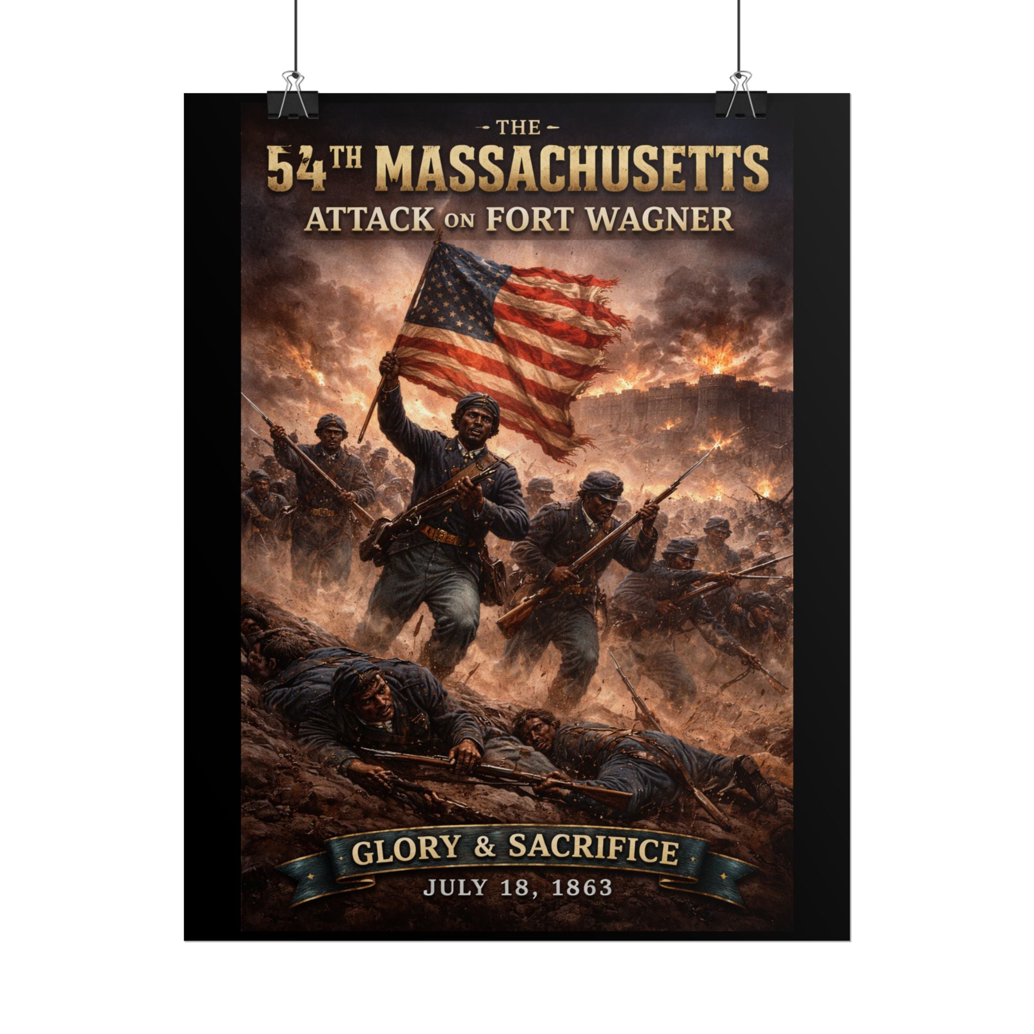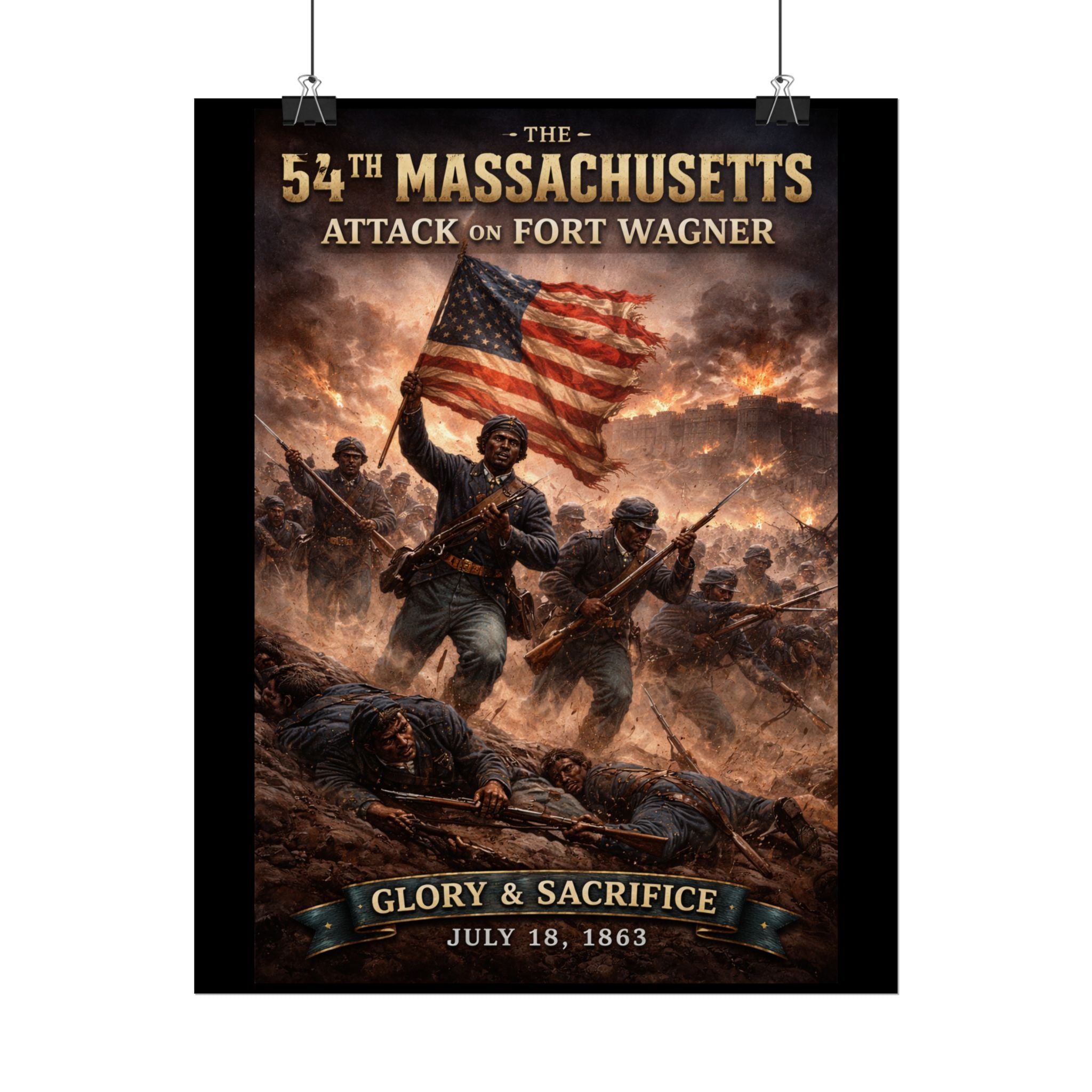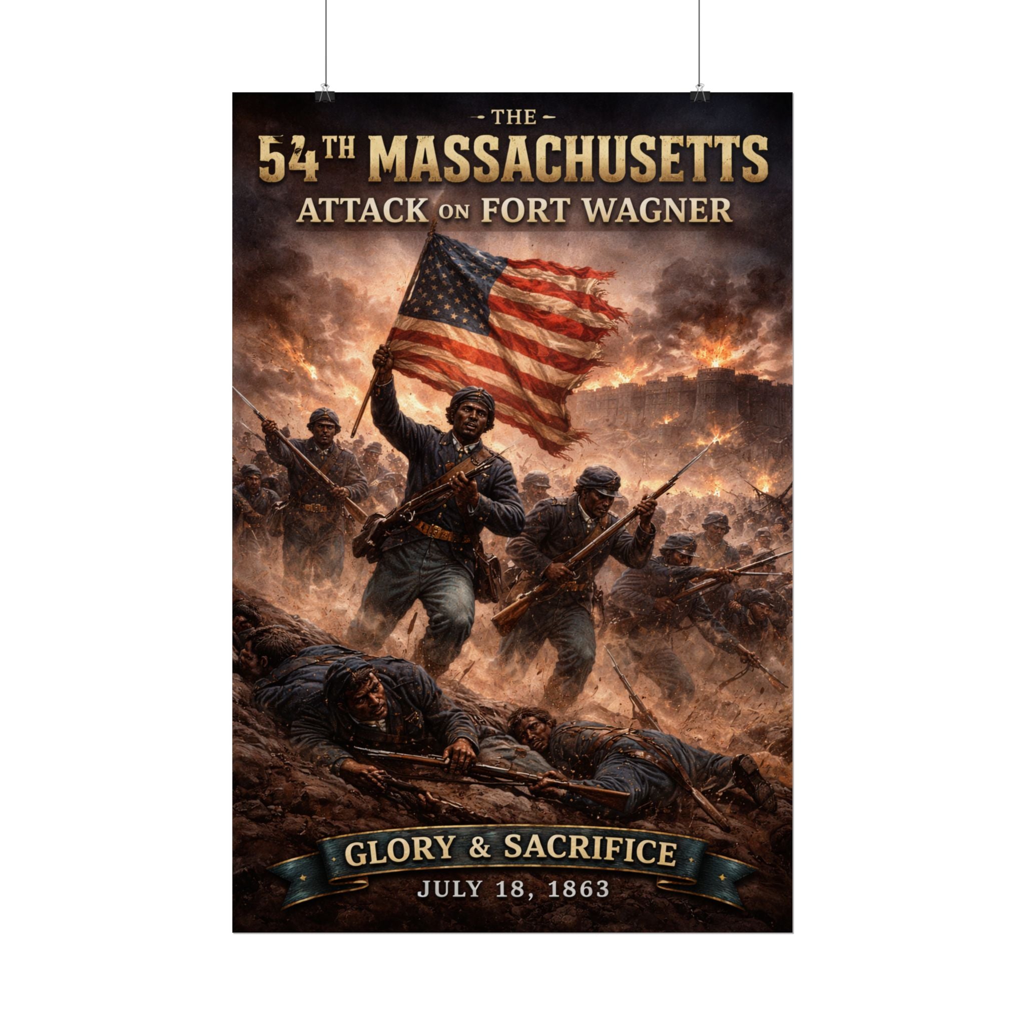 A museum-quality rolled art poster that honors one of the most courageous moments in American history — the 54th Massachusetts Infantry Regiment's assault on Fort Wagner in July 1863. This print captures the valor and sacrifice of the first African American regiment raised in the North, rendered in textured, timeworn tones that evoke the intensity of their heroic charge and the unit's pivotal role in proving the courage and capability of Black soldiers during the Civil War.