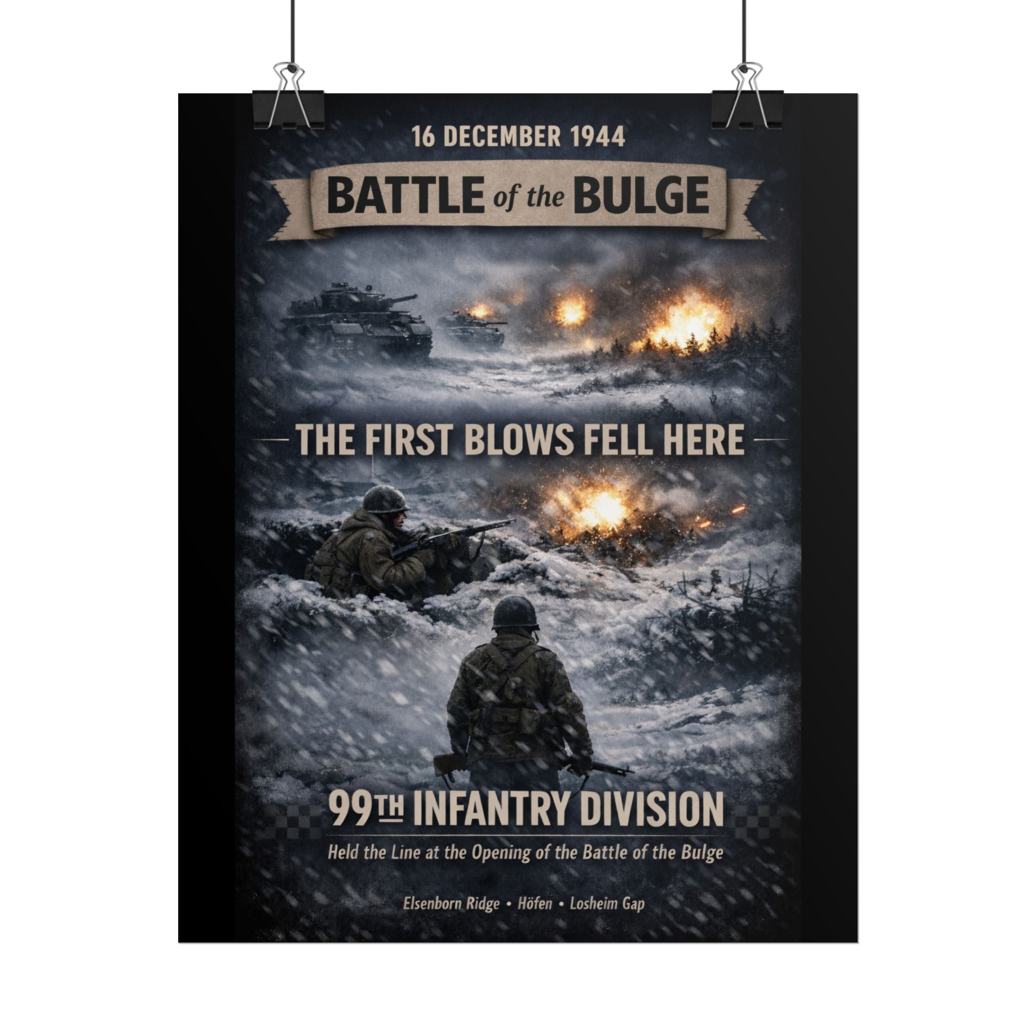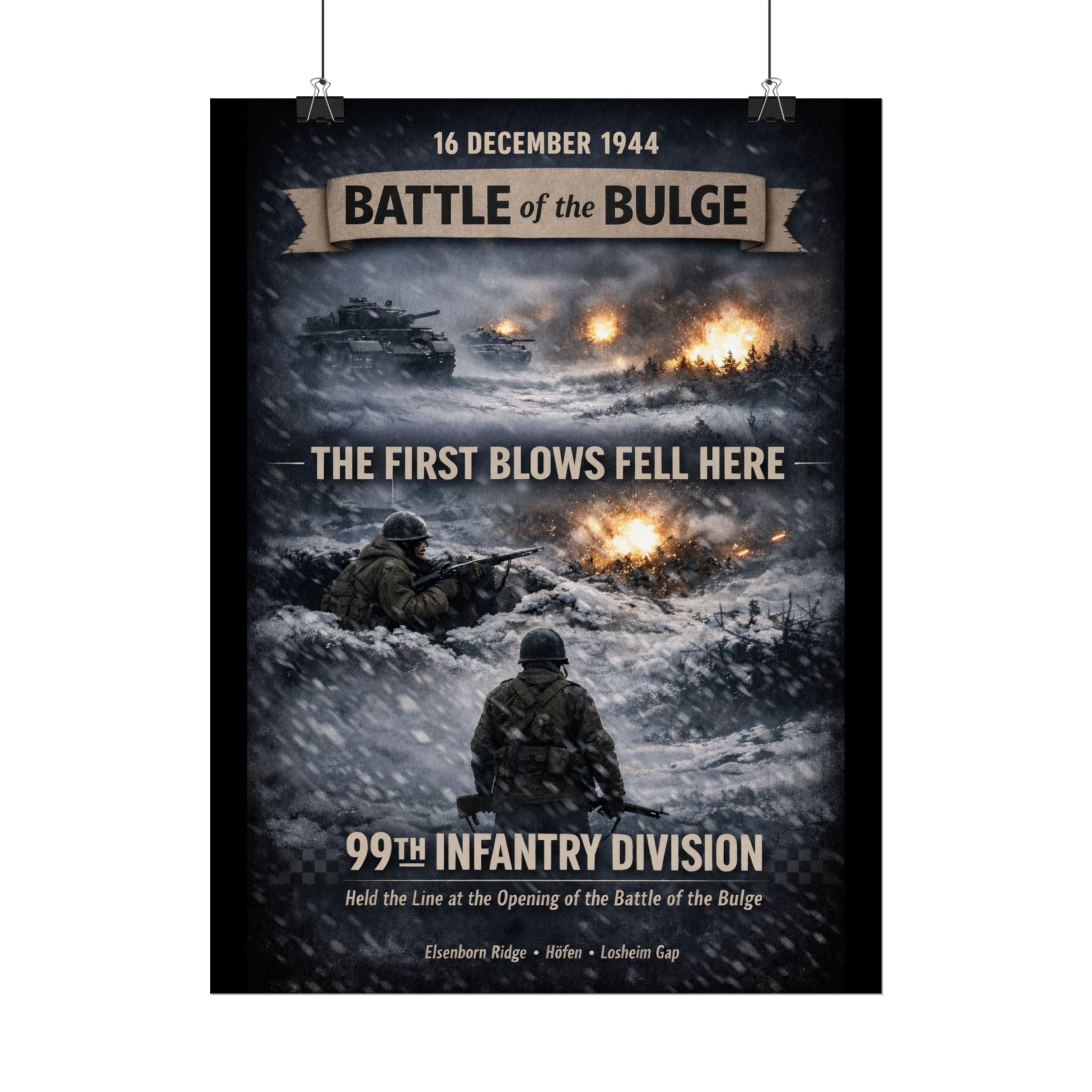 A museum-quality rolled art poster that honors one of the most pivotal moments of World War II — the 99th Infantry Division's heroic stand during the Battle of the Bulge. This print captures the courage and resilience of the "Checkerboard Division" during Germany's last major offensive in the Ardennes, rendered in textured, timeworn tones that evoke the harsh winter conditions and the unit's unwavering determination in December 1944.