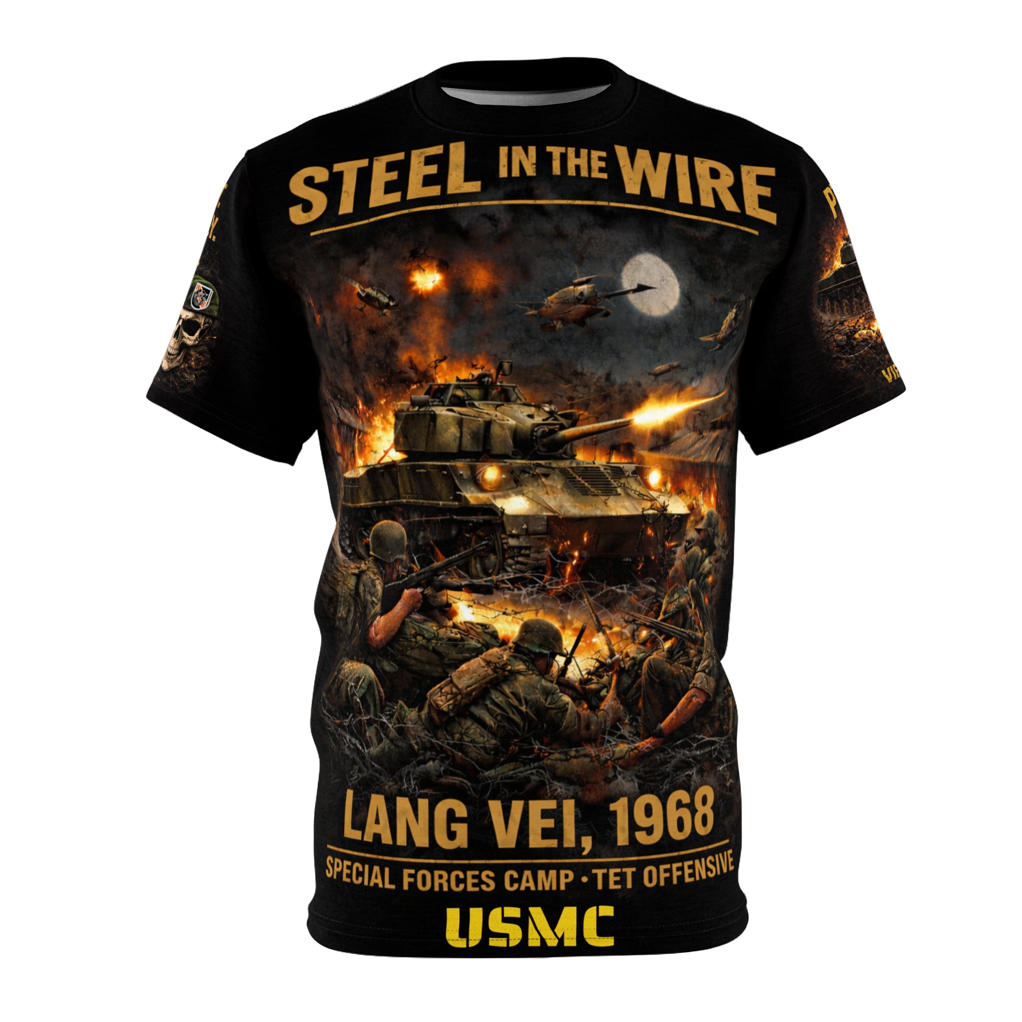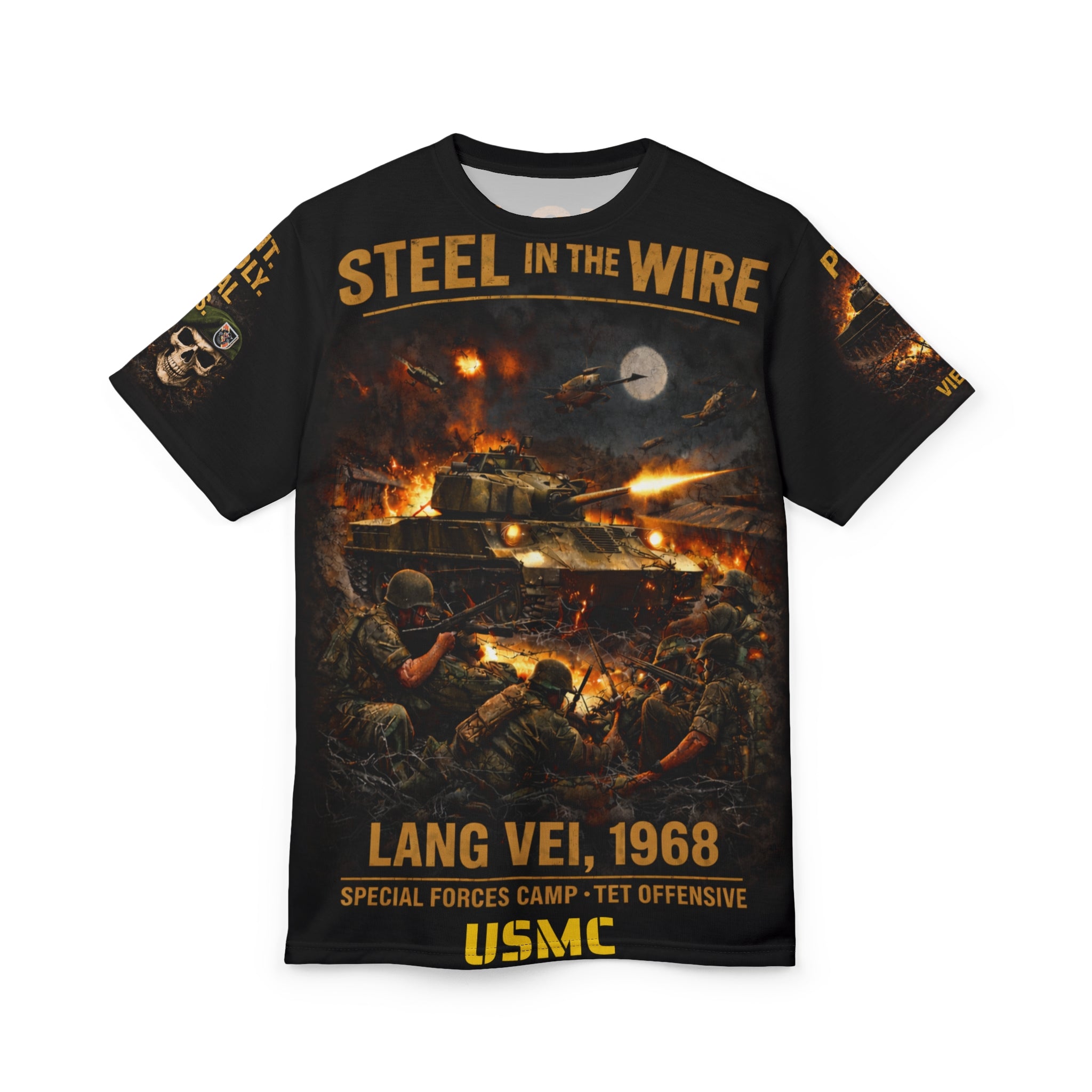 Lang Vei 1968 Special Forces Camp All‑Over Print Tee — "Steel in the Wire" - USMC