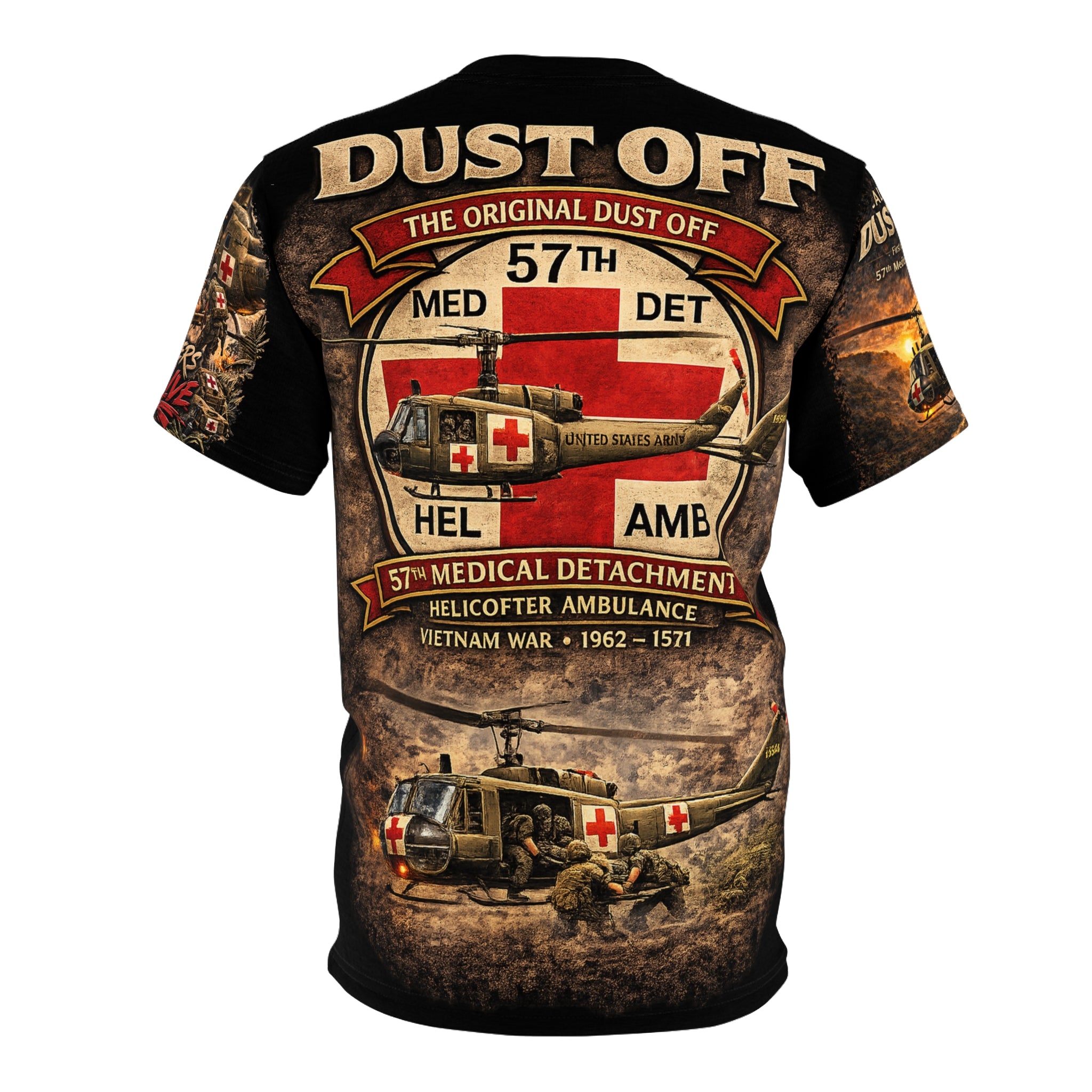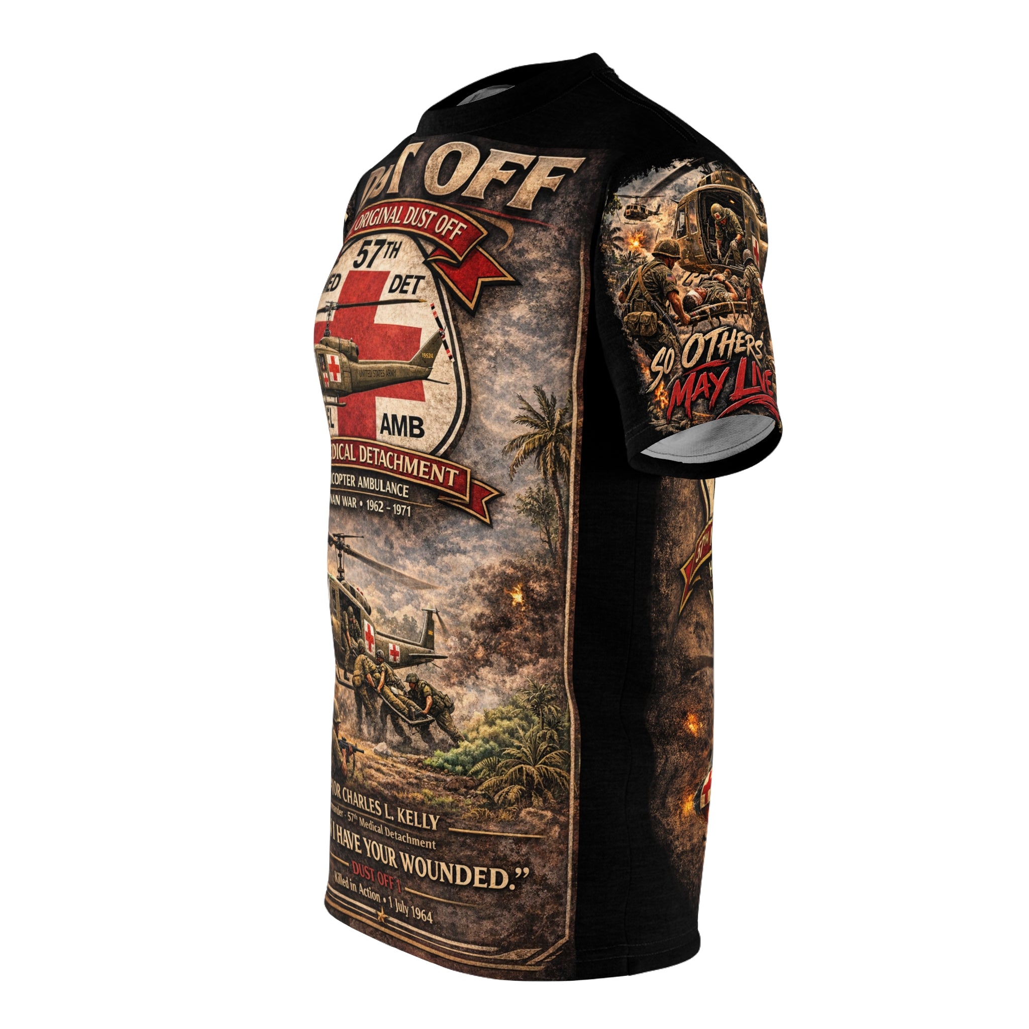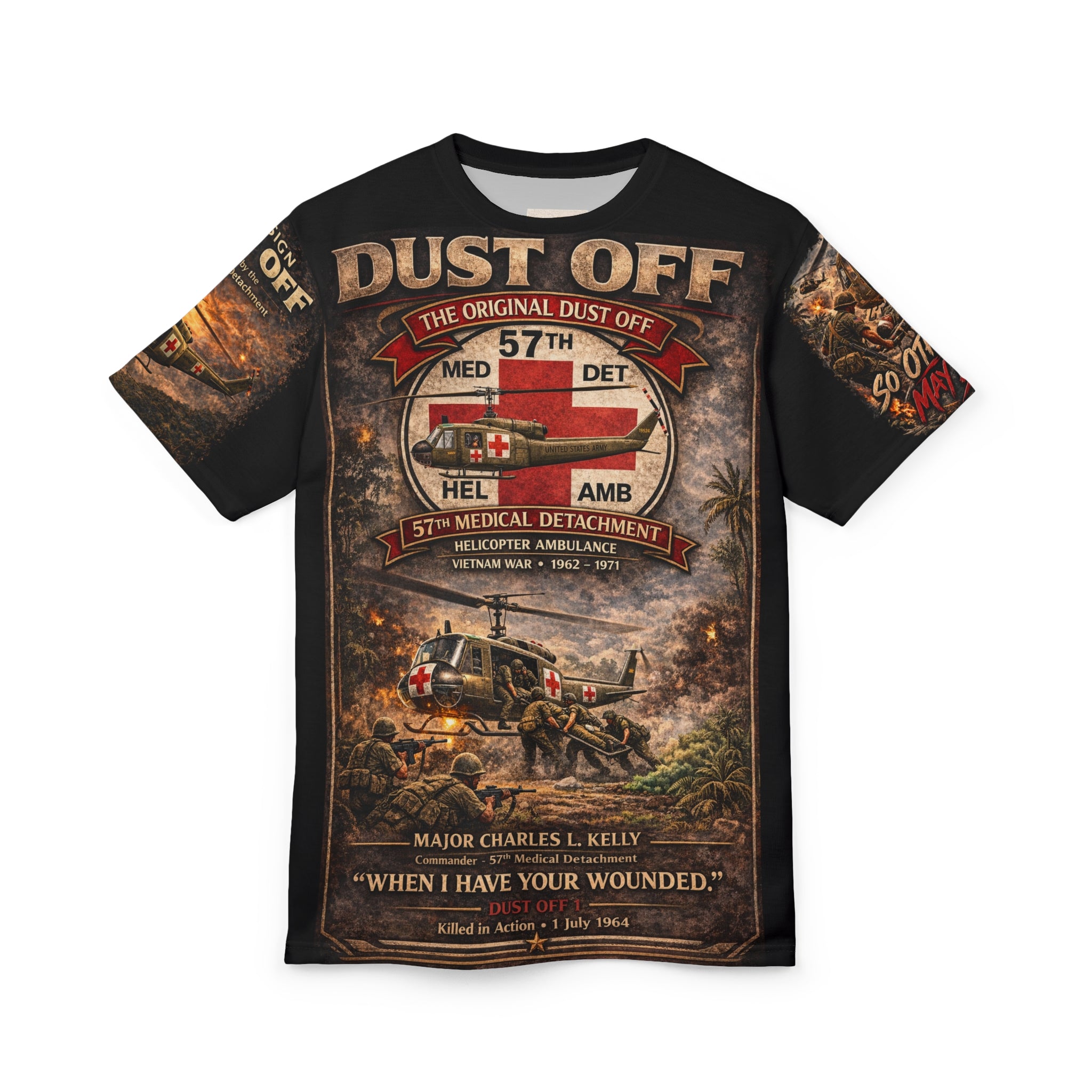 A premium tribute tee that honors Major Charles L. Kelly and the 57th Medical Detachment's legendary Dustoff legacy. This shirt carries quiet weight — inspired by the courage of helicopter medevac crews who flew into danger to save lives during the Vietnam War.