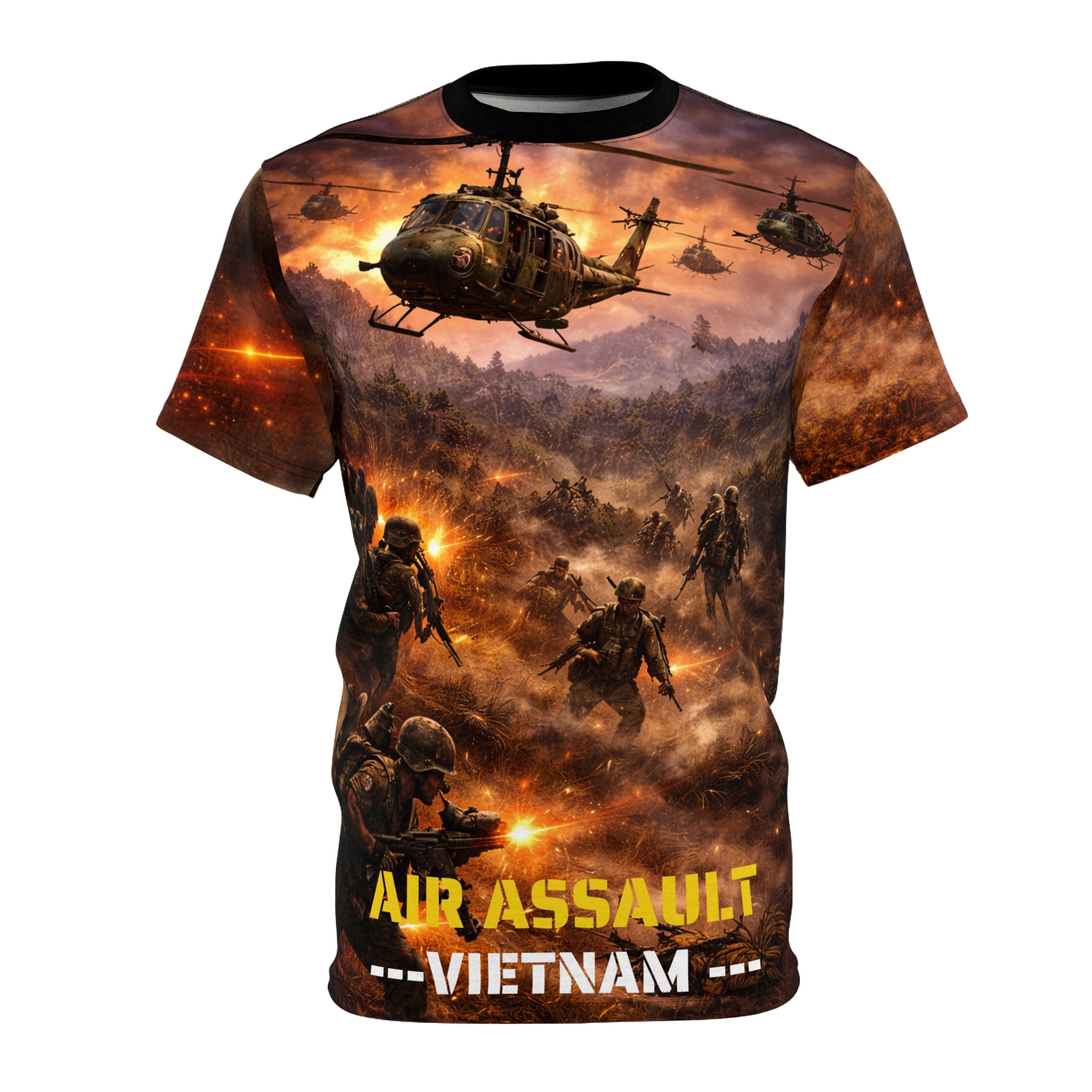 Featuring period-accurate imagery, helicopter squad graphics, and authentic Vietnam-era aesthetics, this tee captures the intensity and innovation of air assault operations. The all-over print design ensures every angle tells the story of courage, innovation, and brotherhood forged in the heat of battle.