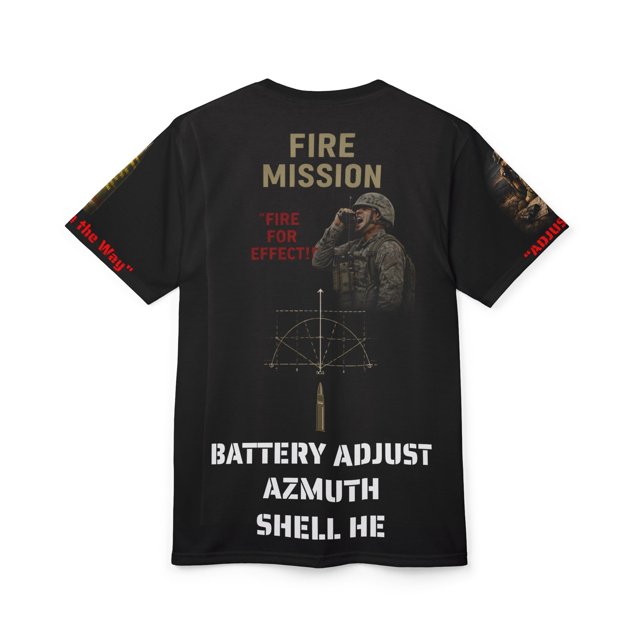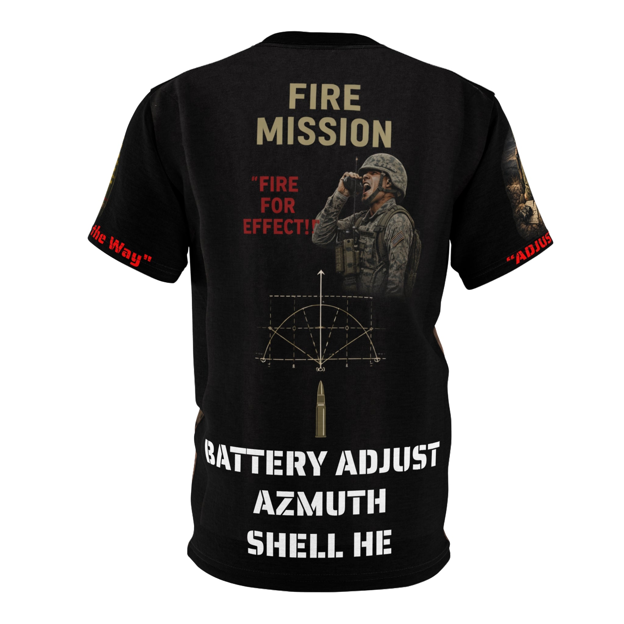 This all-over print tee captures a decisive moment in artillery operations: an M198 155mm howitzer firing at dusk, silhouetted against fading light as steel is sent downrange. The artwork emphasizes scale, power, and purpose—frozen at the exact instant of execution.