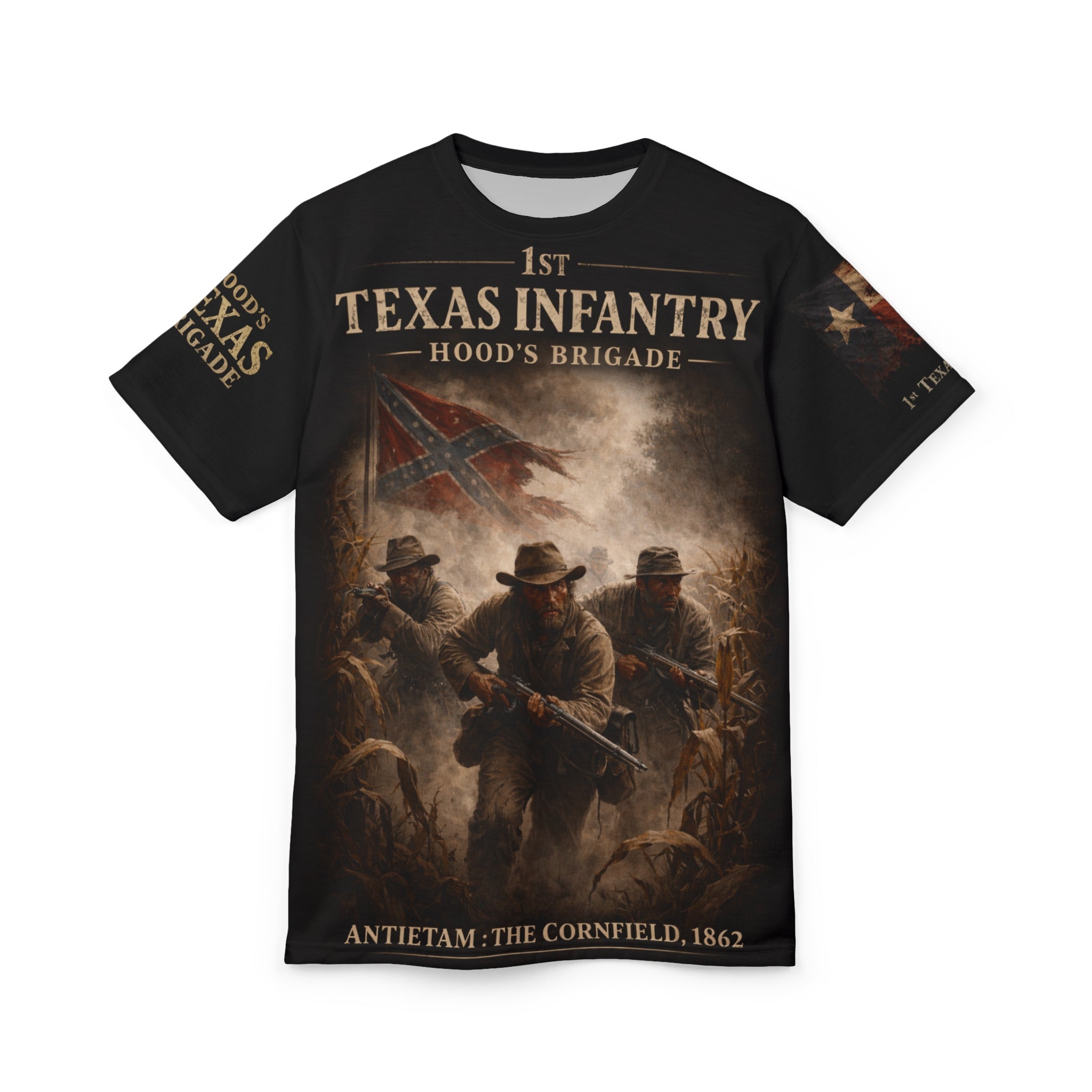 This all-over print tee brings a slice of Civil War history into everyday wear. The artwork depicts the 1st Texas Infantry of Hood’s Texas Brigade standing in a rippling cornfield at Antietam, 1862 — a quiet, intense moment captured across the full surface of the shirt. The polyester fabric keeps the colors sharp and the print vivid, so the scene reads from every angle. Wear it layered under a jacket for reenactment events or styled simply with jeans when you want a subtle, historically minded statement. The regular fit and tagless finish make it comfortable for long days at living history gatherings or casual outings where the story behind the image can start conversations.