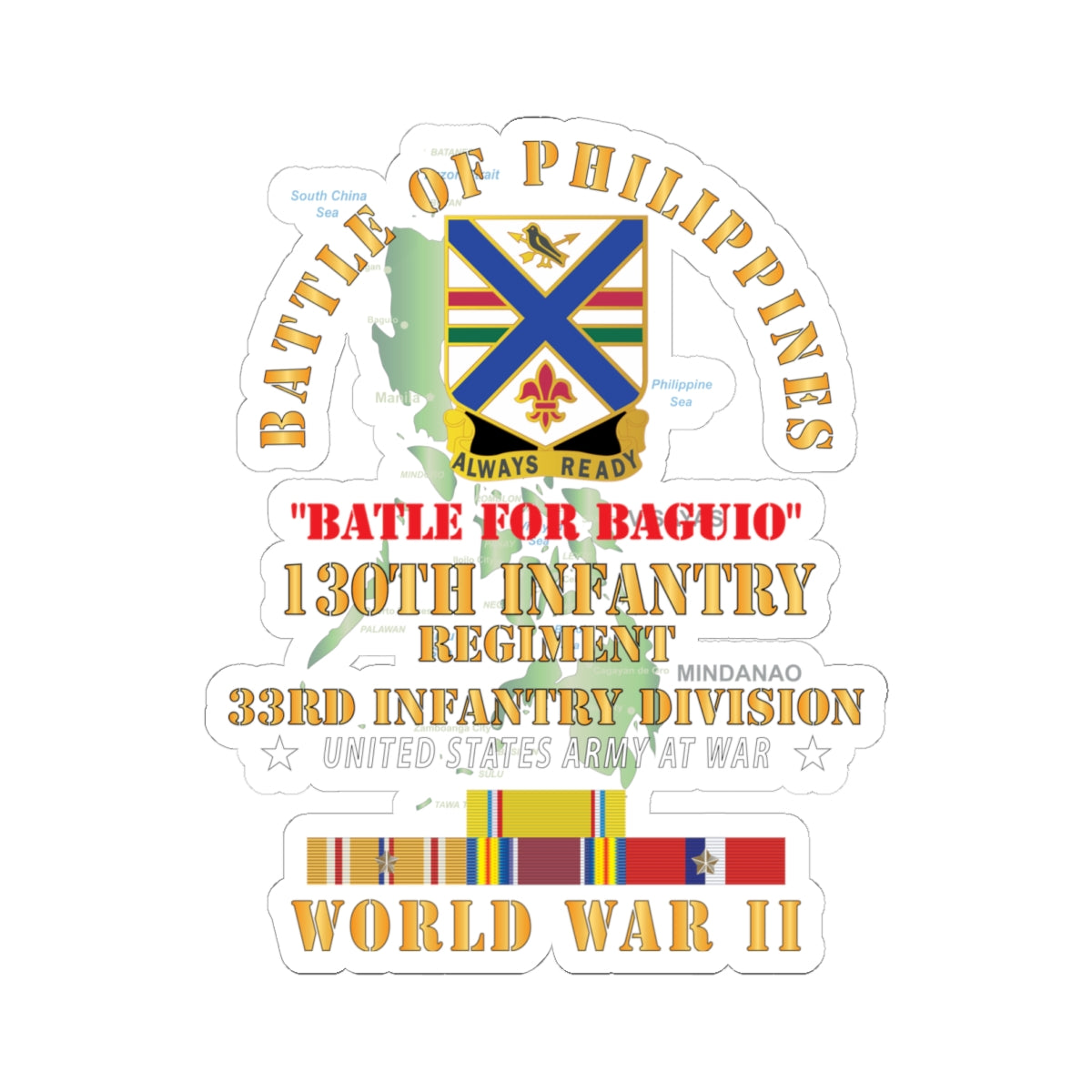 Kiss-Cut Stickers - Army - Battle for Philippines - 130th Infantry Regiment - 33rd Infantry Division w PAC - PHIL SVC X 300