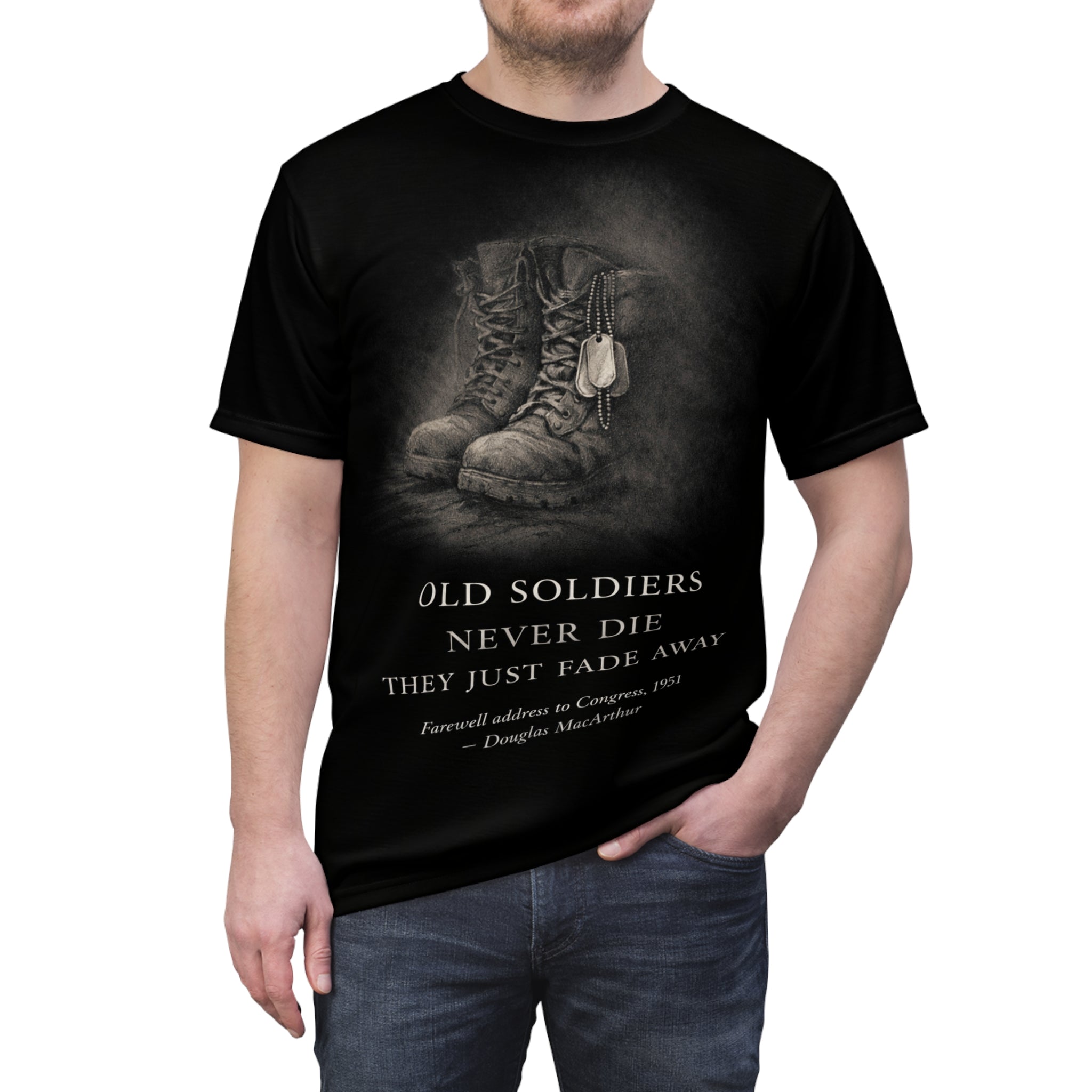 This all-over print tee carries a quiet, resolute tone—a wearable tribute that honors veterans and remembers the words of Douglas MacArthur. The imagery and text wrap the fabric, creating a continuous canvas that feels like a folded flag: respectful, composed, and full of history. Designed for those who keep remembrance close.
