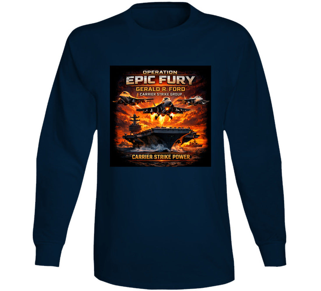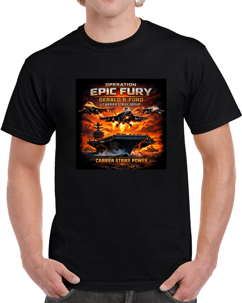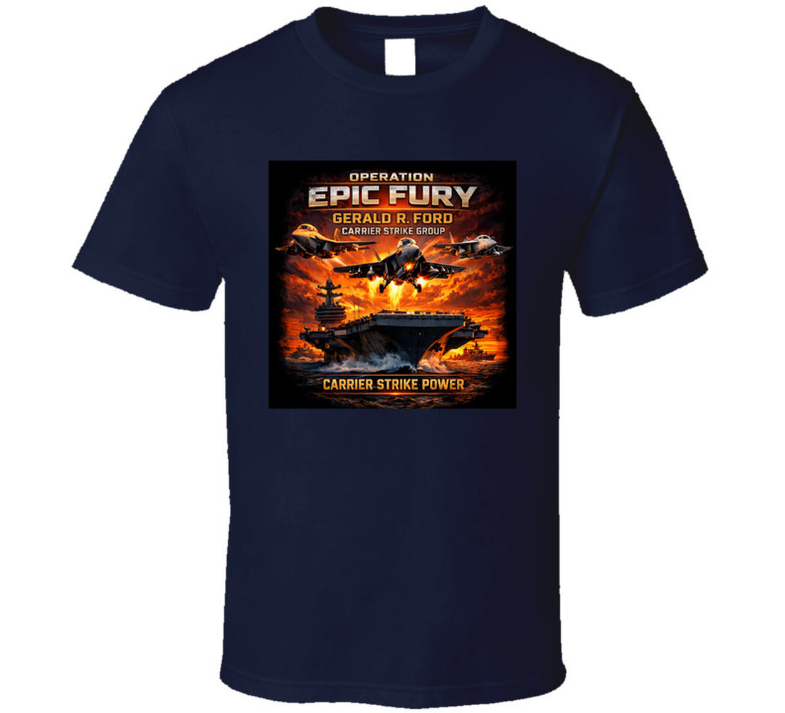 Operation Epic Fury marked a pivotal chapter in 21st-century naval aviation — showcasing the full combat capability of the Ford-class carrier and its battle group on the world stage. This shirt is a tribute to every sailor, aviator, and flight deck crew member who made that mission possible.