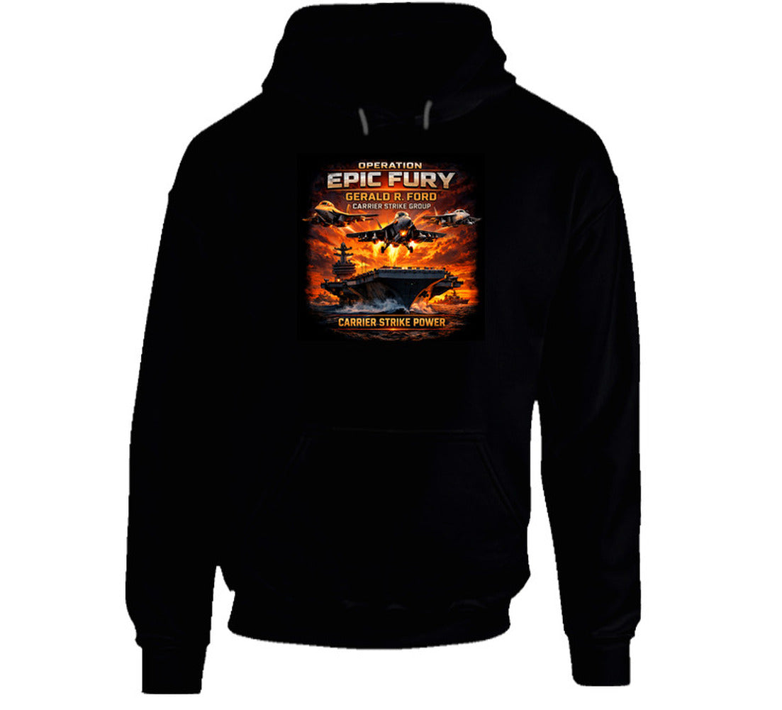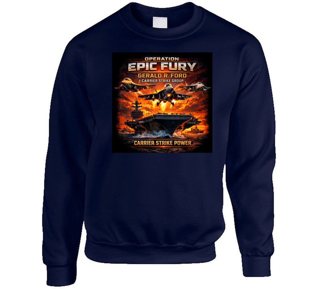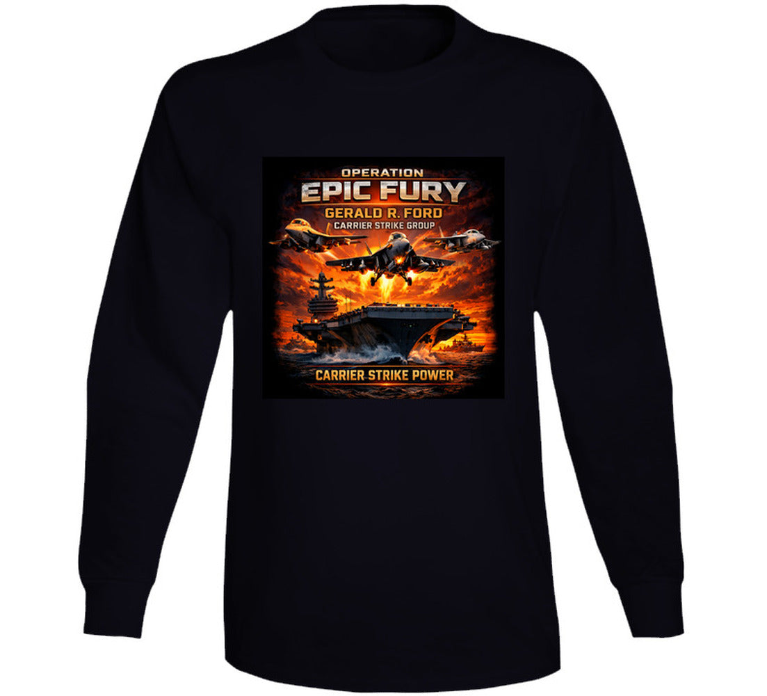 Operation Epic Fury marked a pivotal chapter in 21st-century naval aviation — showcasing the full combat capability of the Ford-class carrier and its battle group on the world stage. This shirt is a tribute to every sailor, aviator, and flight deck crew member who made that mission possible.