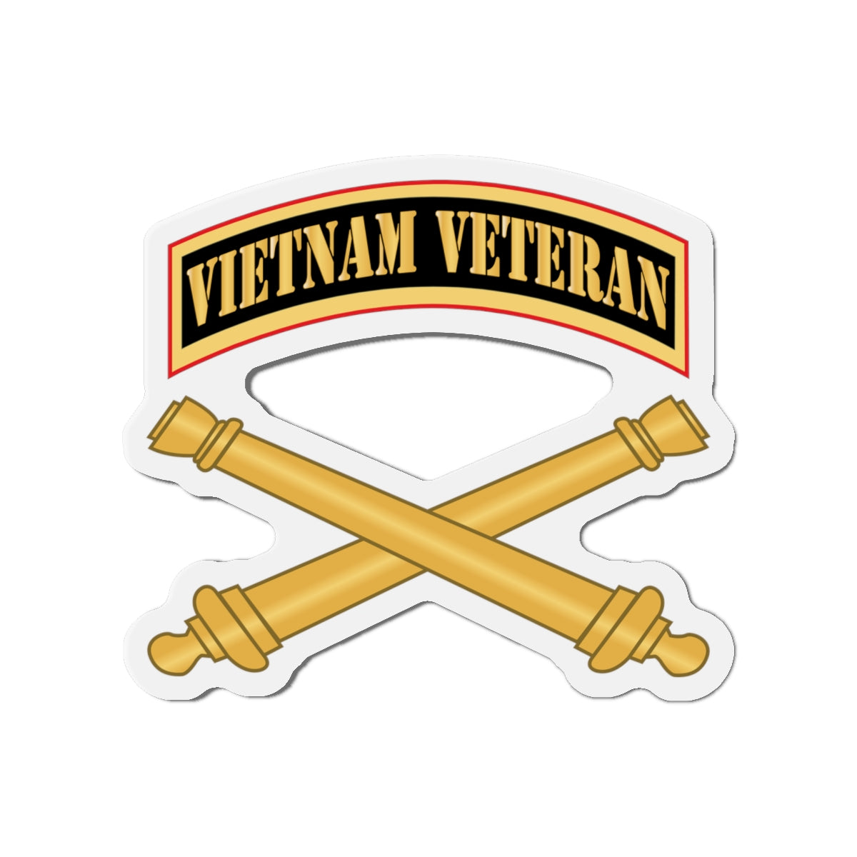 The "Vietnam Veteran Tab - Gold - Artillery" refers to a commemorative insignia for U.S. Army personnel who served in a field artillery unit during the Vietnam War, symbolizing their service in that specific branch. It is often seen on merchandise like hats, license plates, and hoodies, and represents a veteran's role in supporting infantry with artillery fire, a critical function during the war.