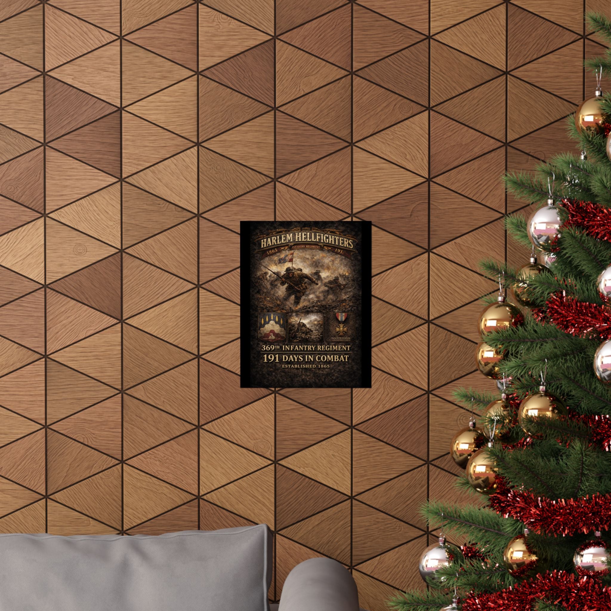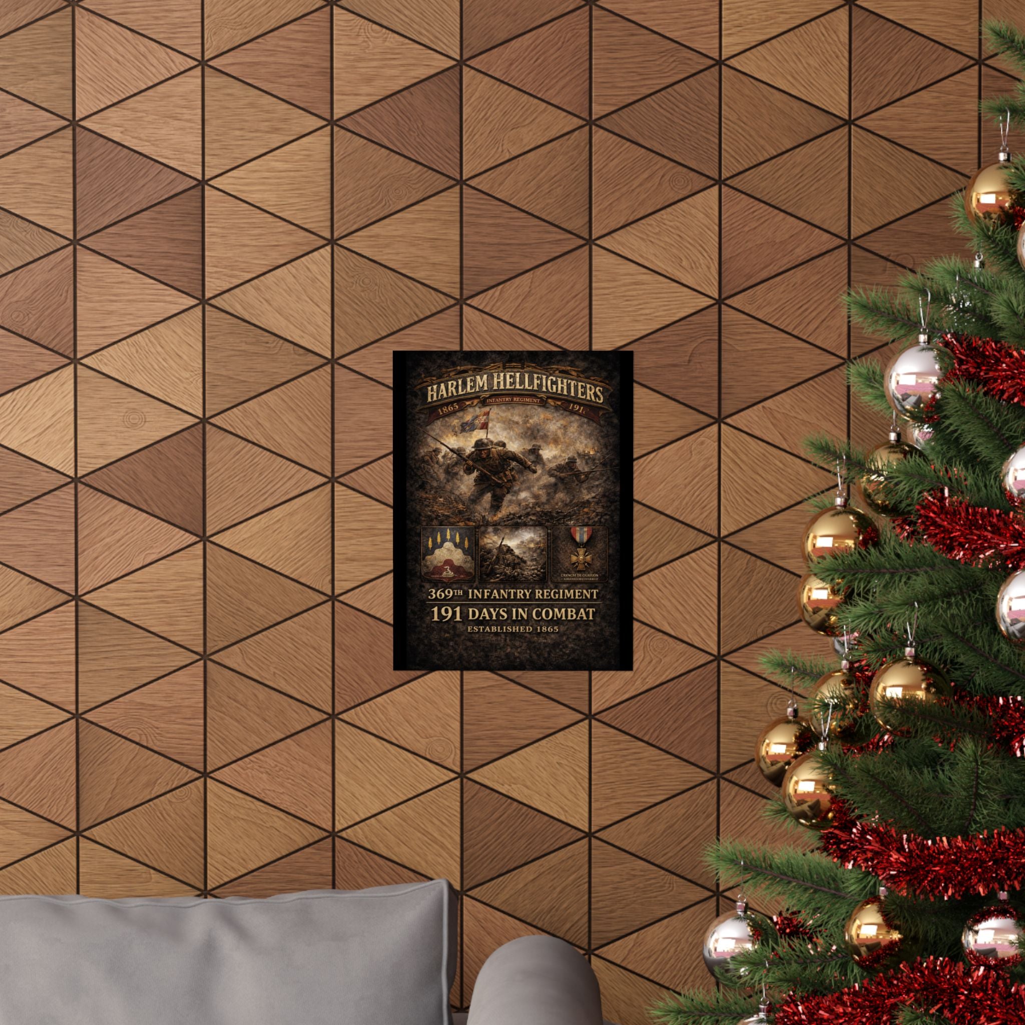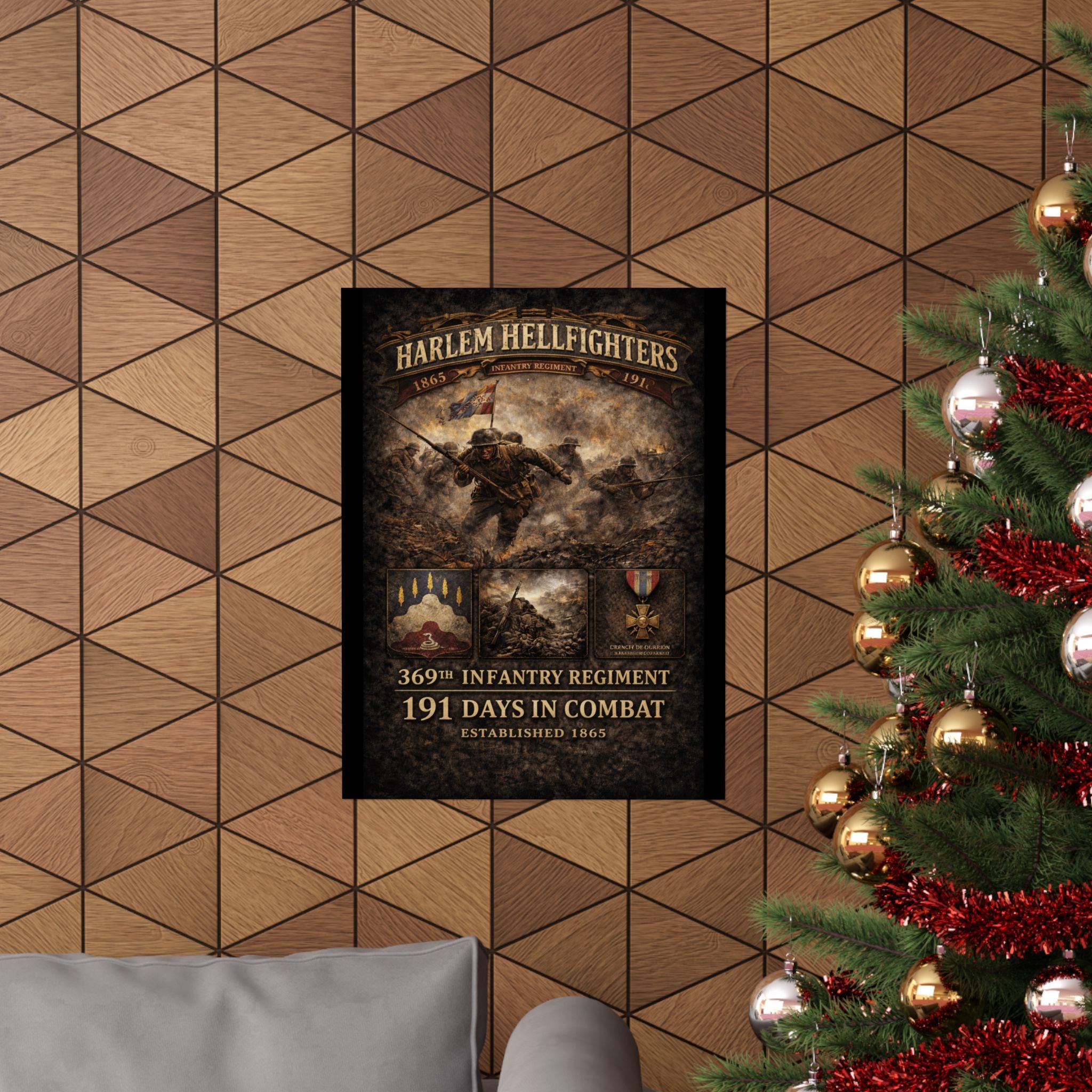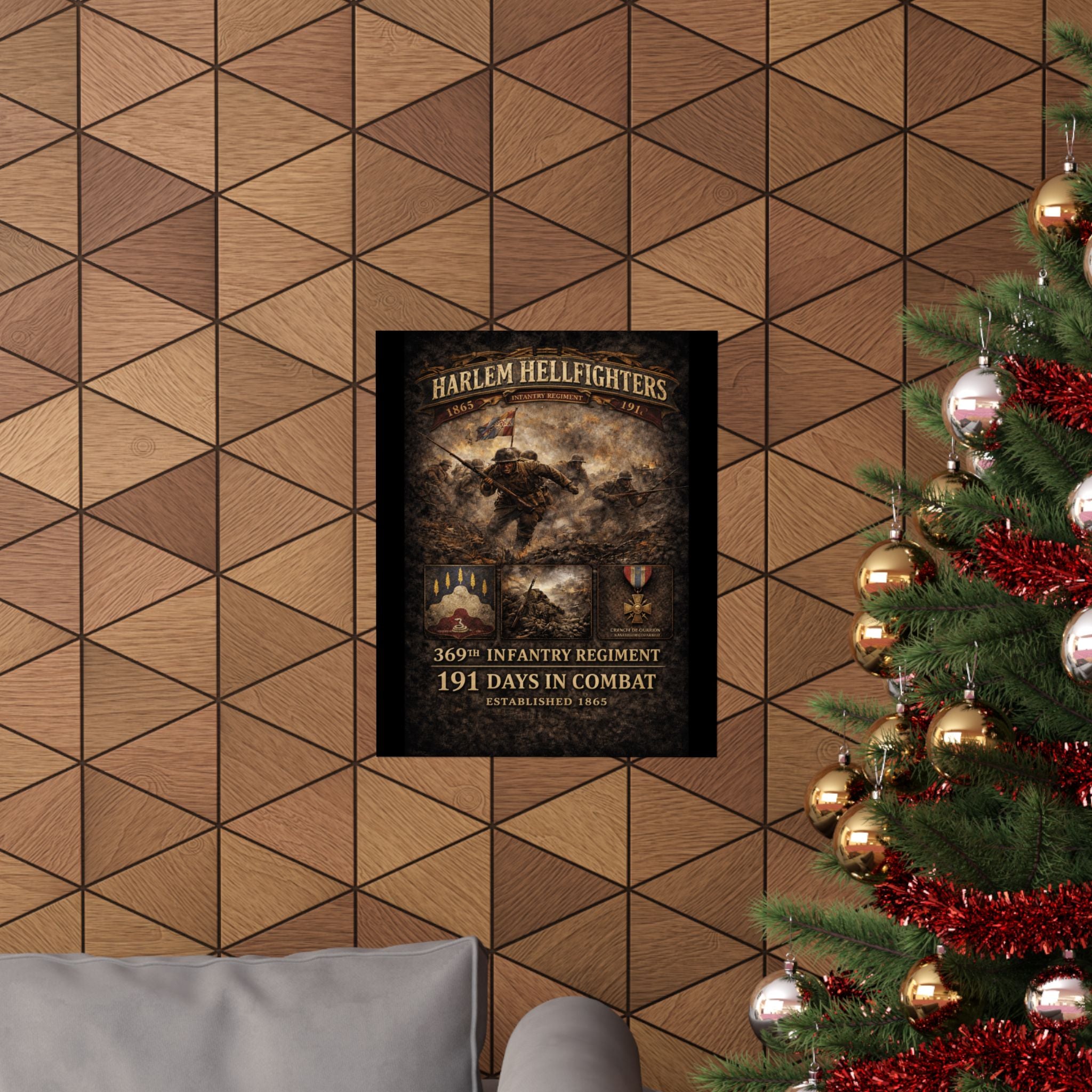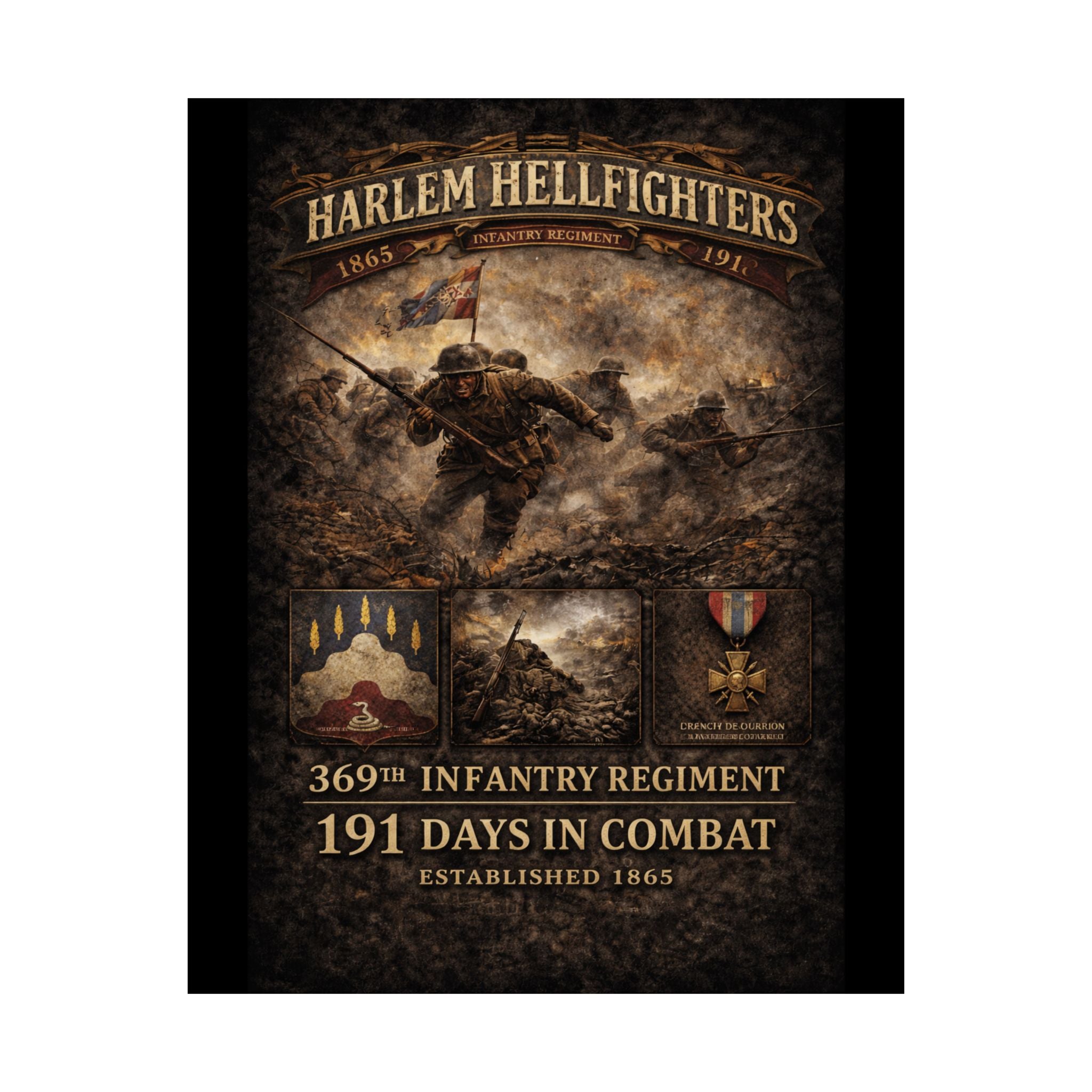 A matte vertical poster that honors the 369th Infantry Regiment's historic assault across No Man's Land during World War I. The scene carries a quiet, resolute energy — barbed wire and shell craters mark the landscape, boots and rifles press forward through the smoke, and the courage of a legendary unit is rendered with archival clarity. Hung on a study wall or above a reading chair, this poster pulls a corner of military history into daily life, inviting reflection and conversation. The muted, matte surface prevents glare so details stay visible under soft lighting. Printed on museum-grade paper with giclée inks, colors remain true over time so the moment stays as vivid as the memory it represents. Sized to fit a variety of frames, it's built for indoor display where its somber, respectful tone can be appreciated.