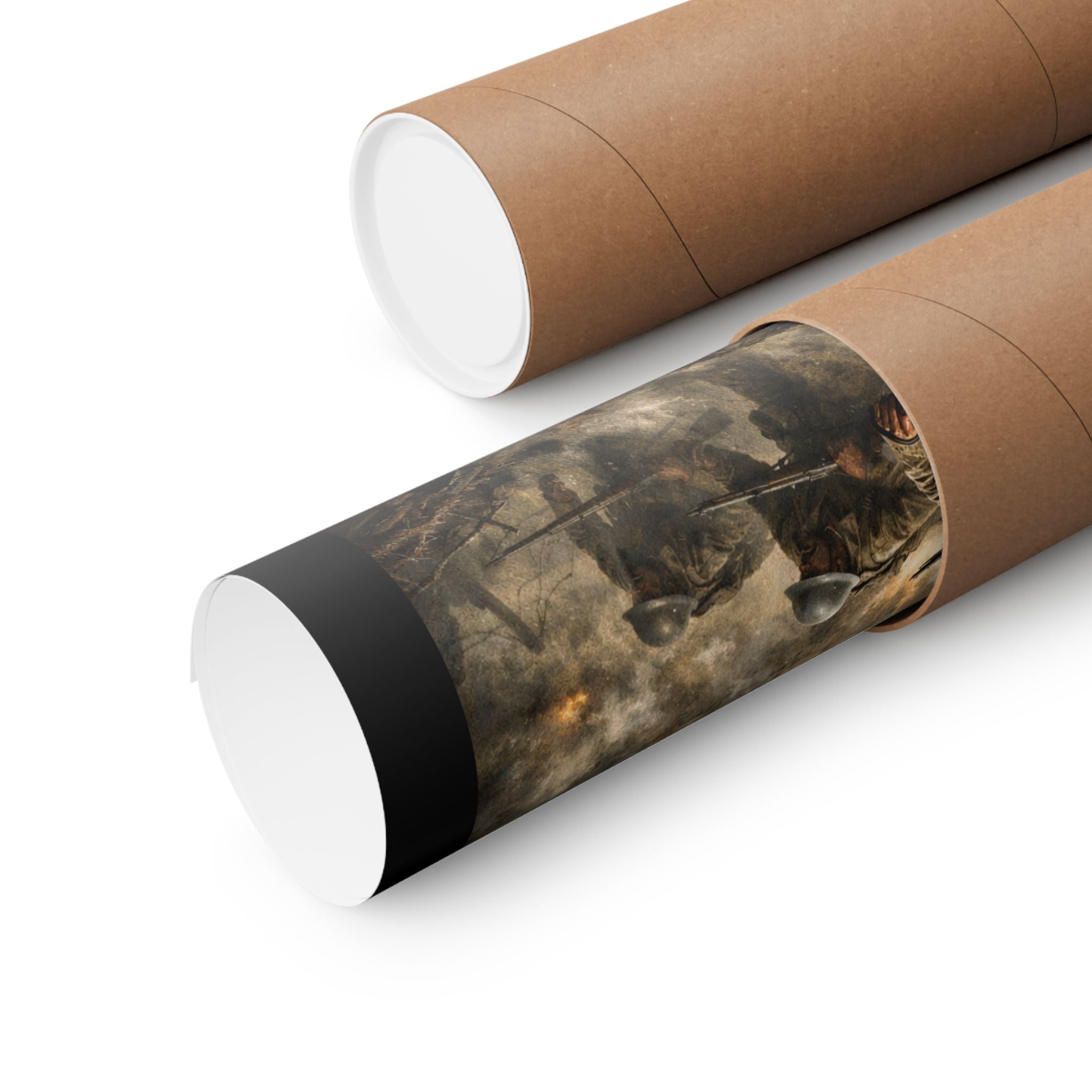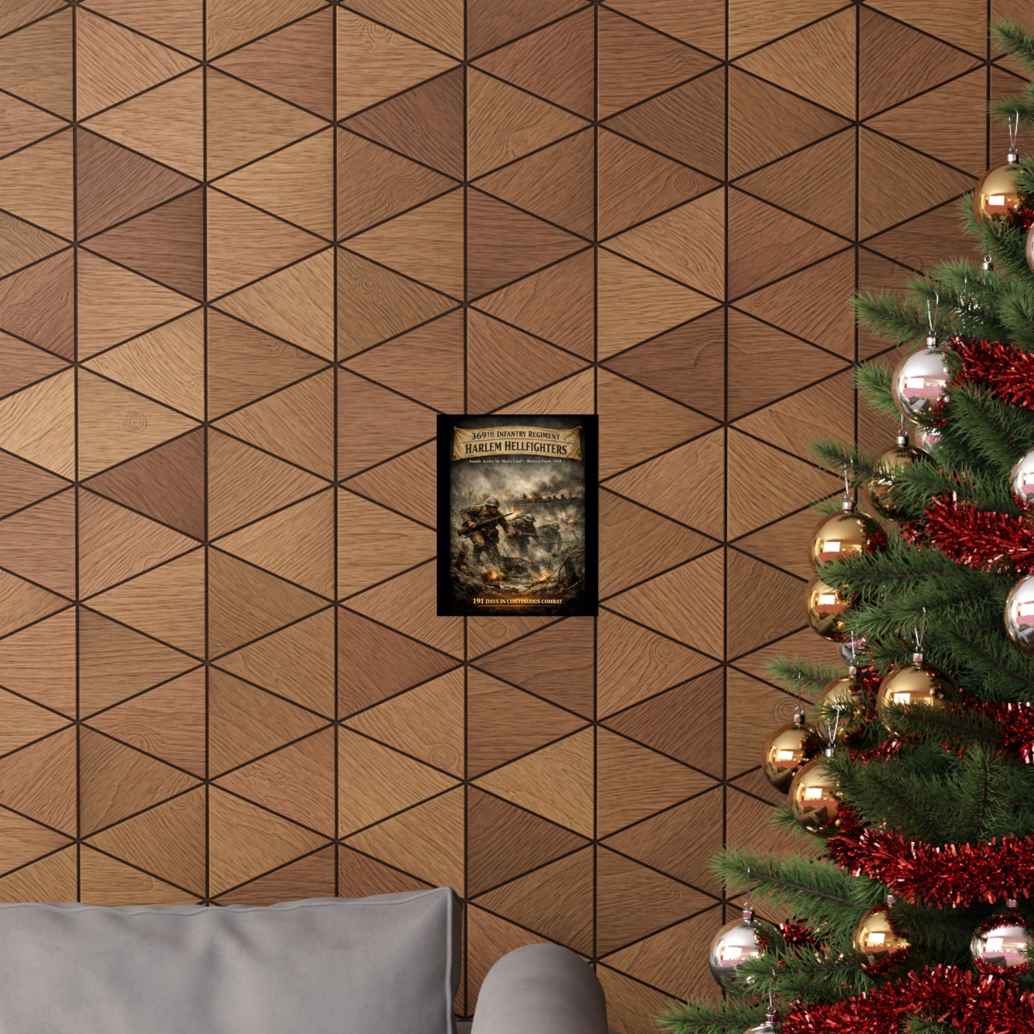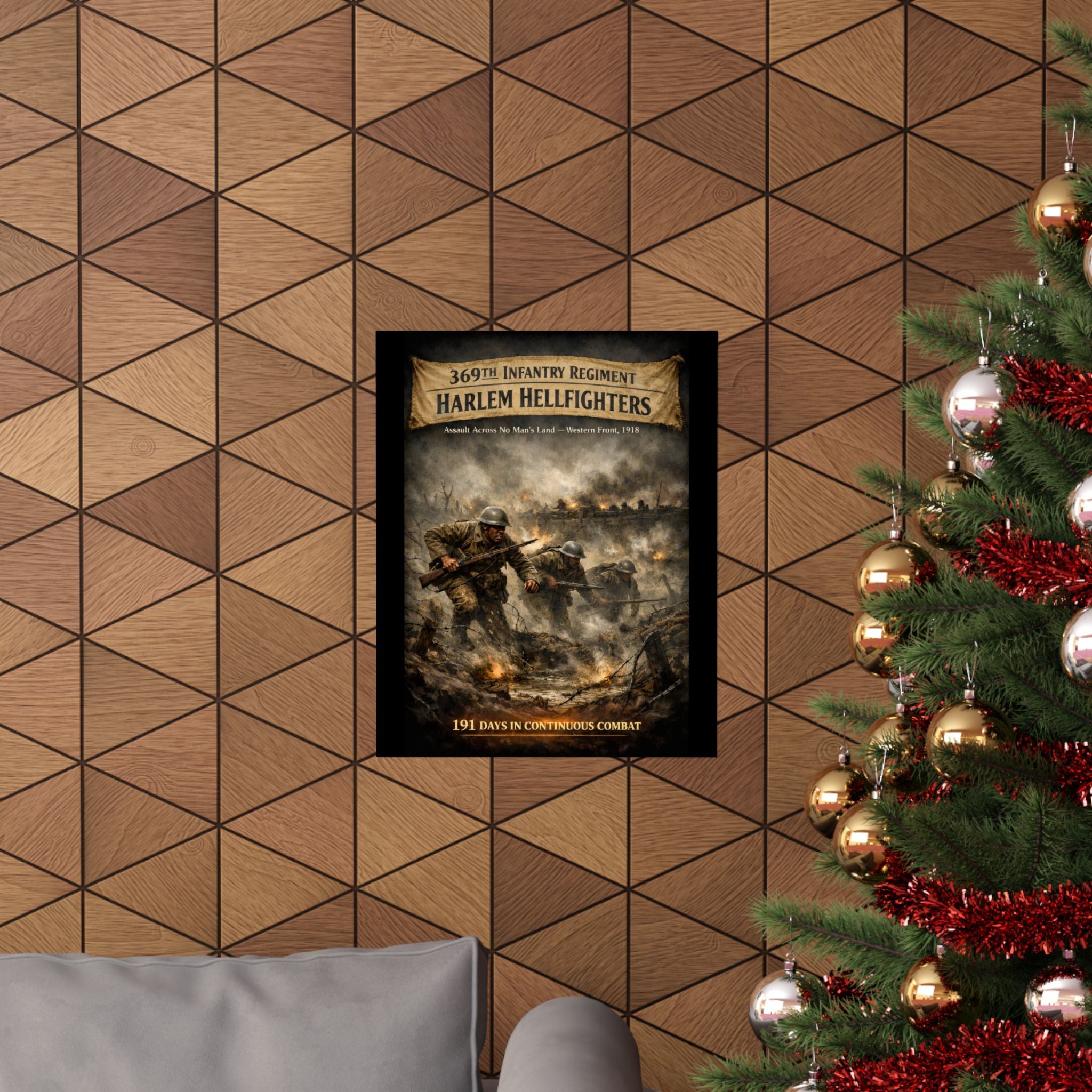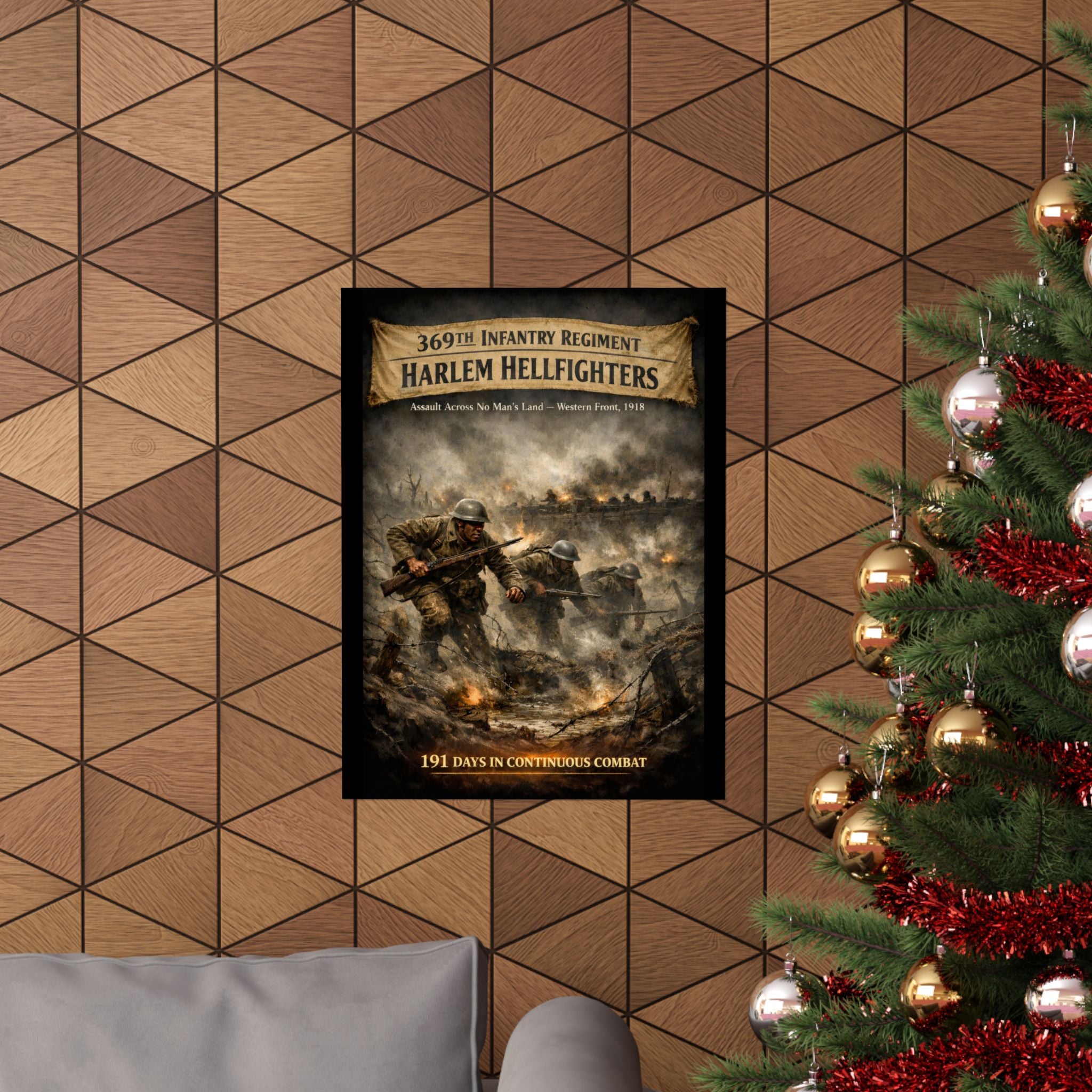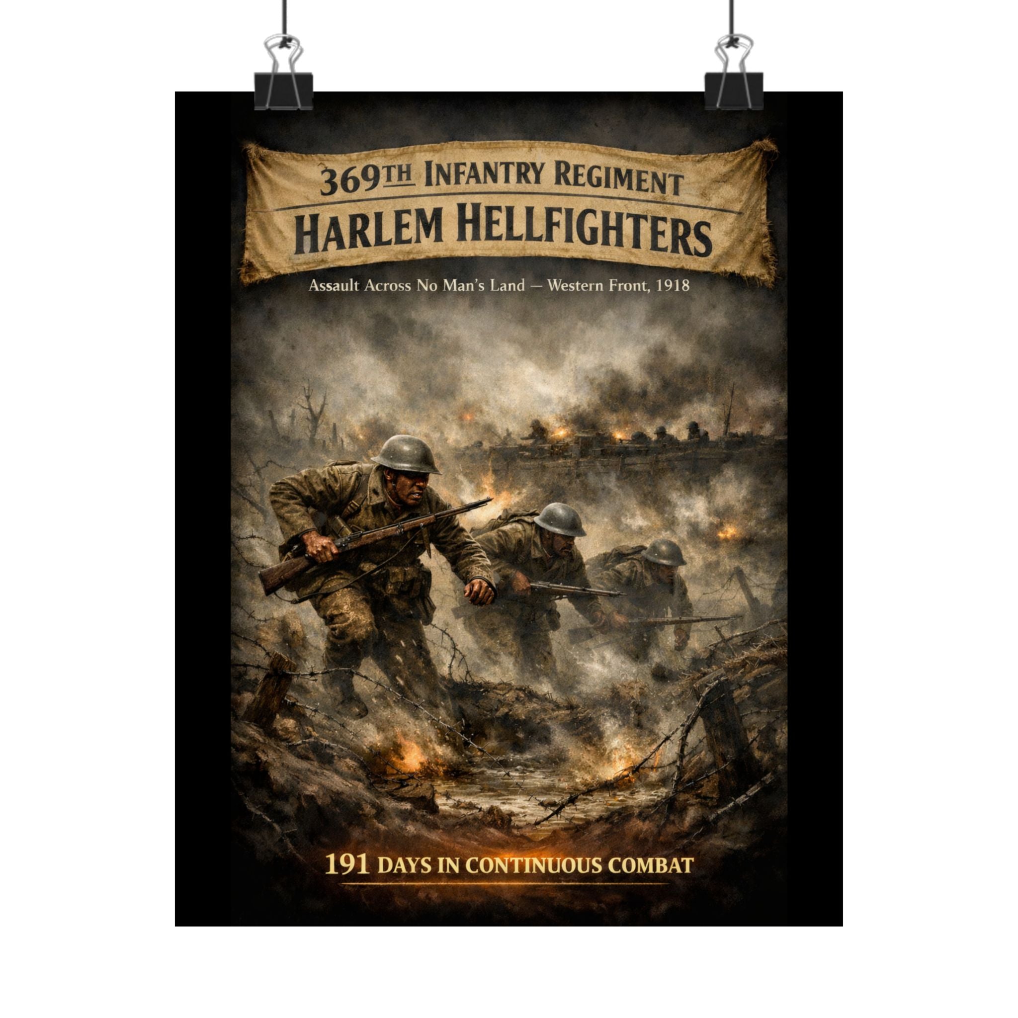 A matte vertical poster that honors the 369th Infantry Regiment's historic assault across No Man's Land during World War I. The scene carries a quiet, resolute energy — barbed wire and shell craters mark the landscape, boots and rifles press forward through the smoke, and the courage of a legendary unit is rendered with archival clarity. Hung on a study wall or above a reading chair, this poster pulls a corner of military history into daily life, inviting reflection and conversation. The muted, matte surface prevents glare so details stay visible under soft lighting. Printed on museum-grade paper with giclée inks, colors remain true over time so the moment stays as vivid as the memory it represents. Sized to fit a variety of frames, it's built for indoor display where its somber, respectful tone can be appreciated.