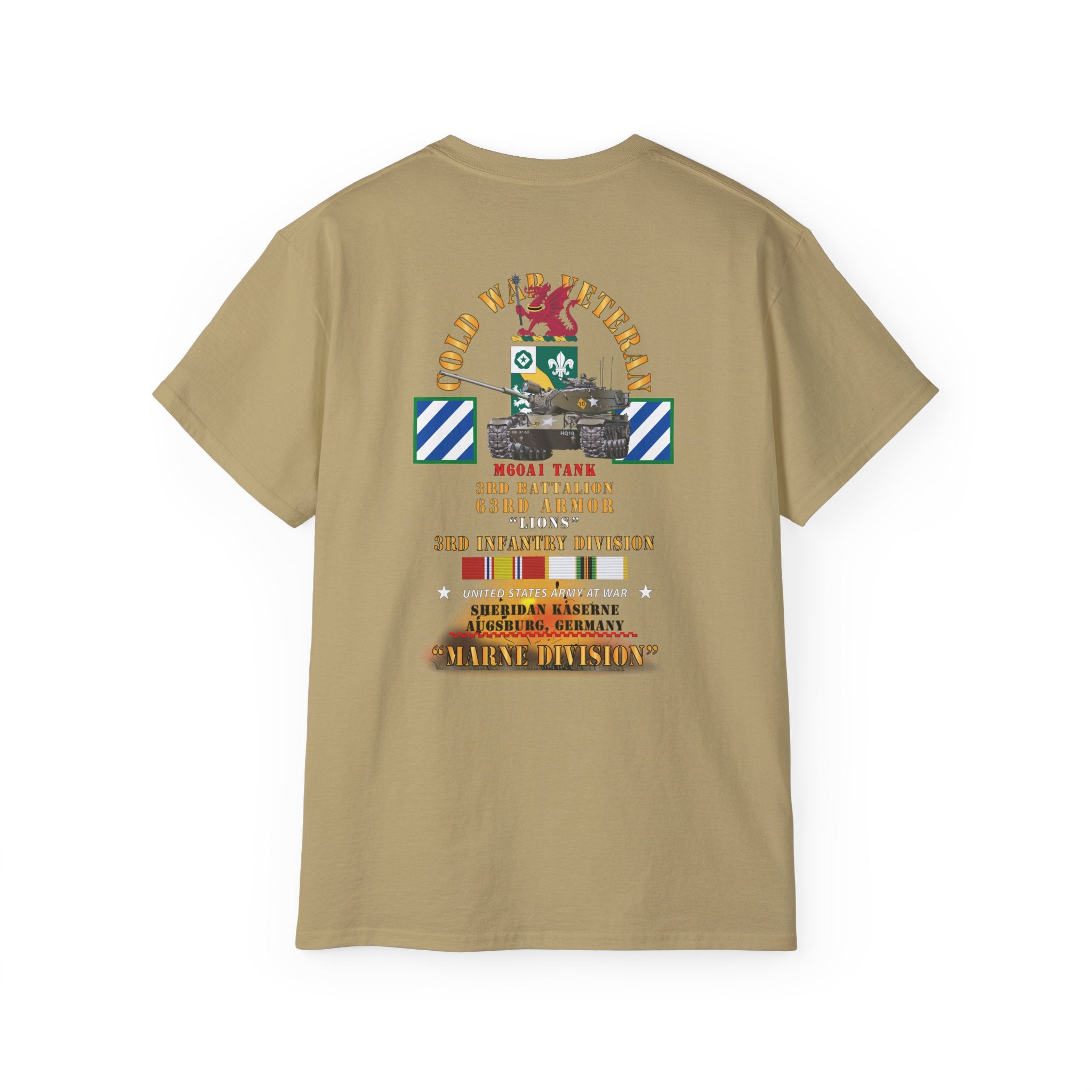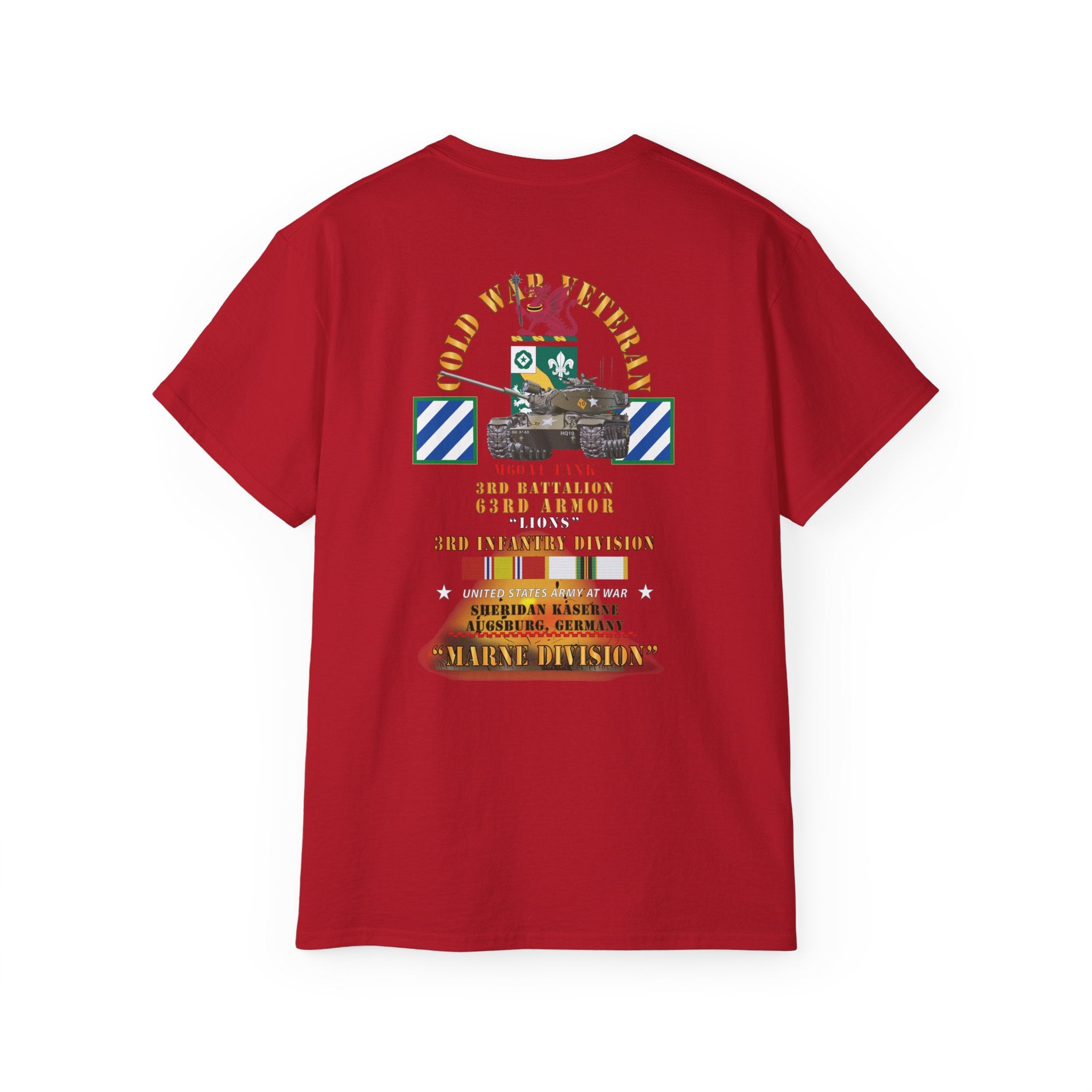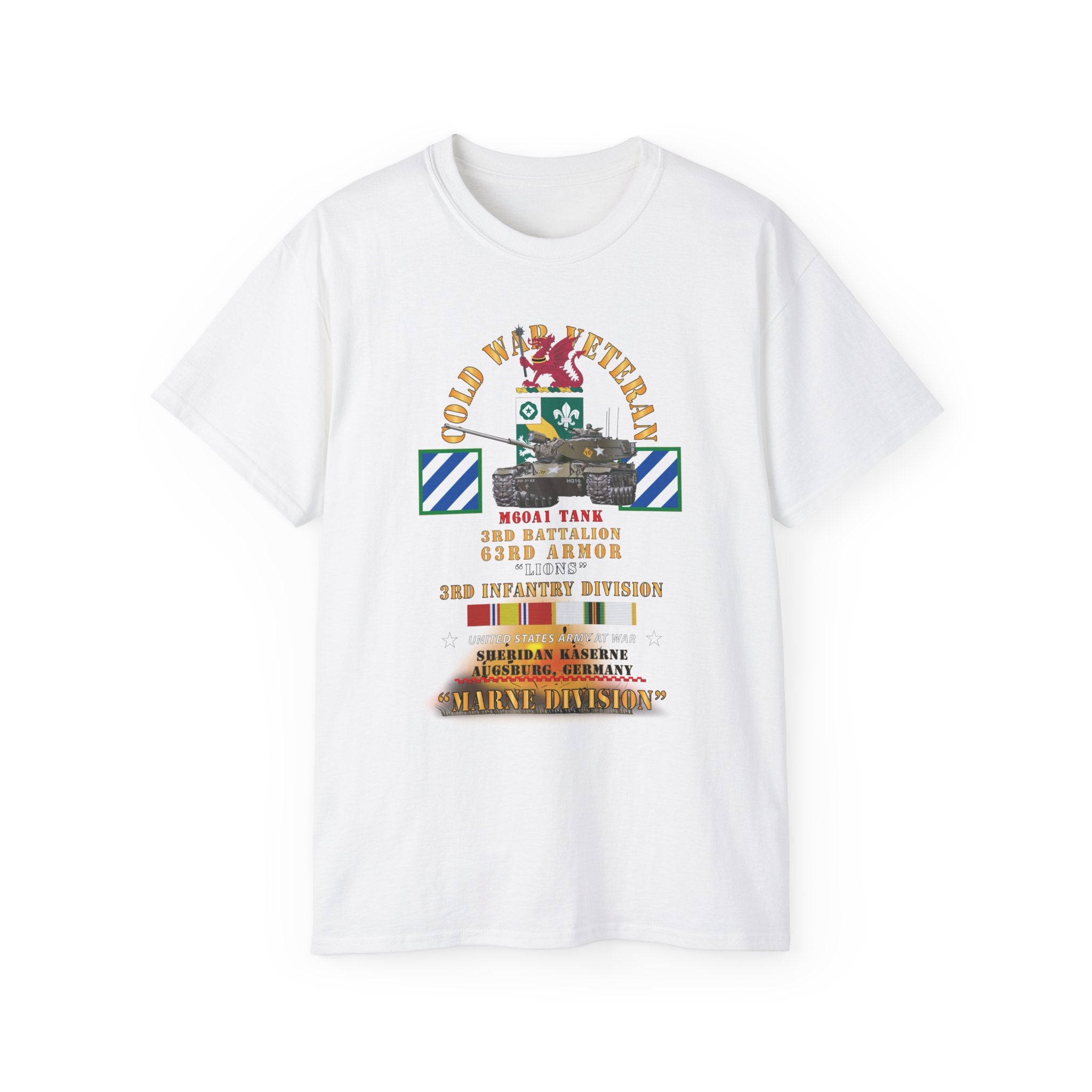 A lightweight, vintage-feel cotton tee printed with a bold military tribute design honoring the 3rd Infantry Division's WWII service. The front and back artwork layer authentic regimental insignia, campaign ribbons, and unit text in a distressed palette that reads like a veteran's chest of honors—each element carefully researched to reflect the Division's storied campaigns from North Africa to the heart of Europe.