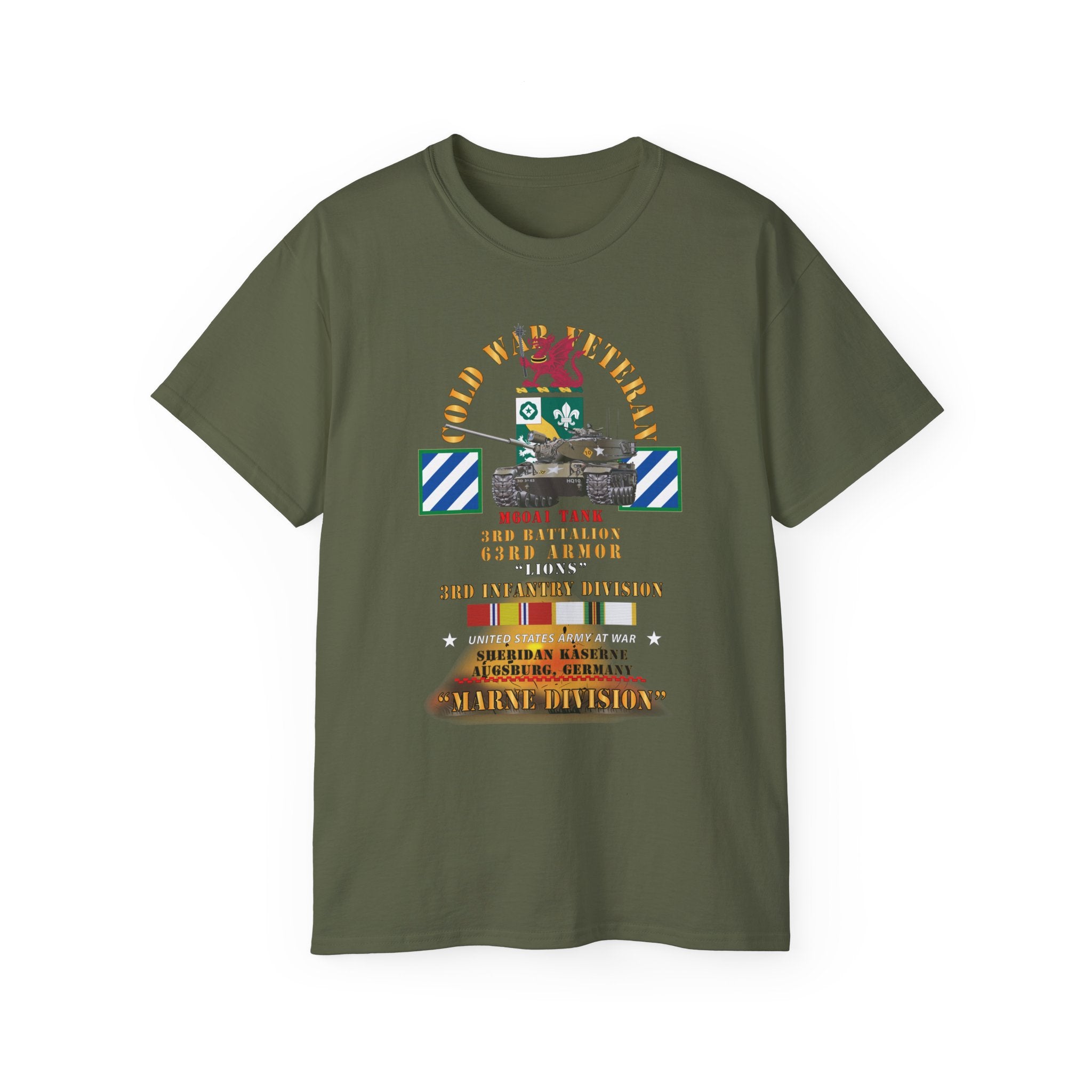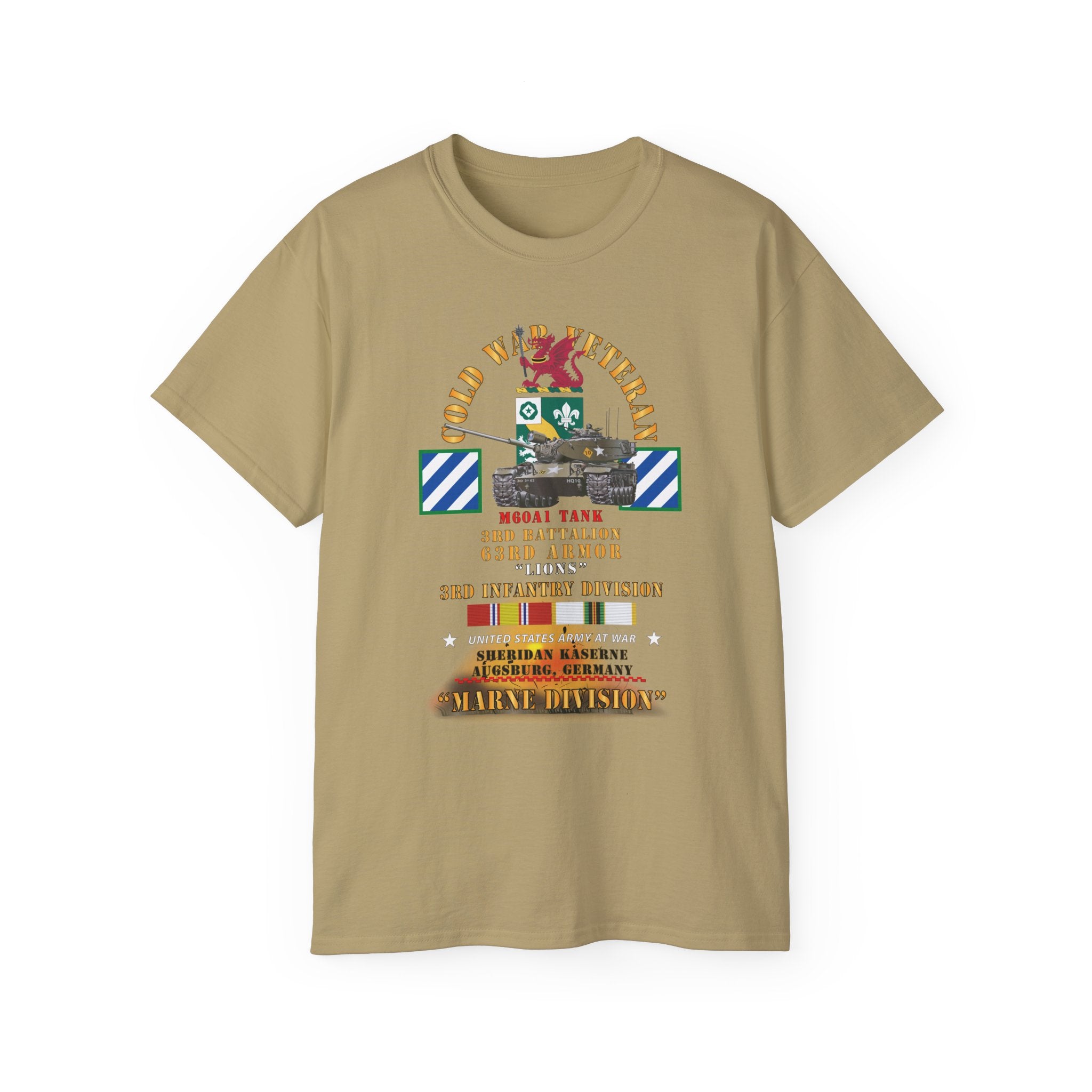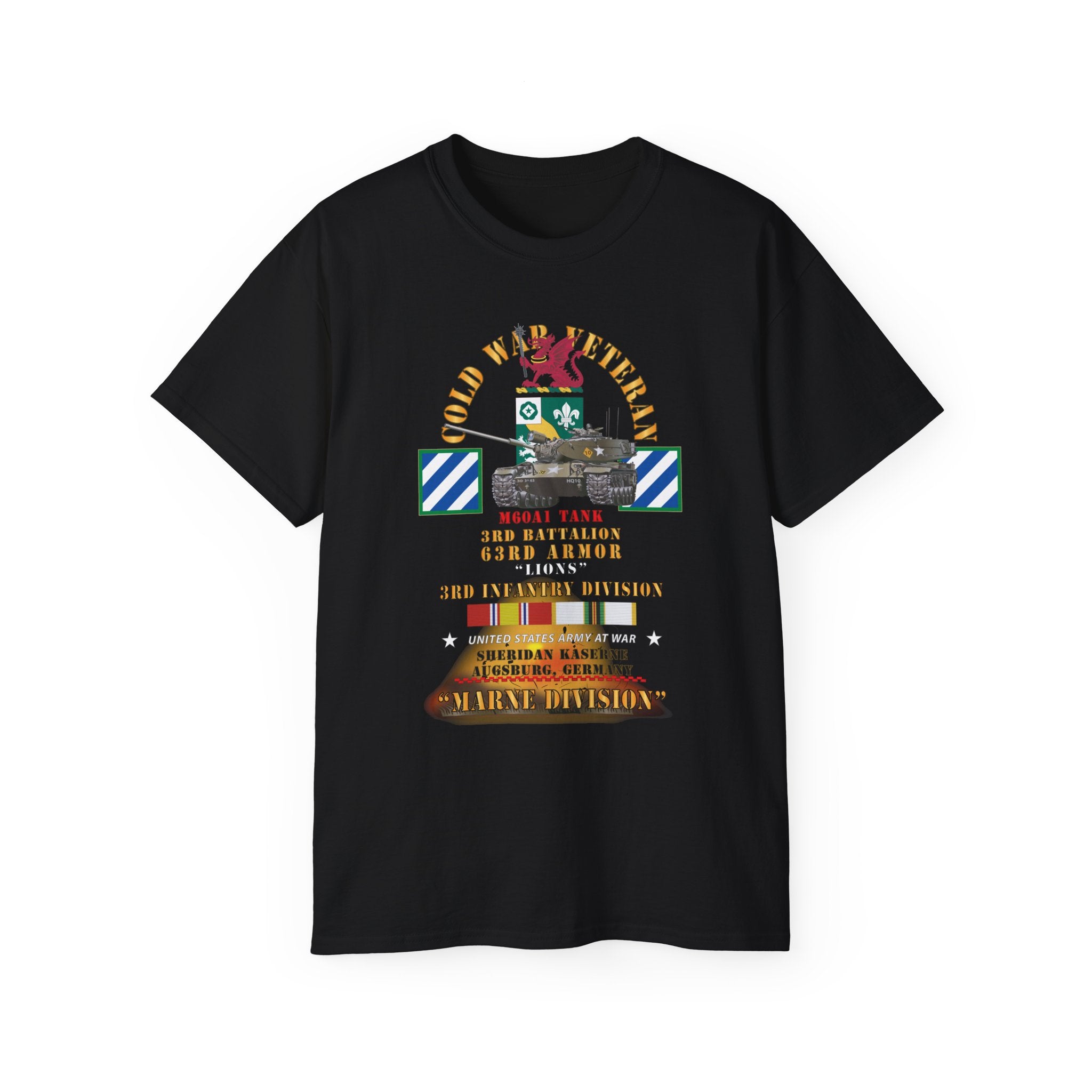 A lightweight, vintage-feel cotton tee printed with a bold military tribute design honoring the 3rd Infantry Division's WWII service. The front and back artwork layer authentic regimental insignia, campaign ribbons, and unit text in a distressed palette that reads like a veteran's chest of honors—each element carefully researched to reflect the Division's storied campaigns from North Africa to the heart of Europe.