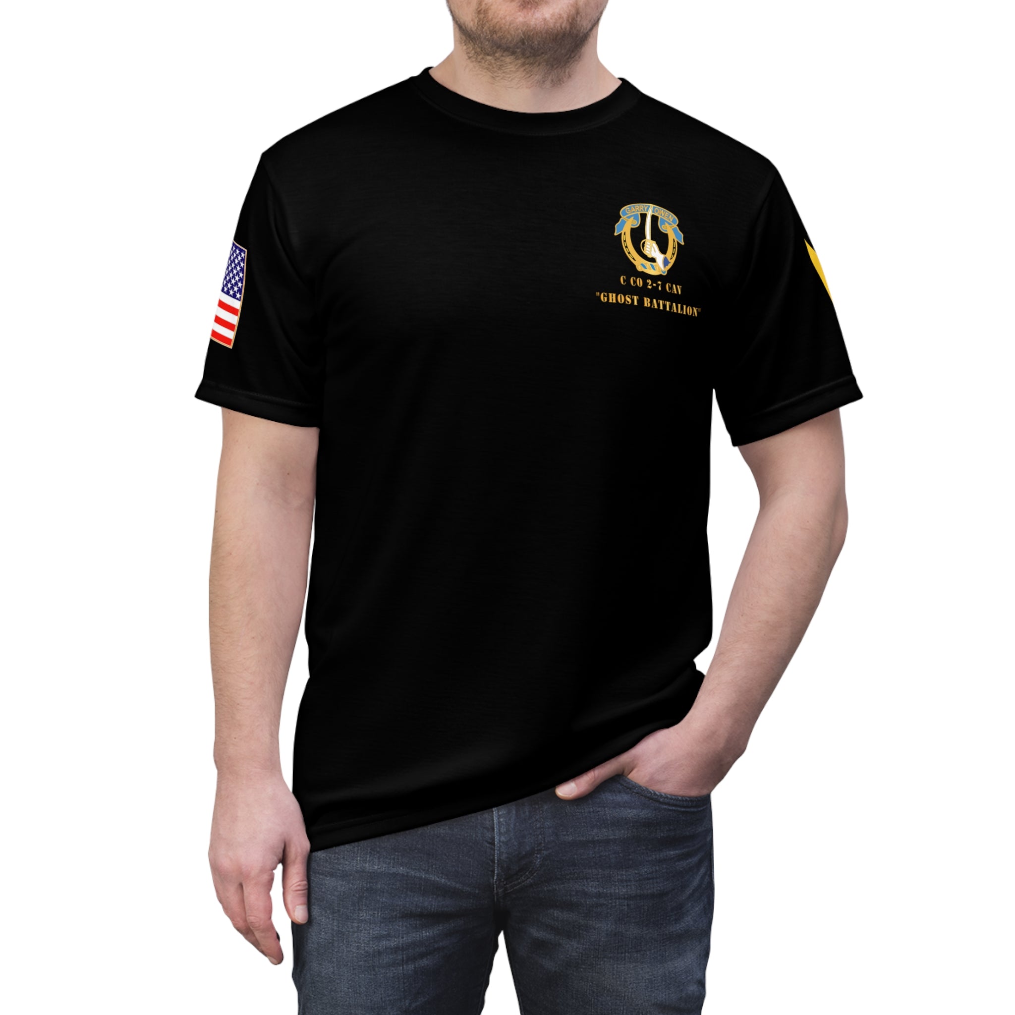 This Tee features an all-over print of the Army - C Co 2nd Bn 7th Cavalry Regiment - Ghost Battalion design. Made of 100% Polyester, it is strong, durable, and dries quickly. With side seams, ribbed knit collar with seam, and shoulder tape for added structure and support. Perfect for those who support military troops, veterans, or history enthusiasts. Ideal for Memorial Day, Veterans Day, or as a gift for someone in the military.