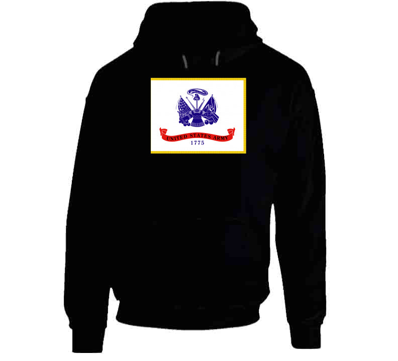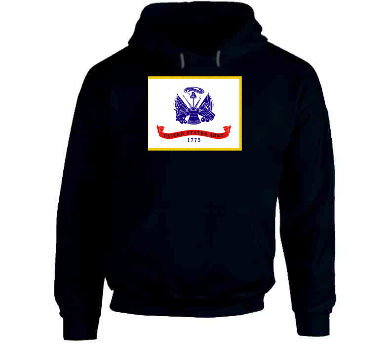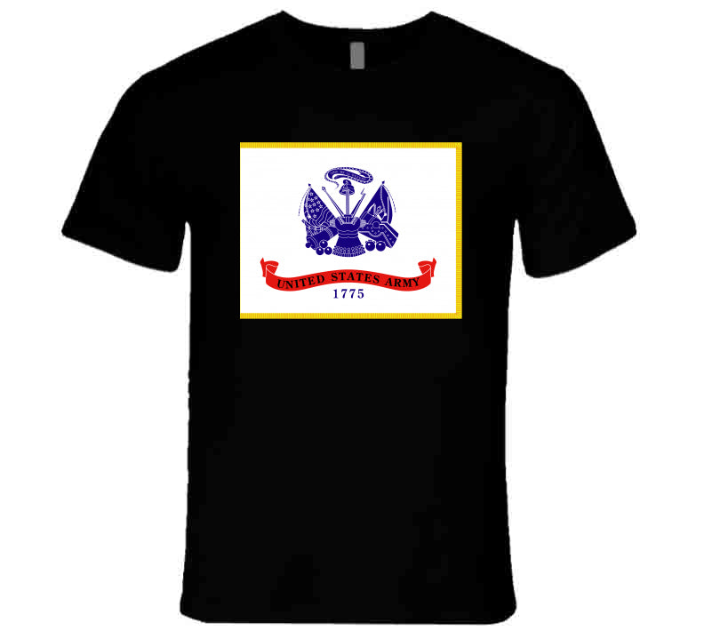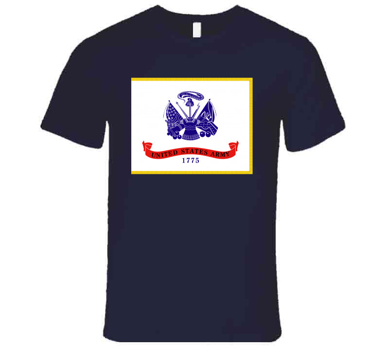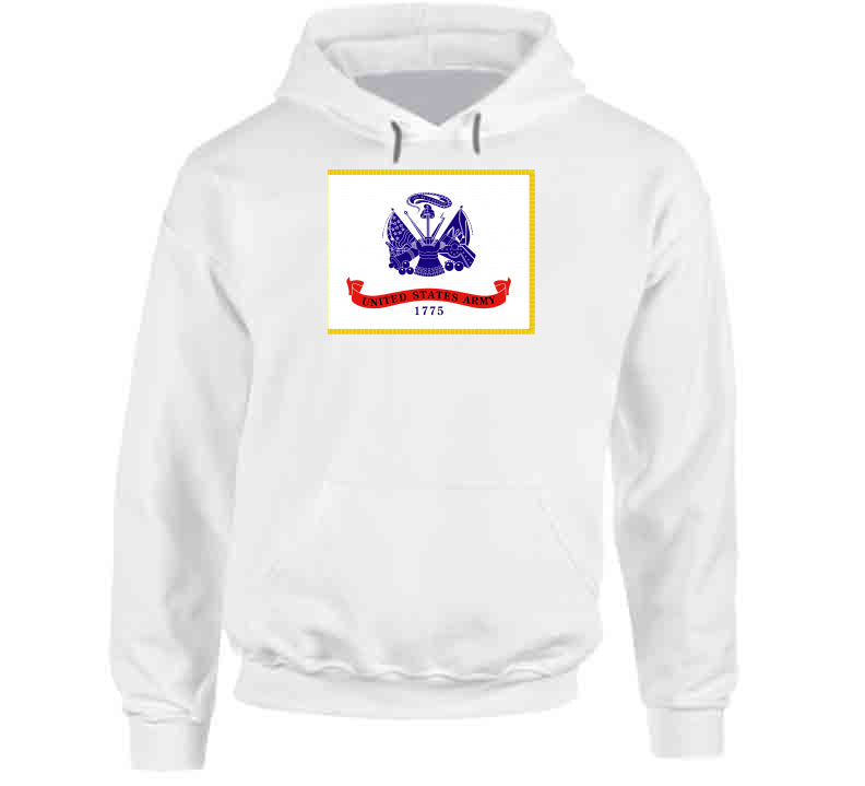 The flag of the United States Army displays a blue replica of the War Office Seal set on a white field. Beneath the seal is a broad scarlet scroll bearing the inscription in white letters, "United States Army". Beneath the scroll, in blue Hindu-Arabic numerals, is "1775", the year in which the Continental Army was created with the appointment of General George Washington as General of the Army. All of this is on a white background.